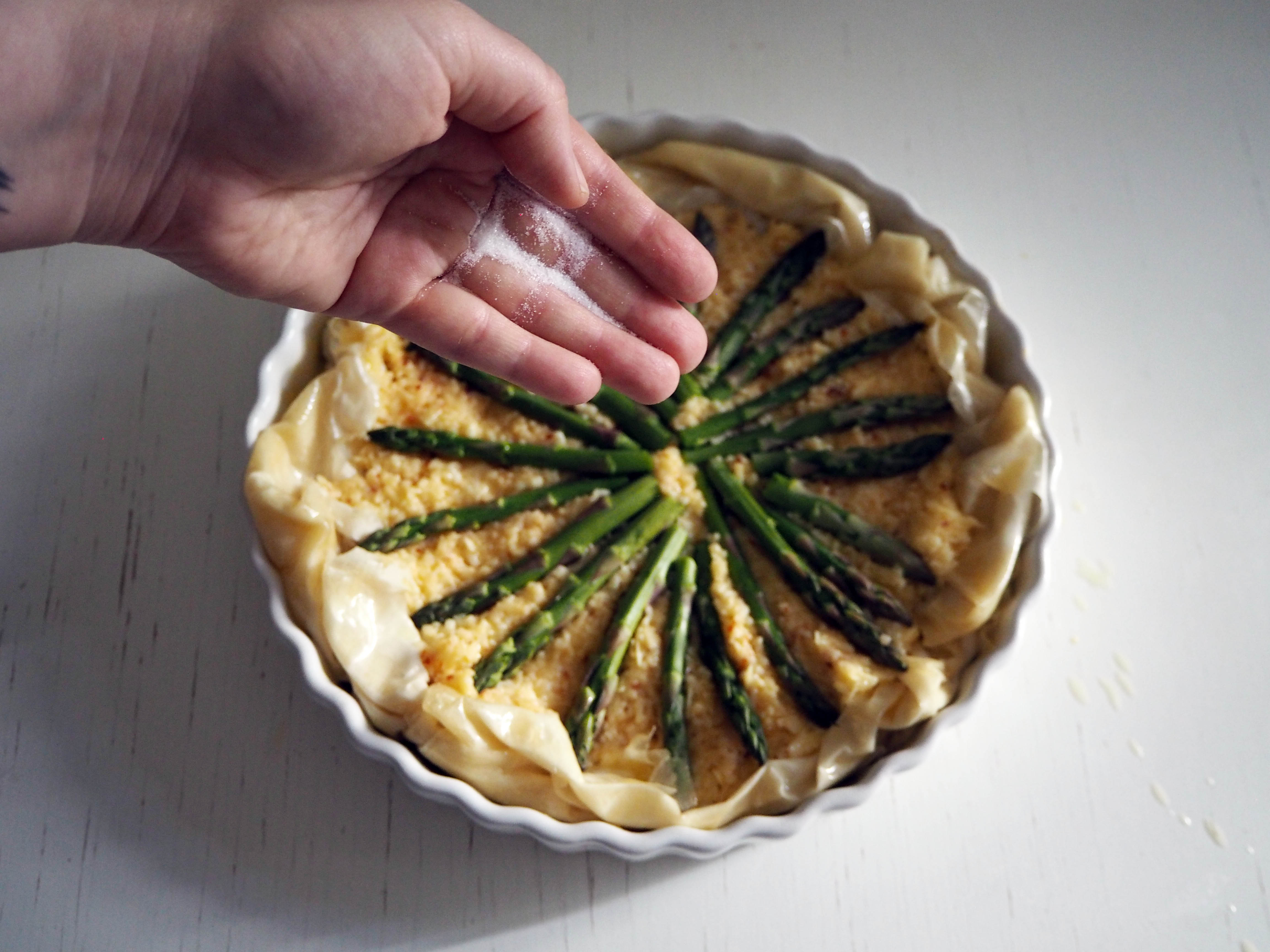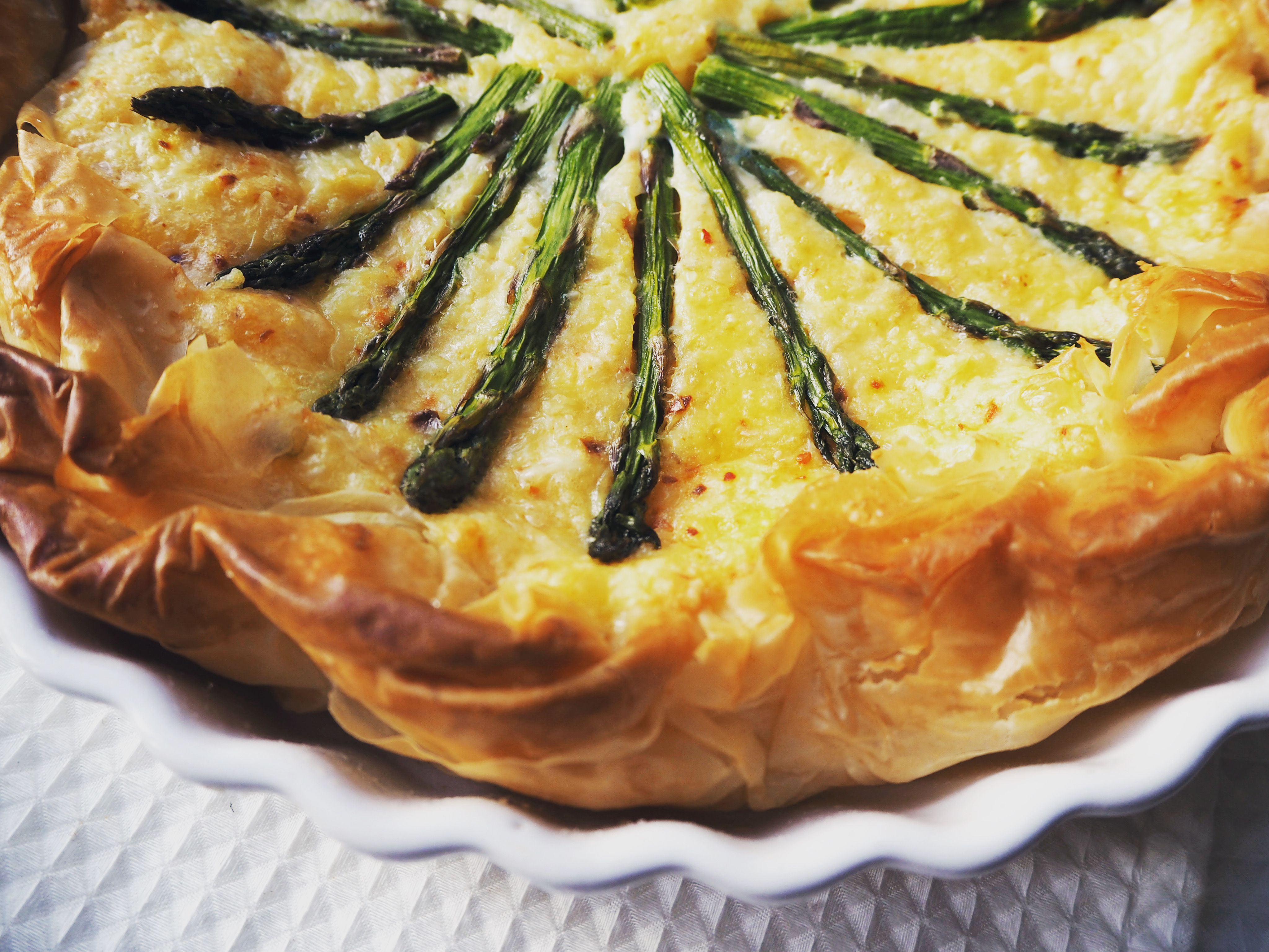 8. Brush the edges of phyllo crust with remaining melted butter. Sprinkle a pinch of salt on the filling and drizzle a little olive oil. Put in the middle of the oven and bake for about 30 minutes, until the crust is golden brown and the asparagus is roasted enough. Let the pie cool in the dish for about half an hour, and then you can cut and serve. Enjoy!