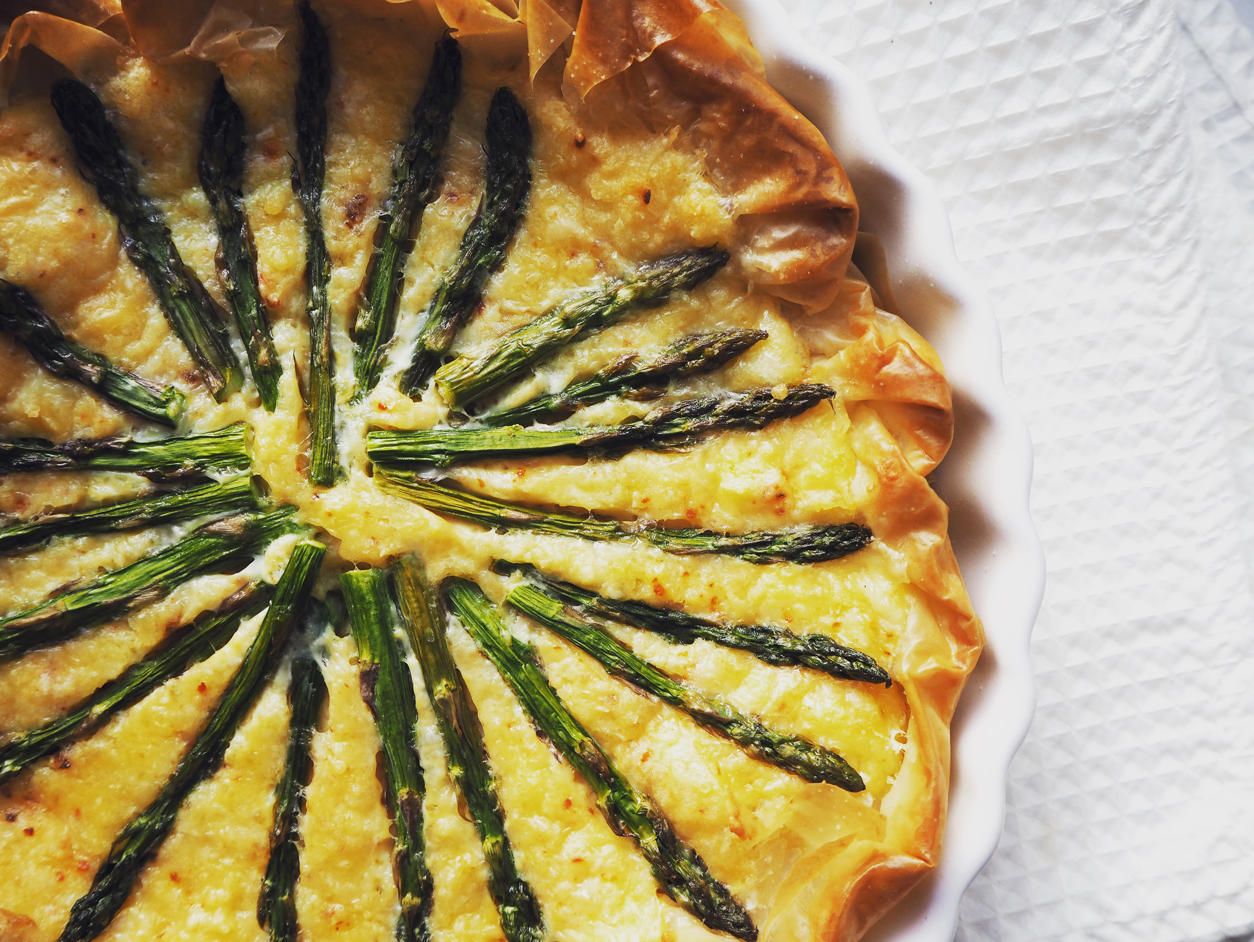 A cheesy asparagus pie is not a brand new idea; there are many versions of it if you google. A few of them even use phyllo. However, mostly those pies are rectangular, so I decided to make a round pie in this recipe.