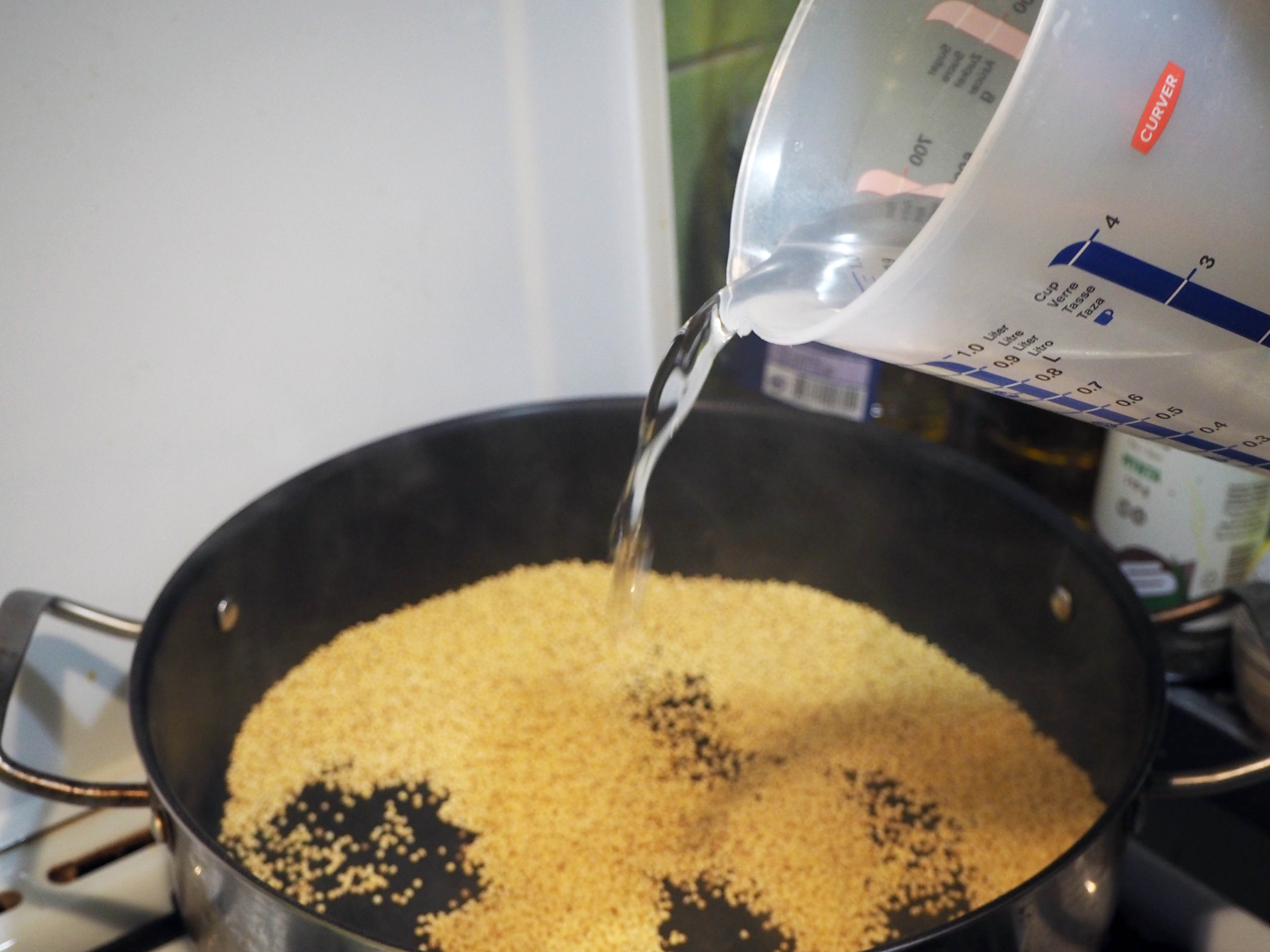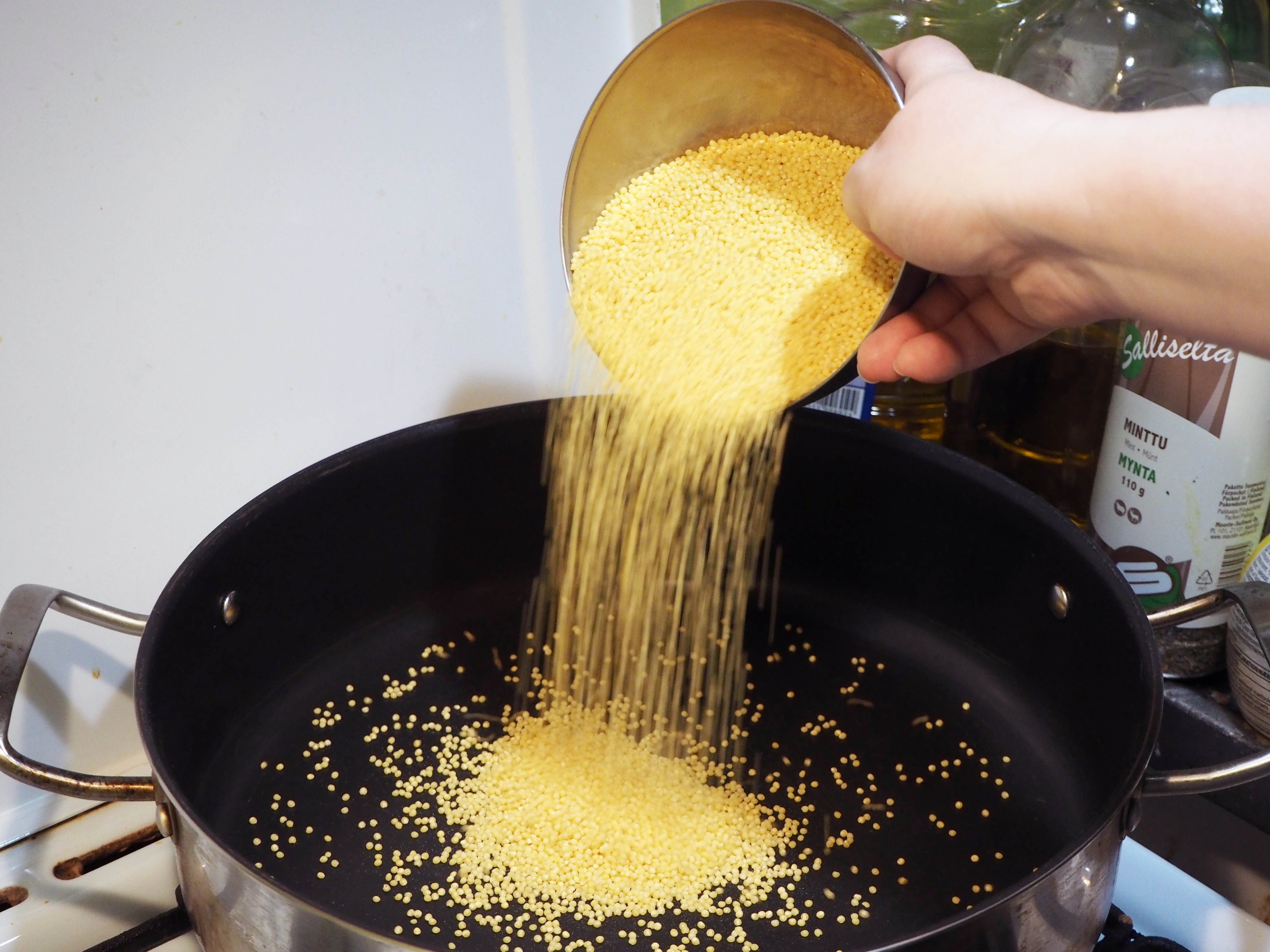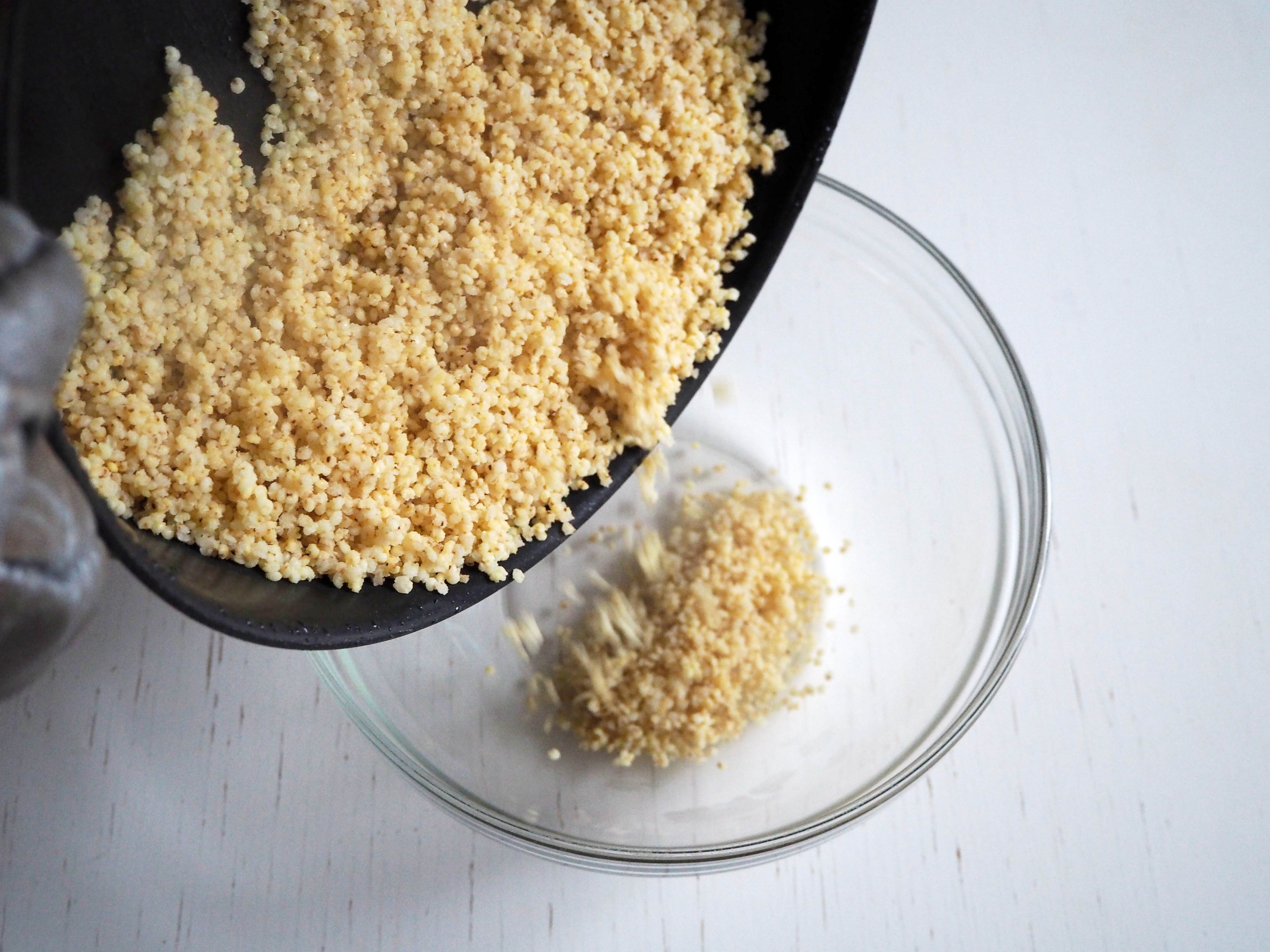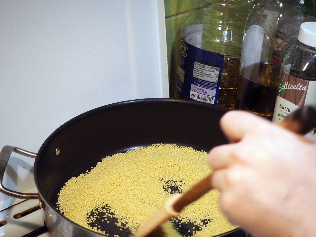 - Put a large pot on medium-high heat and toast the millet in the pot for about 5 minutes until it gets browned and has a nutty smell.