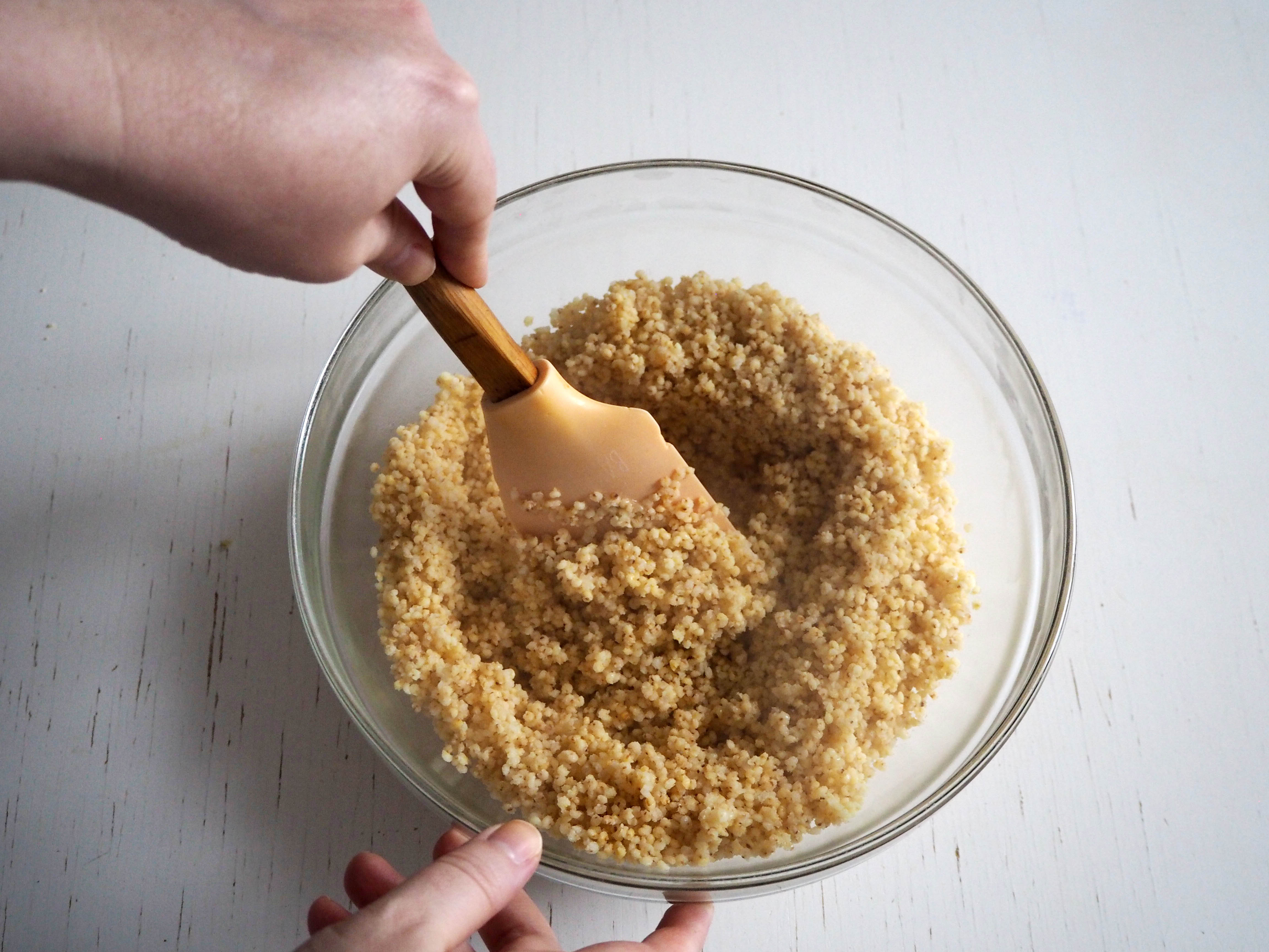 3. When the millet is ready, transfer it to a salad bowl and add 1 tbsp olive oil. Mix well, put aside.
