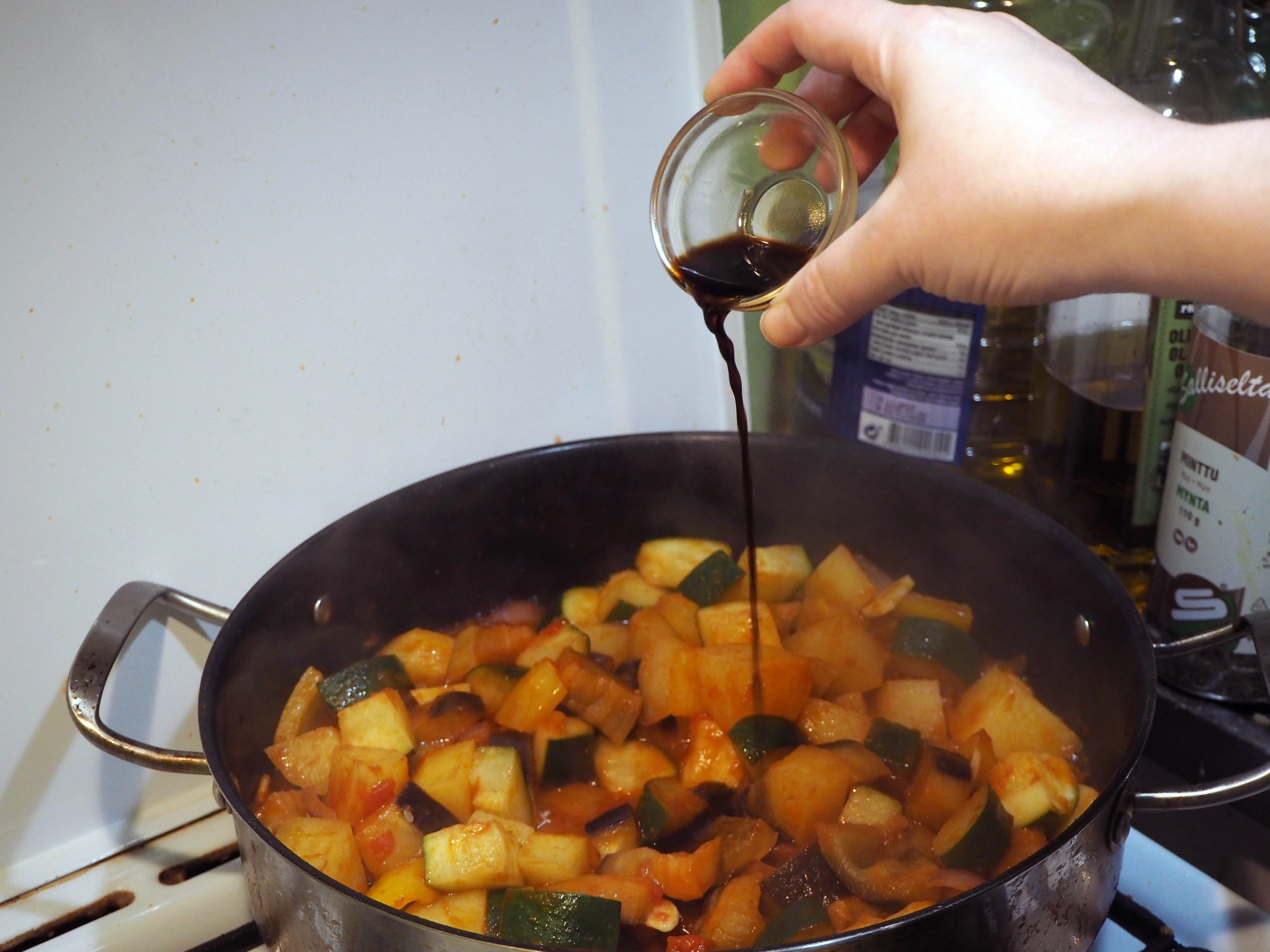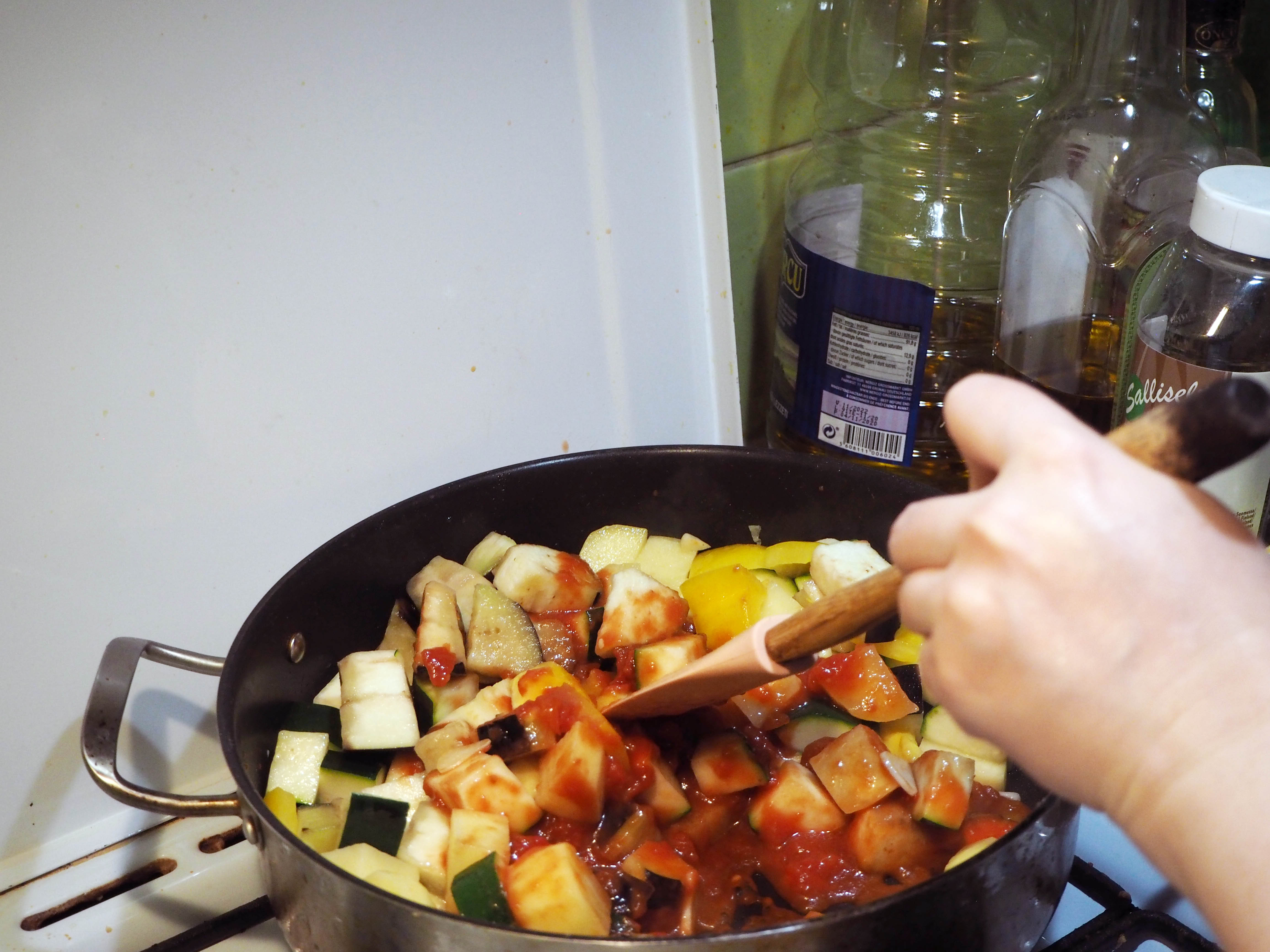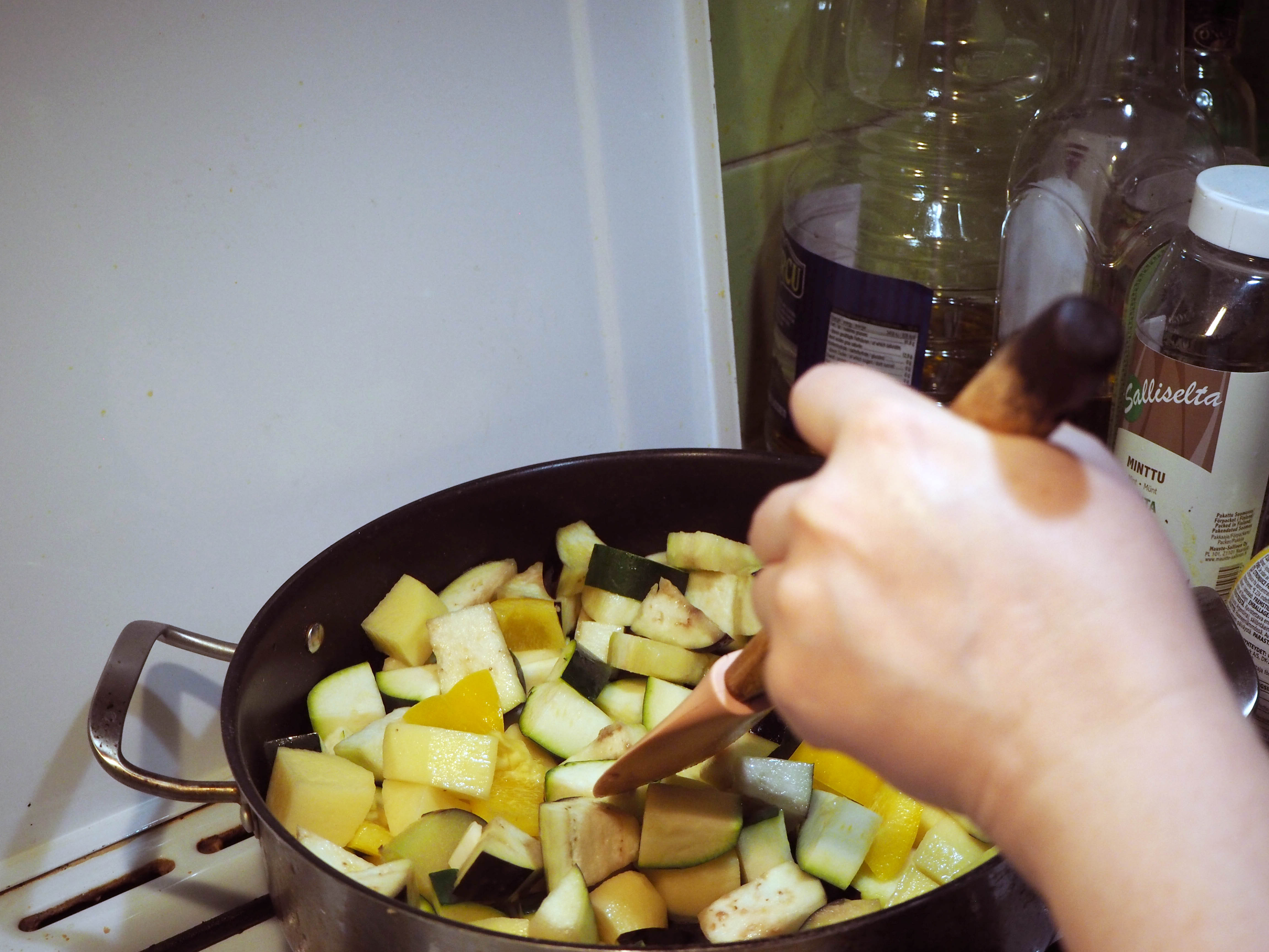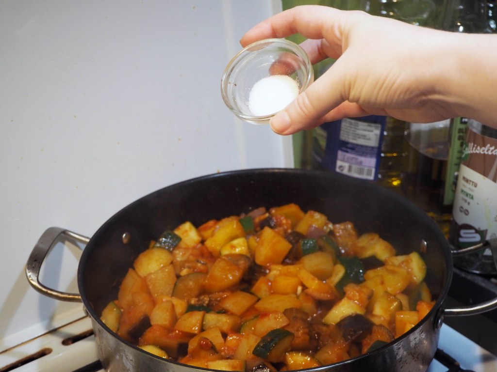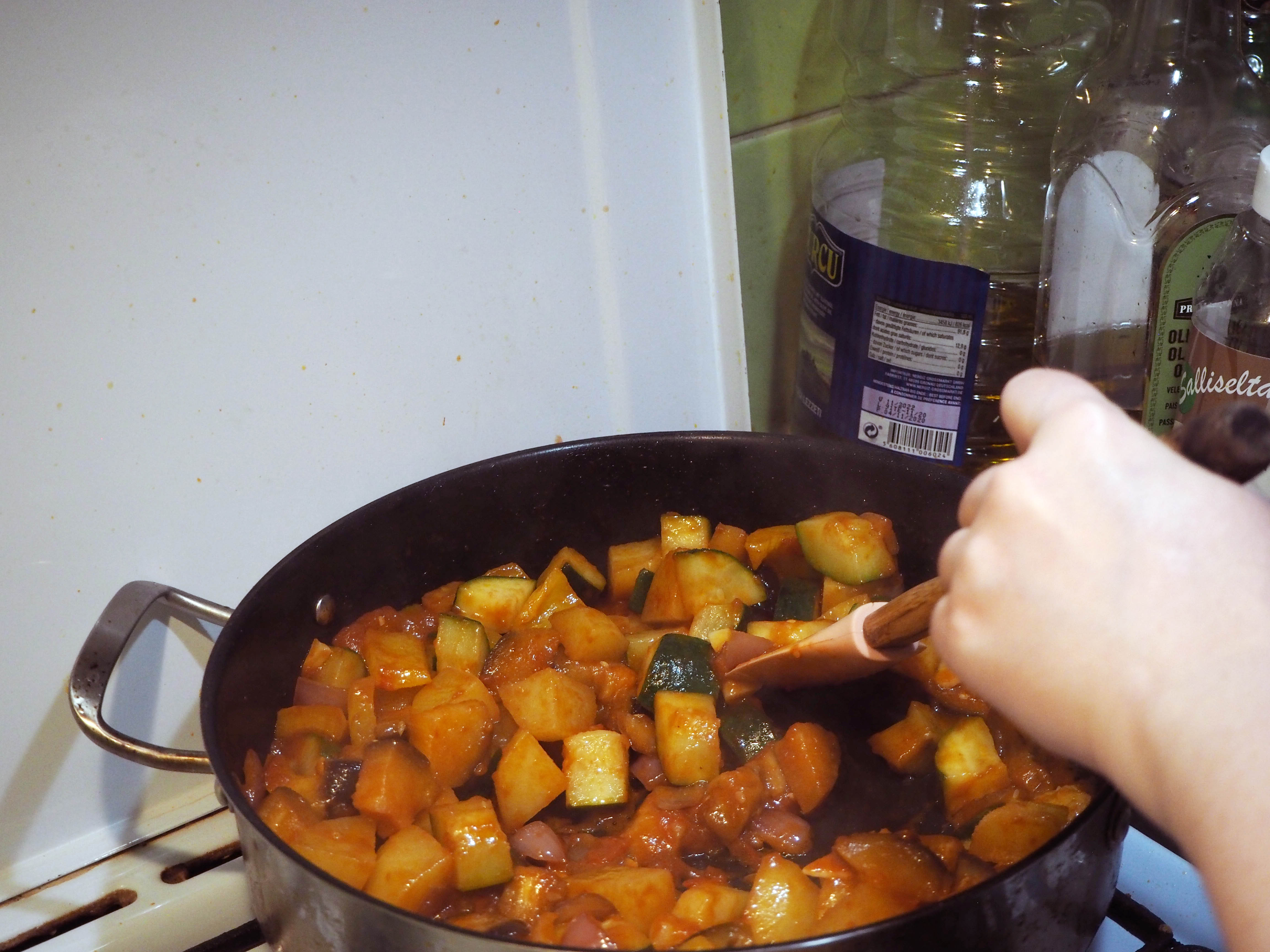 5. When the onion starts browning on the edges, add the veggies: aubergine, courgette, bell pepper, potatoes and garlic and saute for about 3 minutes, then cover the pot, reduce the heat to medium and cook for about 5 minutes.