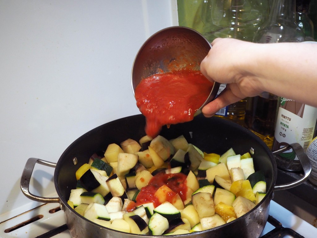 6. After 5 minutes, add tomato puree, stir and continue to cook covered for 3-4 more minutes.
