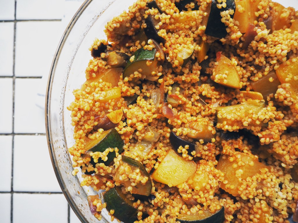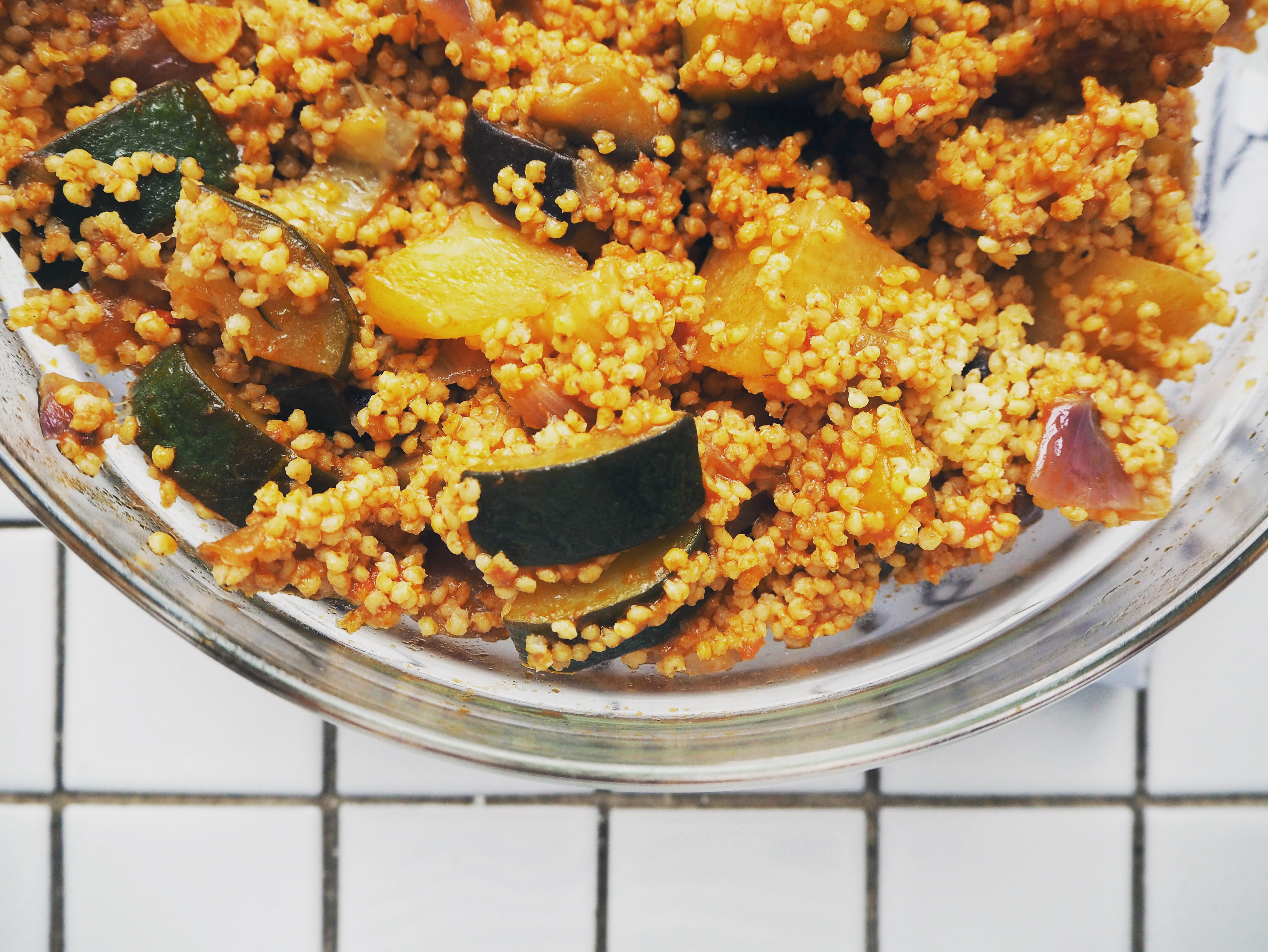 8. Add cooked vegetables to the millet and mix well. Serve warm. Enjoy the leftovers warmed again or at room temperature.