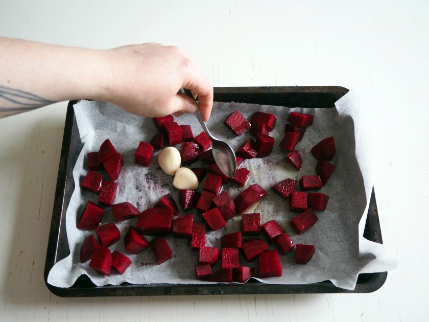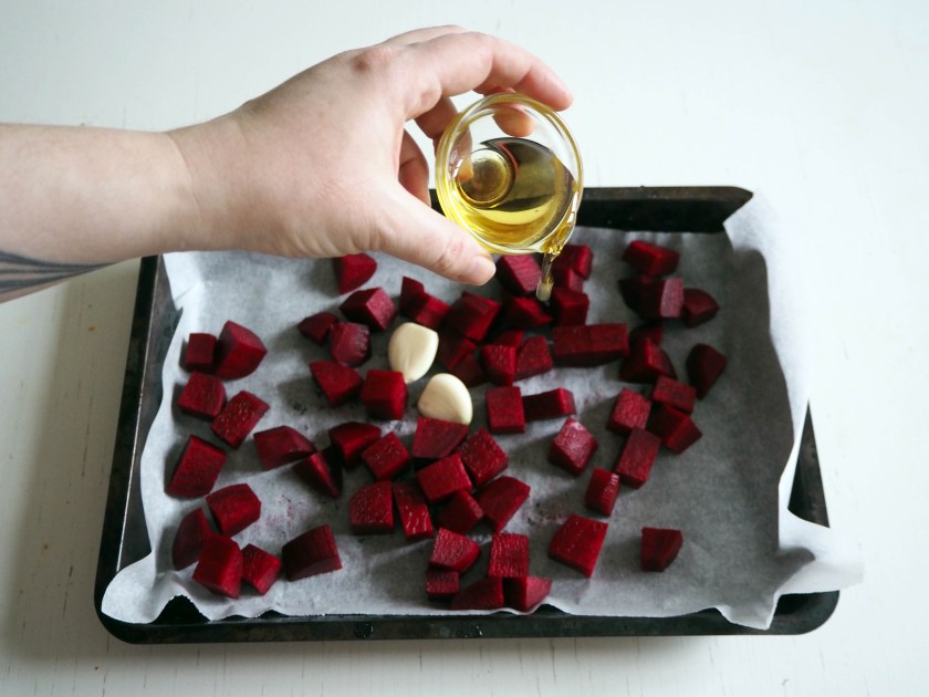 - Put diced beetroot and garlic cloves on the tray. Drizzle 1 tbsp olive oil and give it a good mix. Put in the medium part of the oven and roast for about 35-40 minutes until beetroots are very tender. Take out of the oven and let it cool for about 10 minutes.