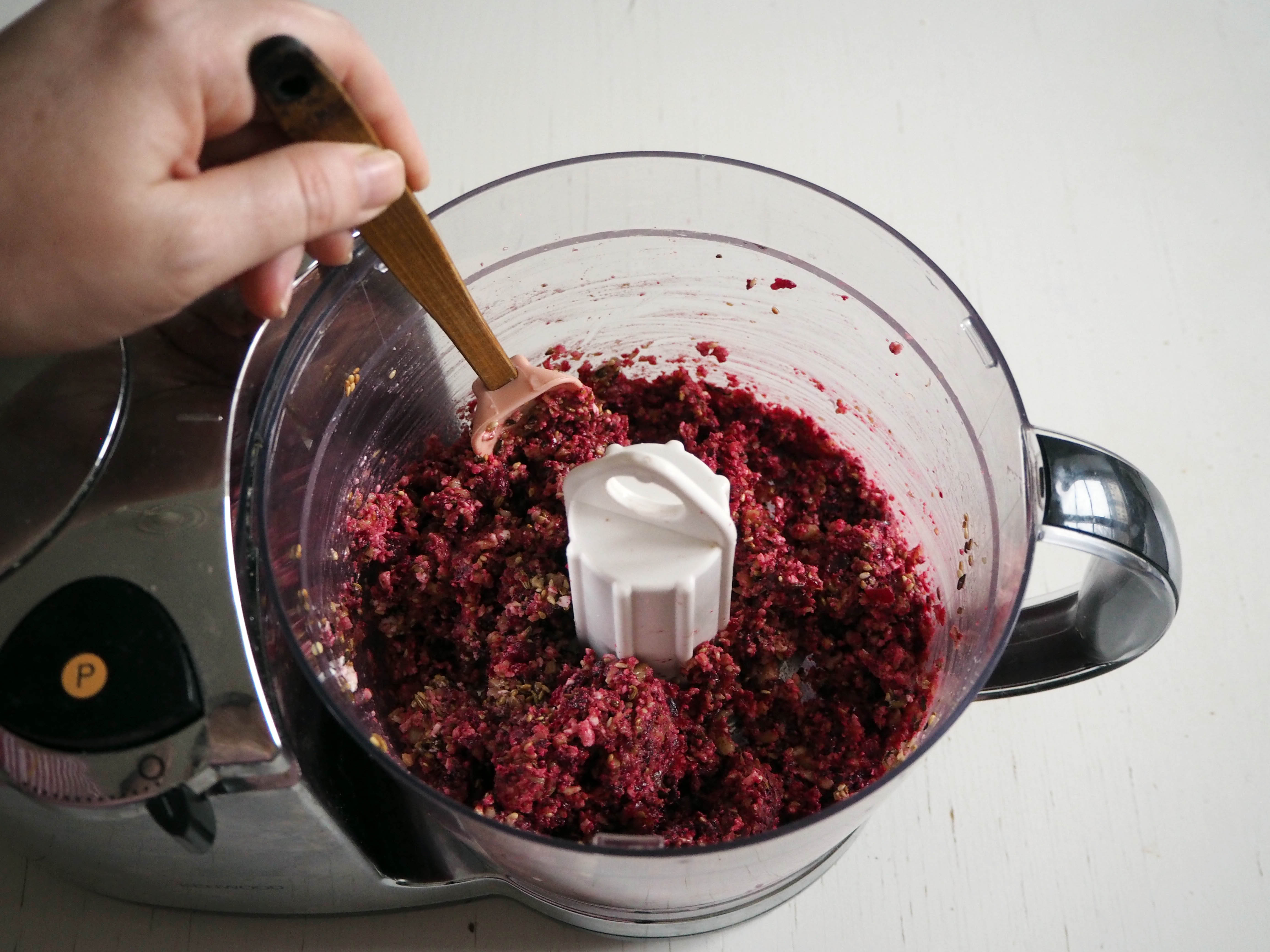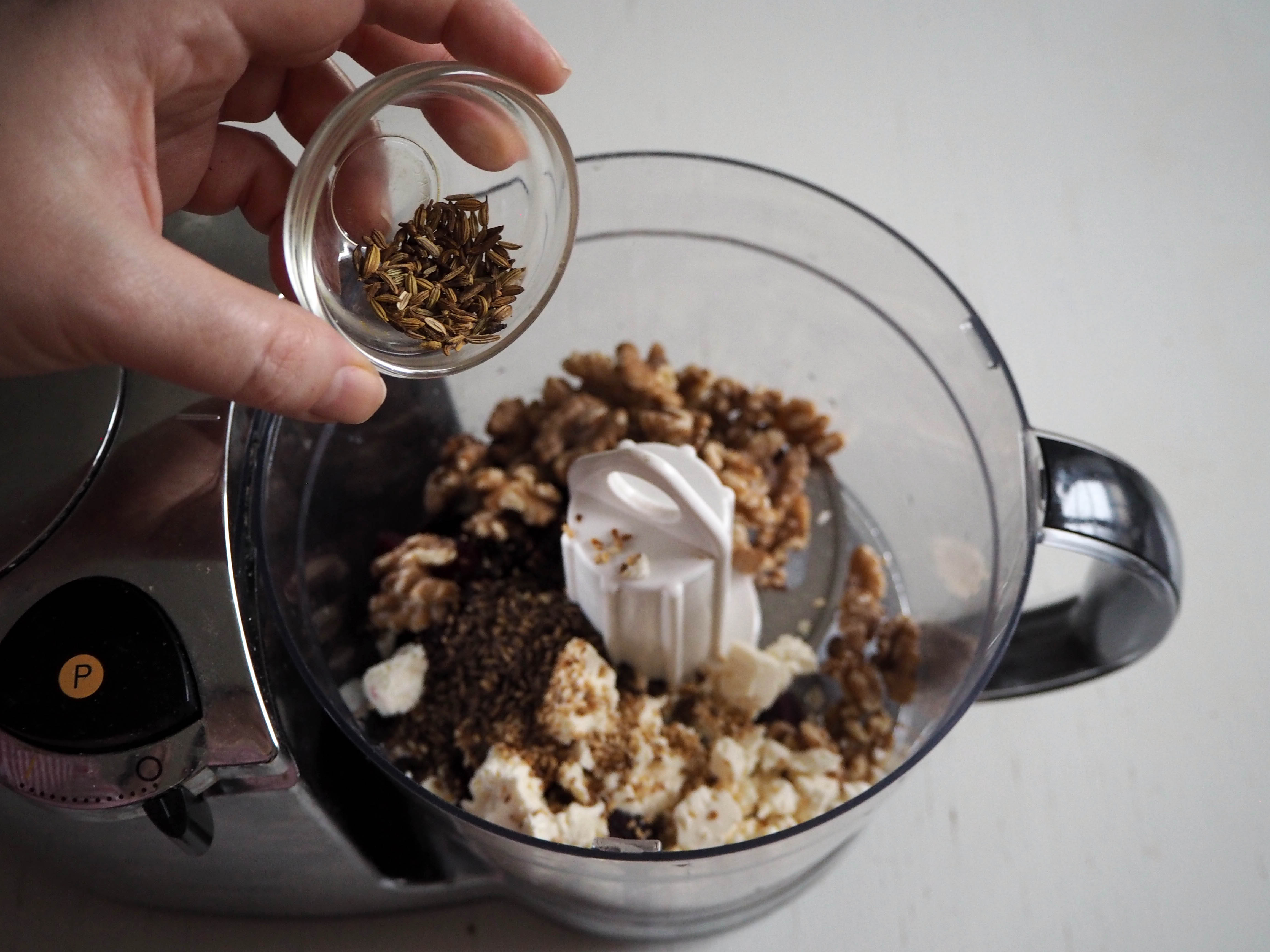 3. Put roasted beetroot and garlic and all the rest of the ingredients except for salt in a food processor and make a nice smooth paste.