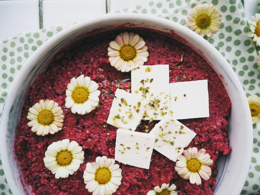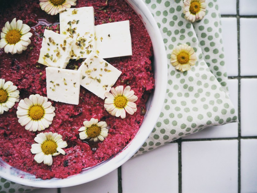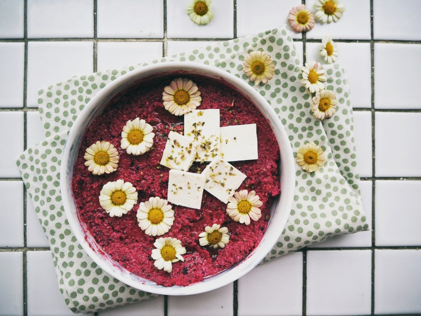 Anyway, back to the recipe. It is pretty straightforward. As I wrote above, you only need to roast the beetroot and garlic for about 35-40 minutes and then put everything in a food processor. Seriously, it can’t get easier than that. After that, decorate it in any way you like. I happened to find some beautiful edible flowers on the weekend that I prepared the recipe, so I used them. Enjoy your new recipe!