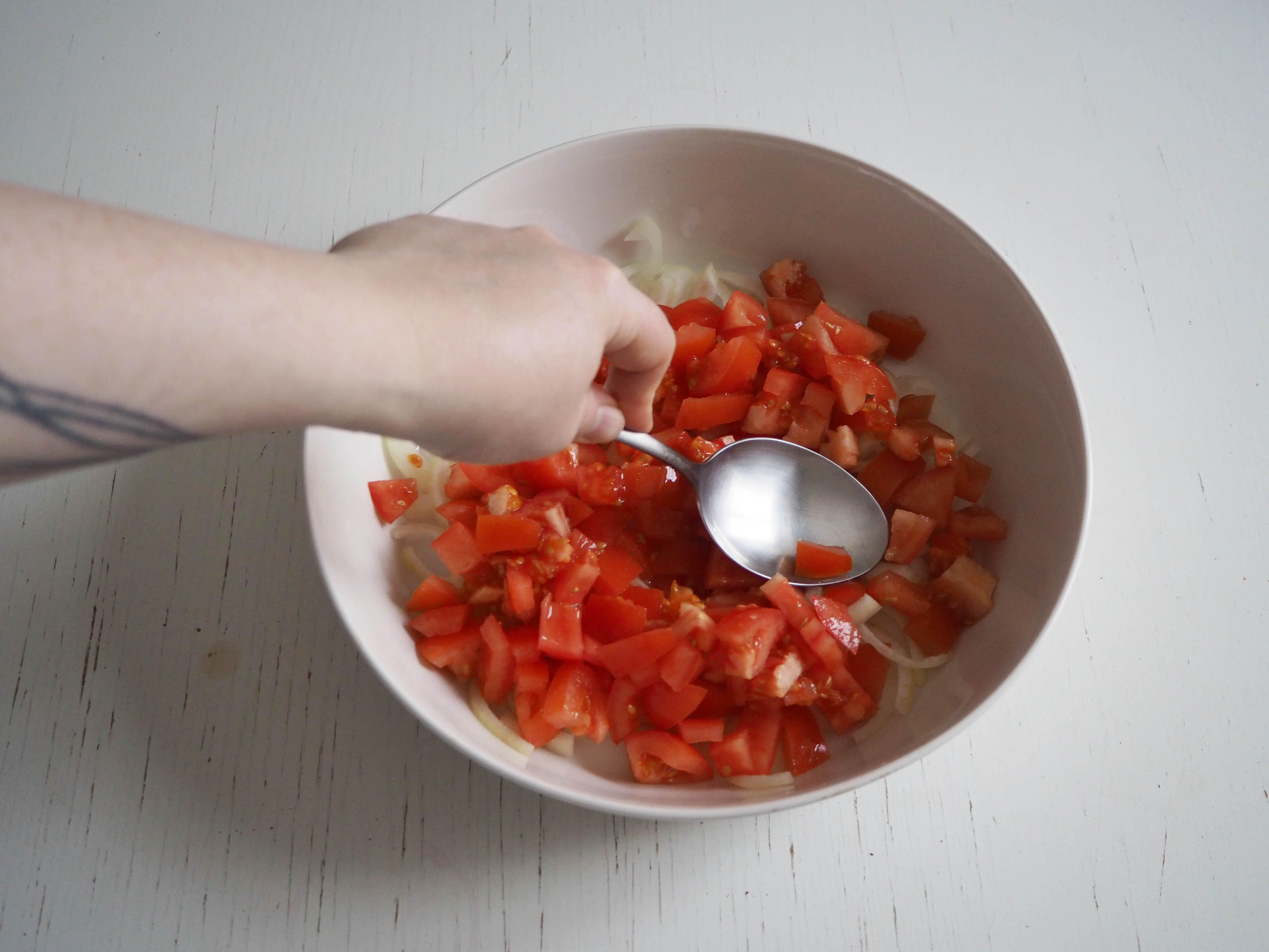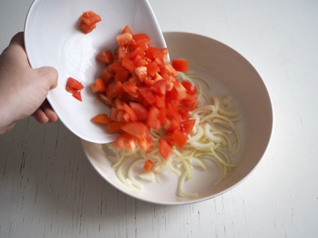 2. In a large salad bowl, put the sliced onion, rubbing the pieces a little with each other. Add tomatoes and mix while pressing a little with the back of your spoon to have the juices come out.
