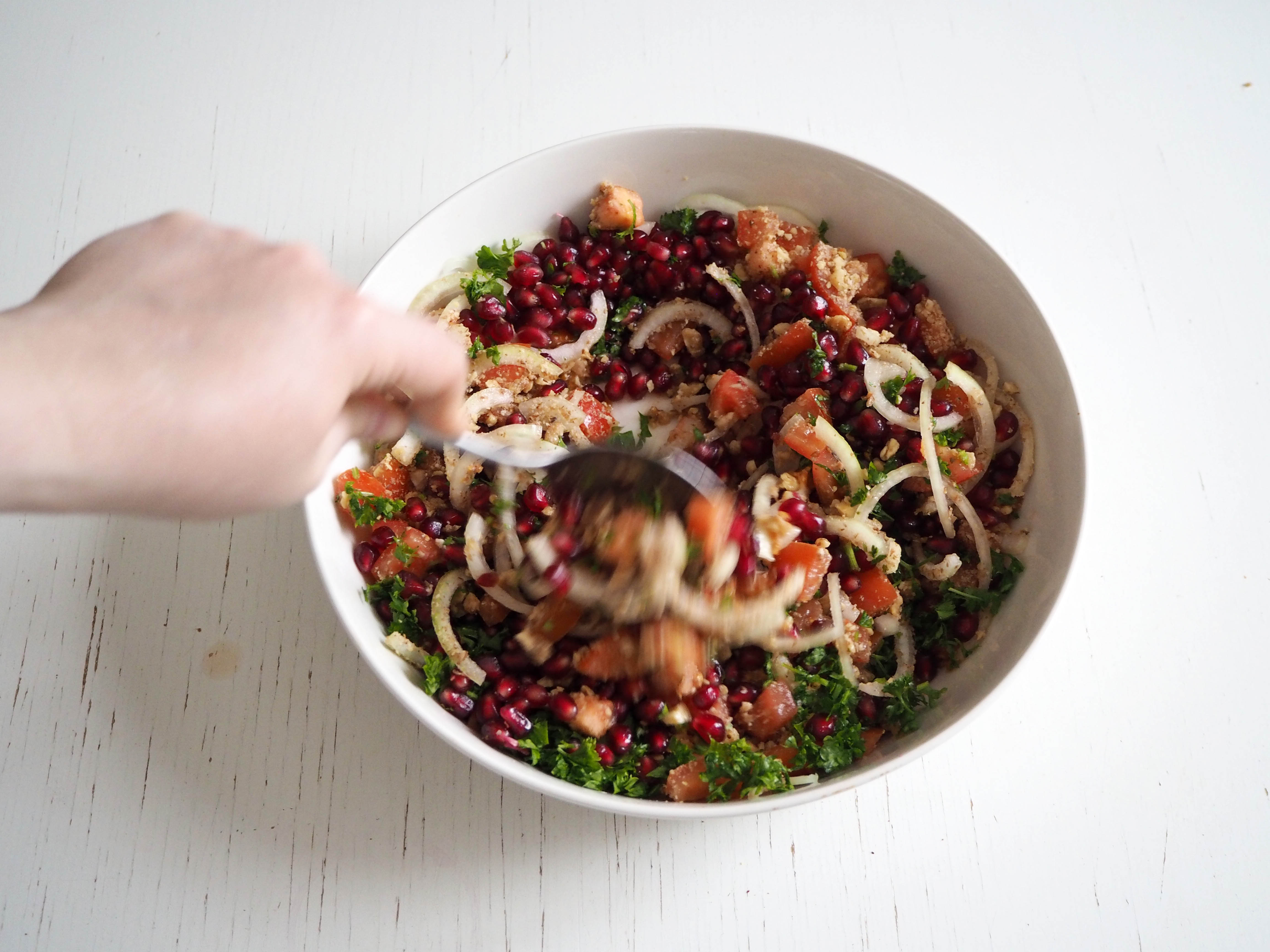 3. Add walnuts, pomegranate seeds and parsley and mix.