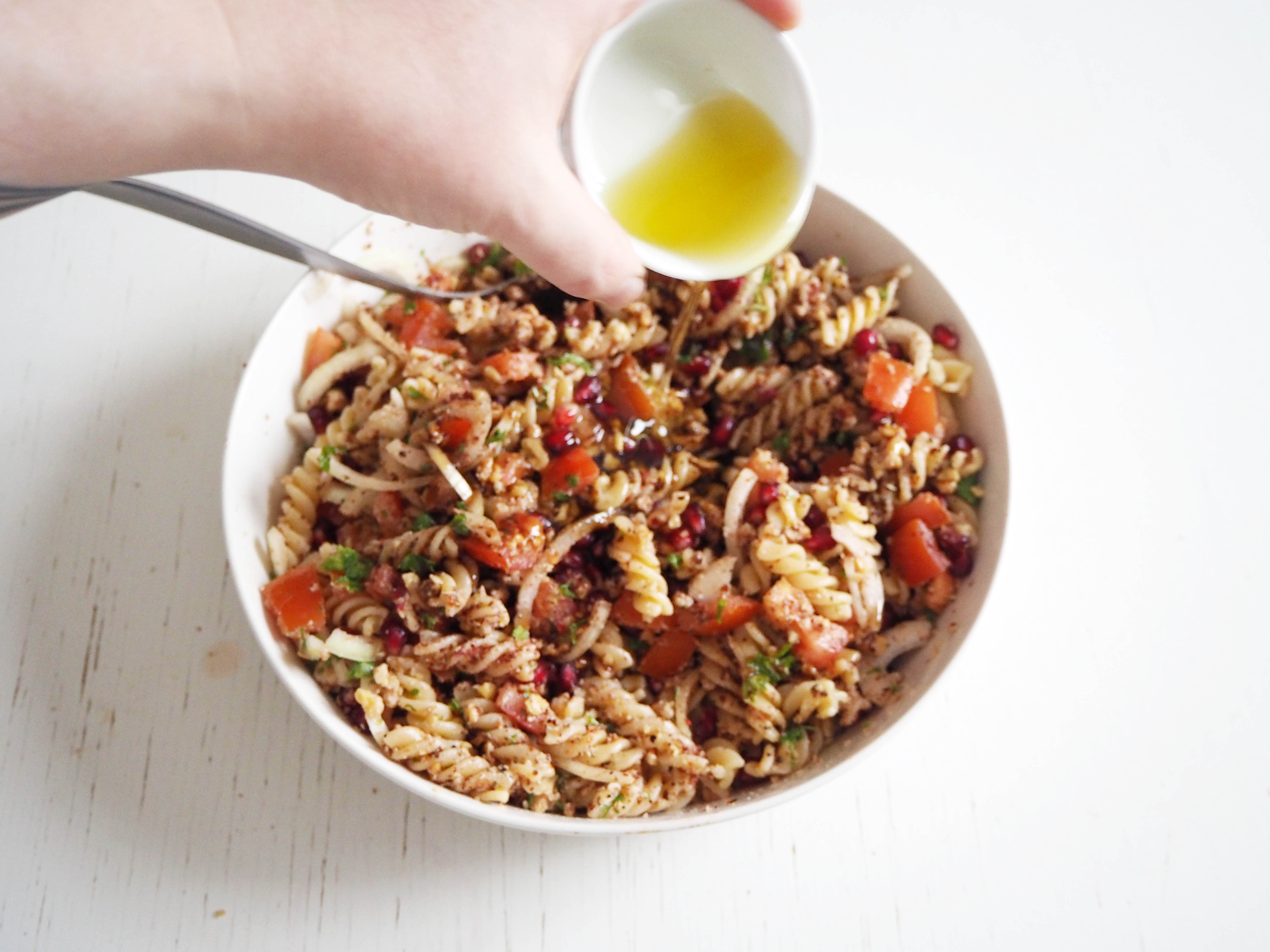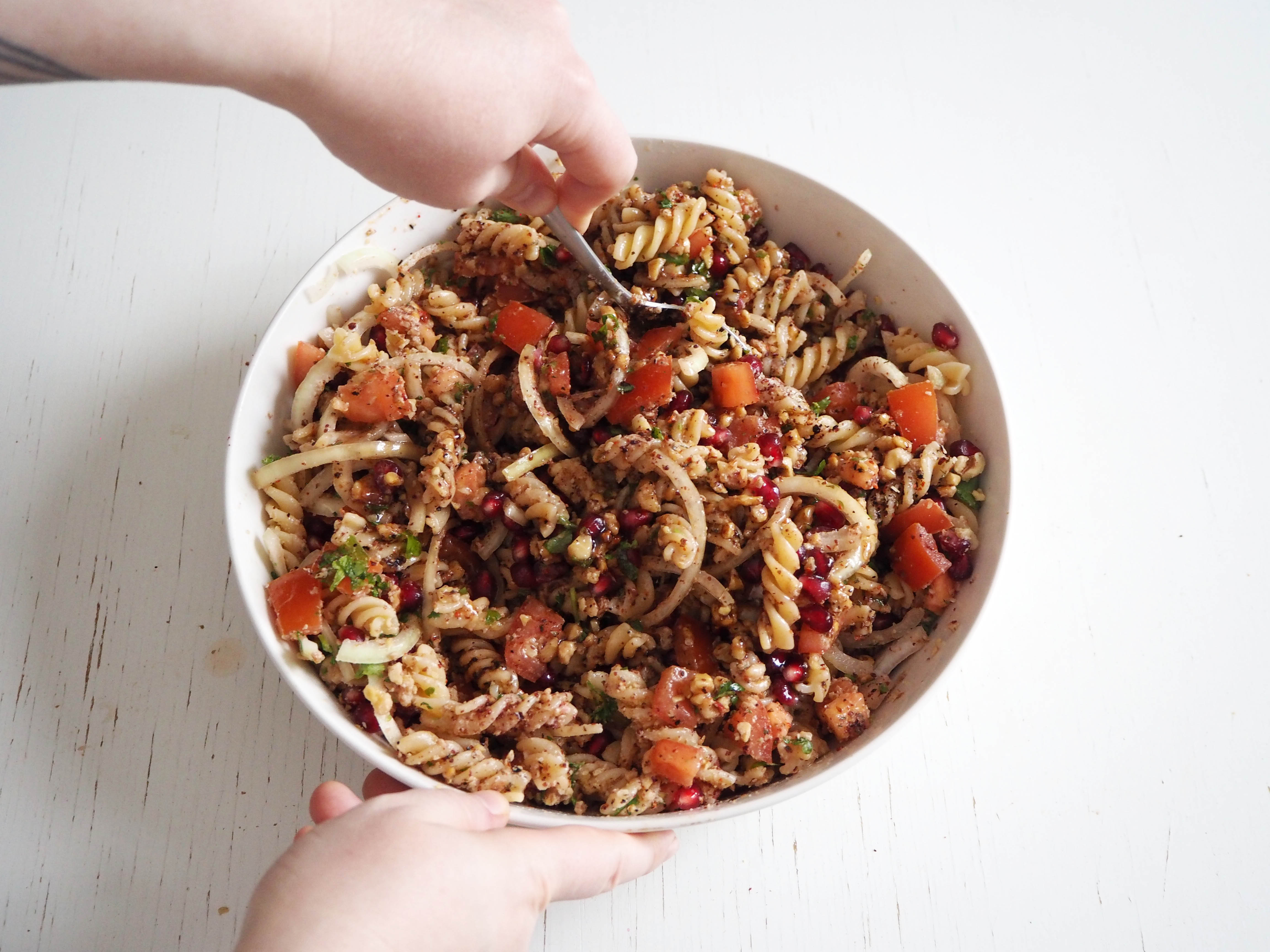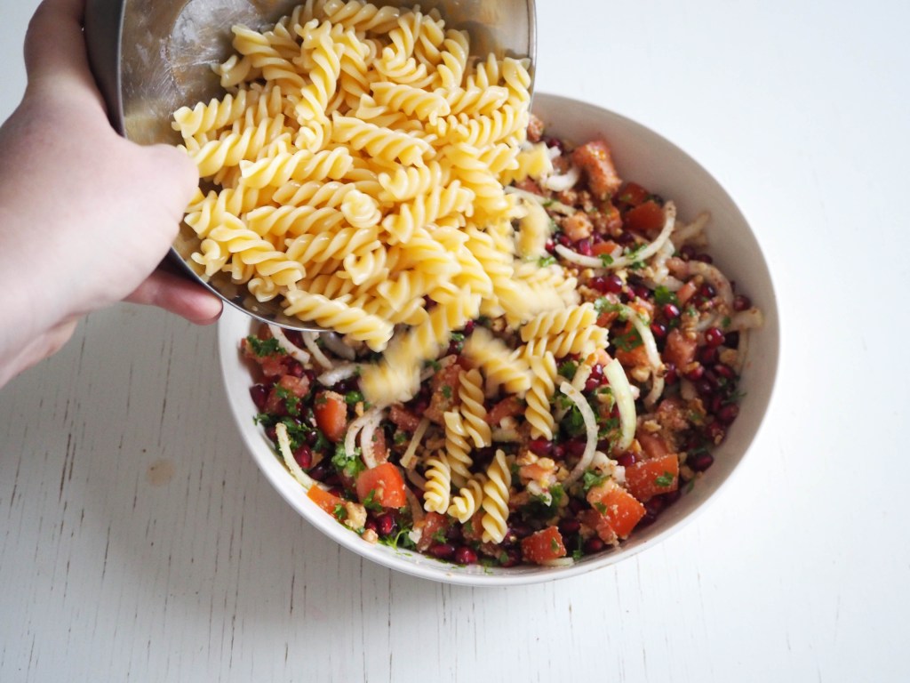 The recipe cannot be easier. All you need to do is to cook the pasta and do some chopping. And yes, of course, you also need to deseed the pomegranate without turning your kitchen into a slaughterhouse.