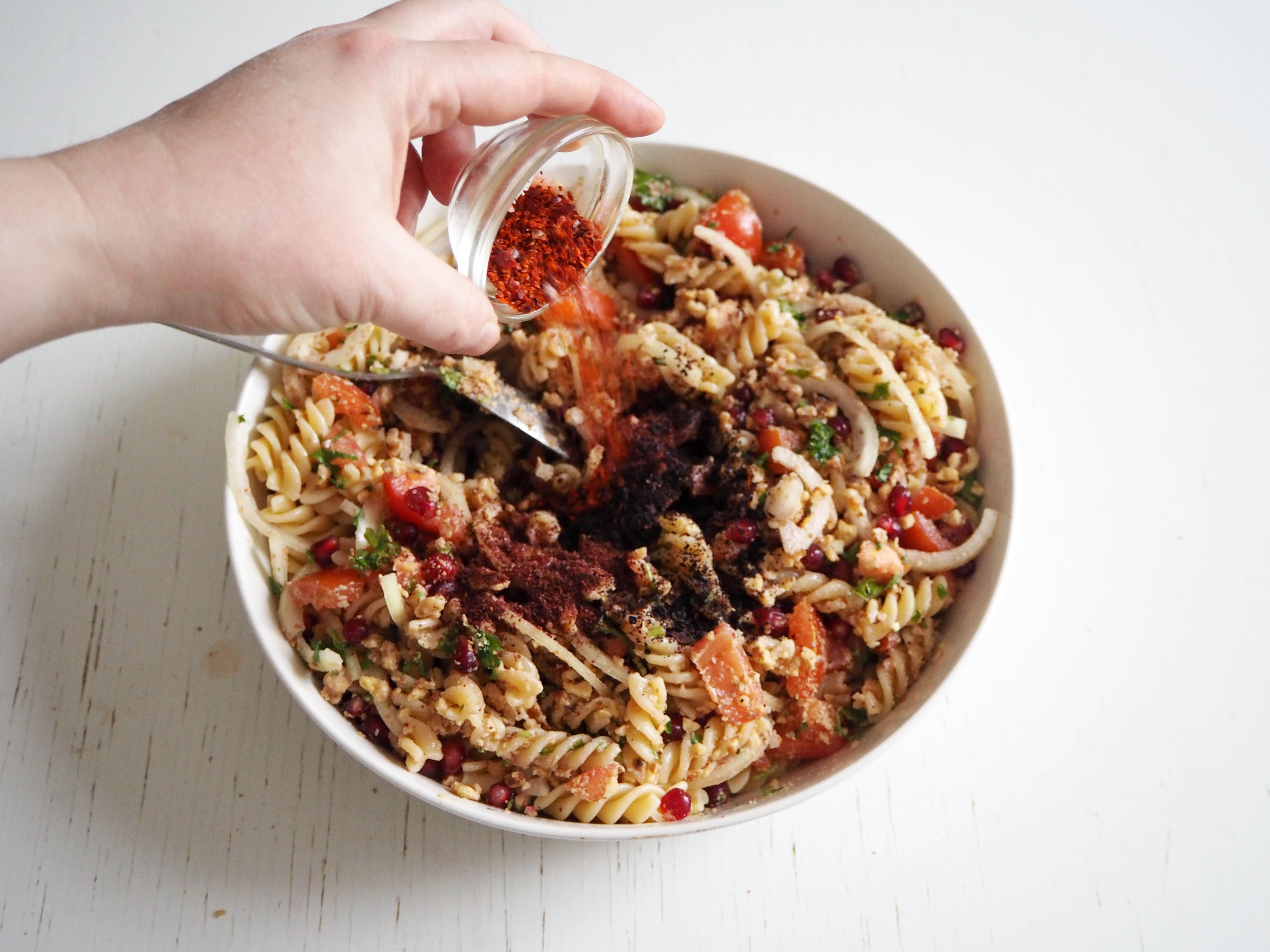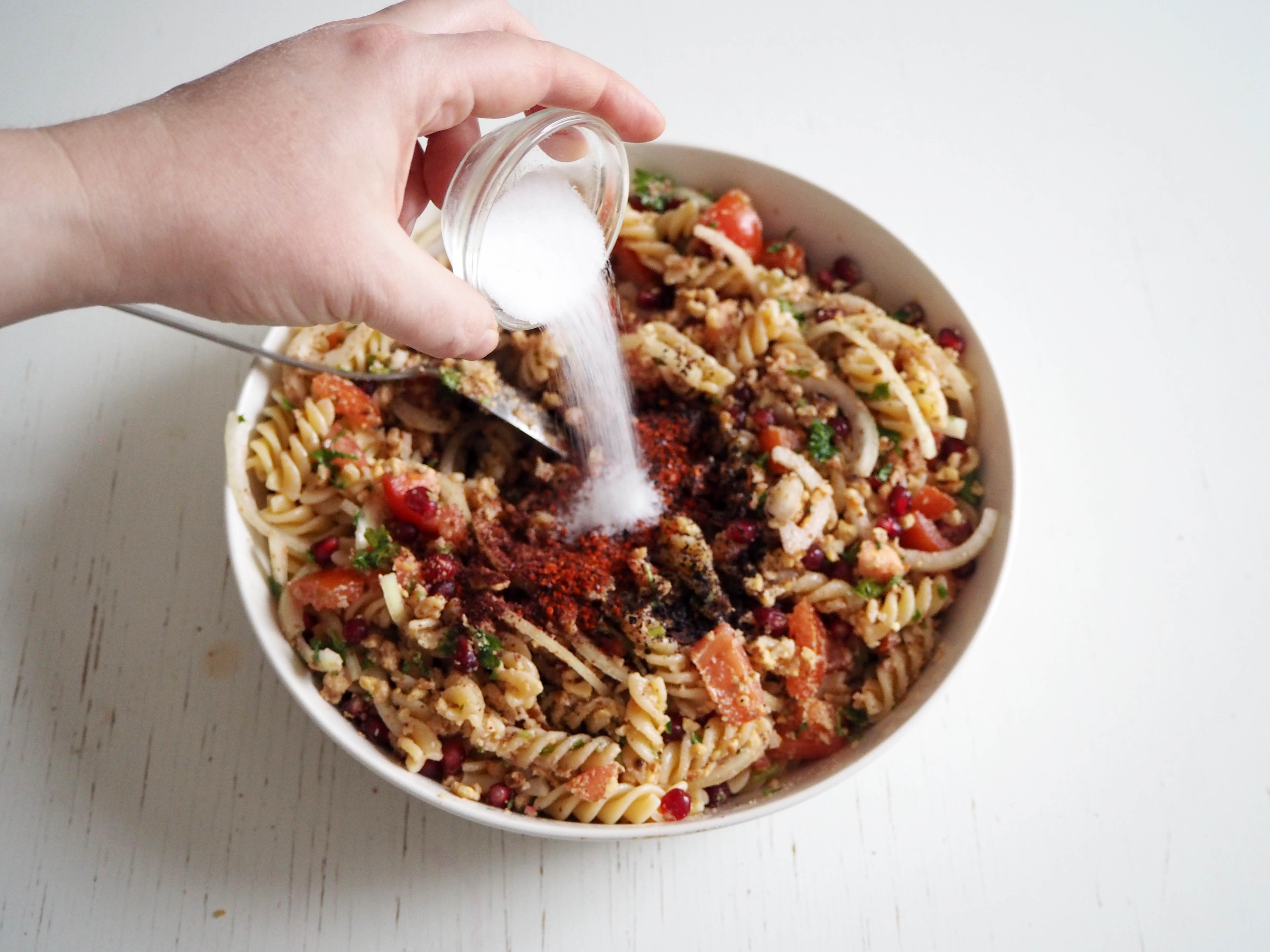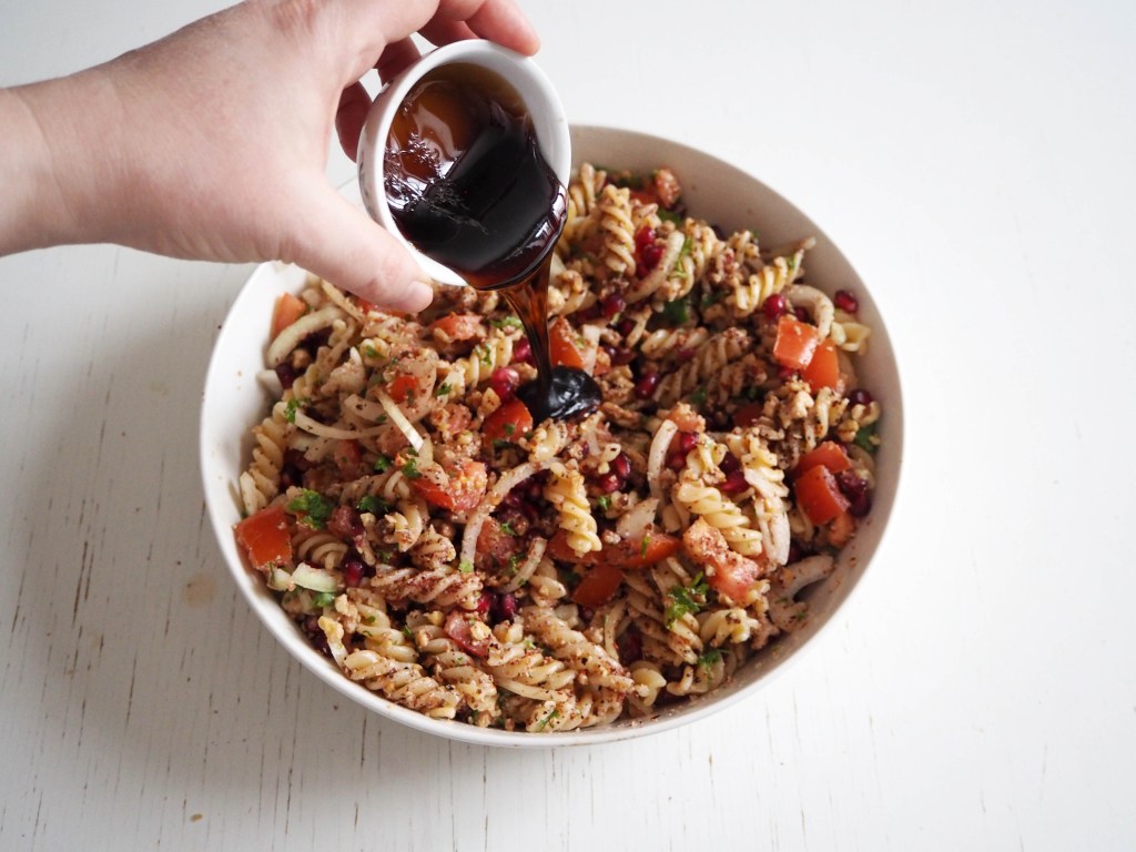 The recipe cannot be easier. All you need to do is to cook the pasta and do some chopping. And yes, of course, you also need to deseed the pomegranate without turning your kitchen into a slaughterhouse.