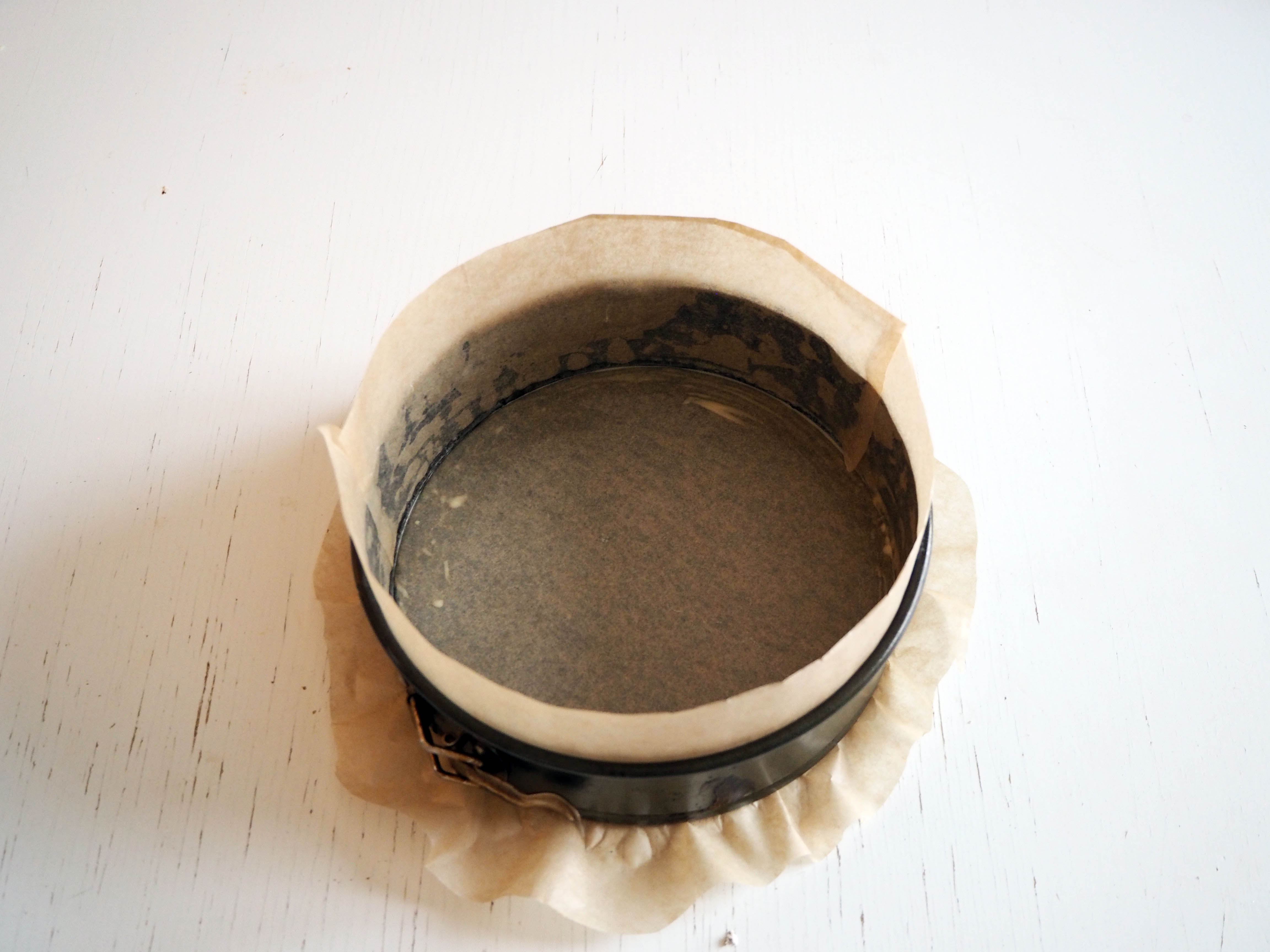 - Preheat the oven to 175C. Grease a 22cm cake pan, cover the base and sides with baking paper.