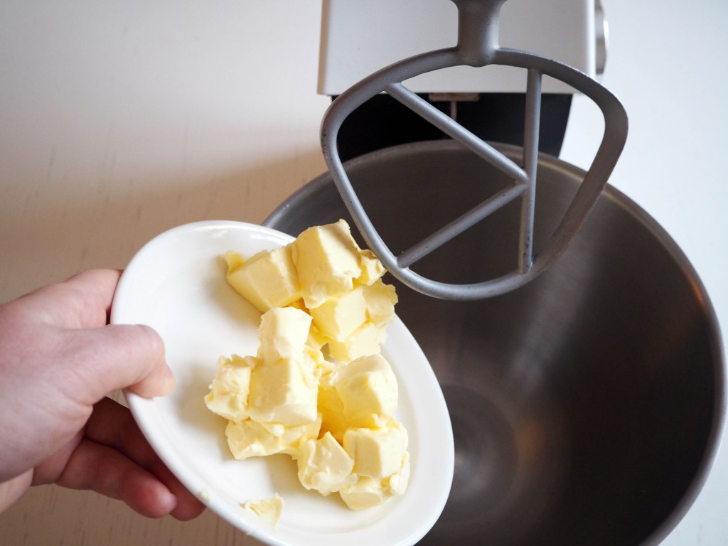 2. In the bowl of a mixer, put butter and sugar and whisk well for 3-4 minutes, until it gets fluffy. Scrape the sides of the bowl in the end.