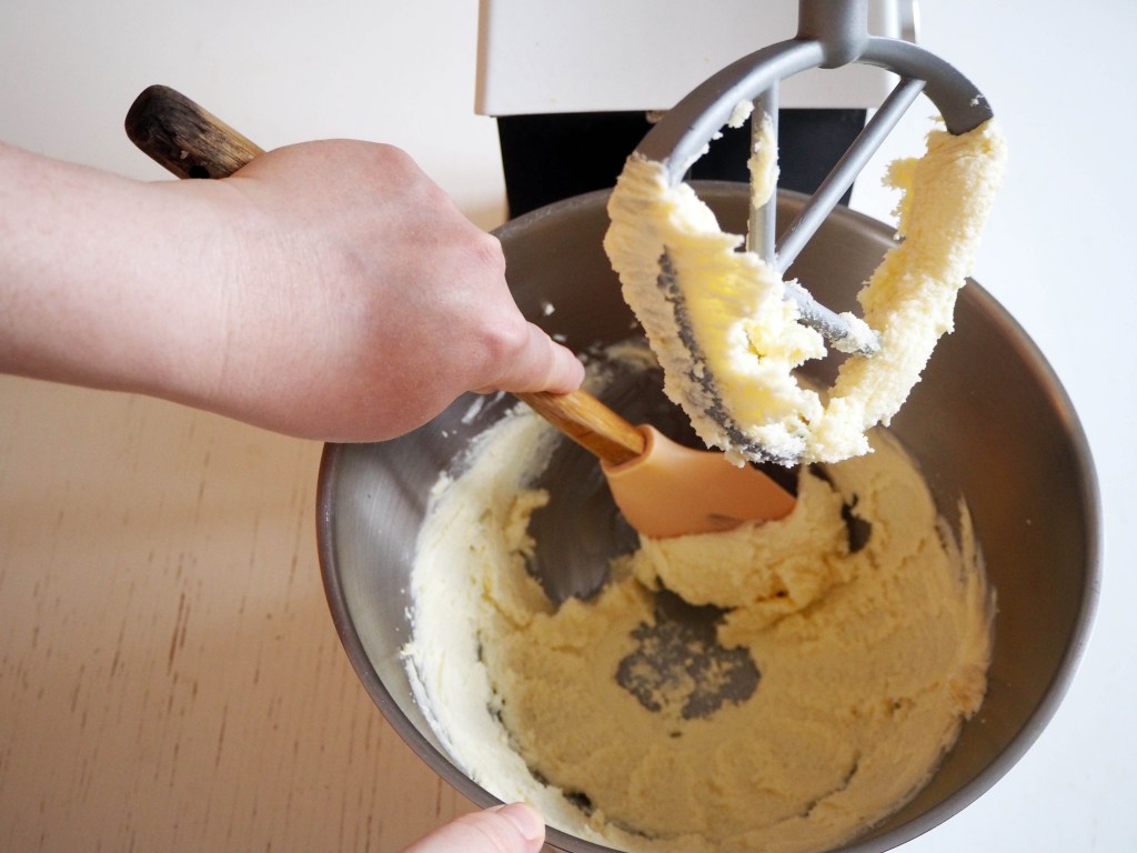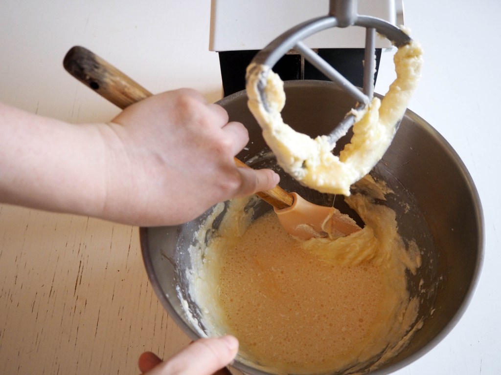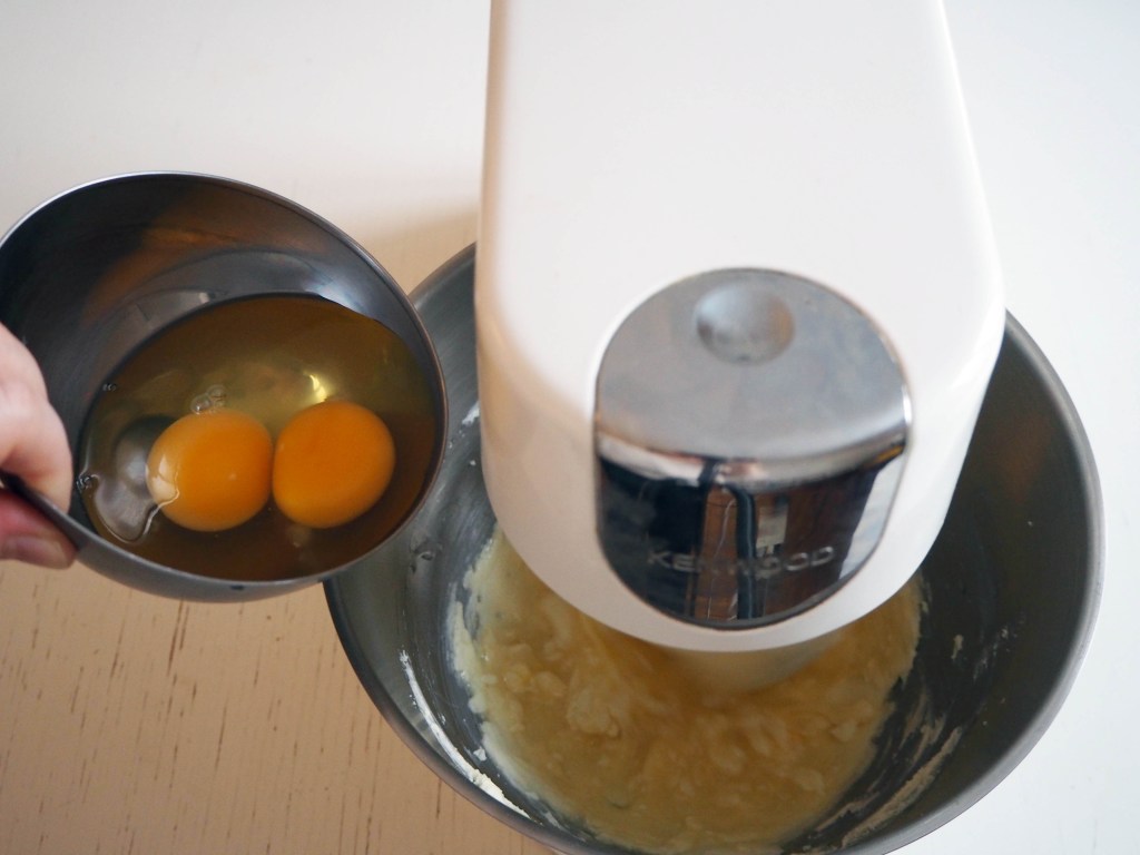 3. Add eggs, one at a time and continue whisking until all the eggs are incorporated. Scrape the sides whenever needed.