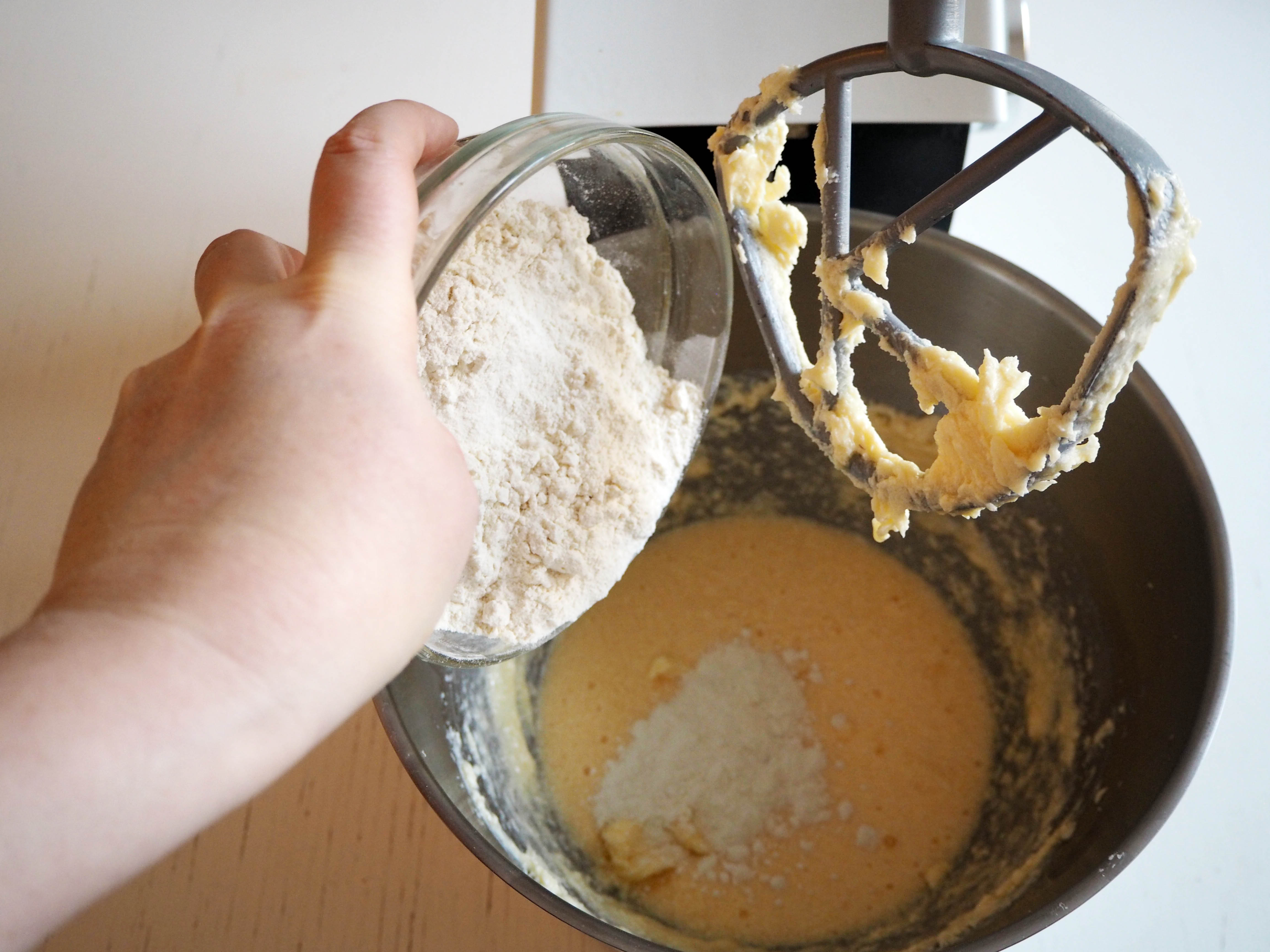 4. Add flour and baking powder and continue whisking just until all the dry and wet ingredients are mixed well.