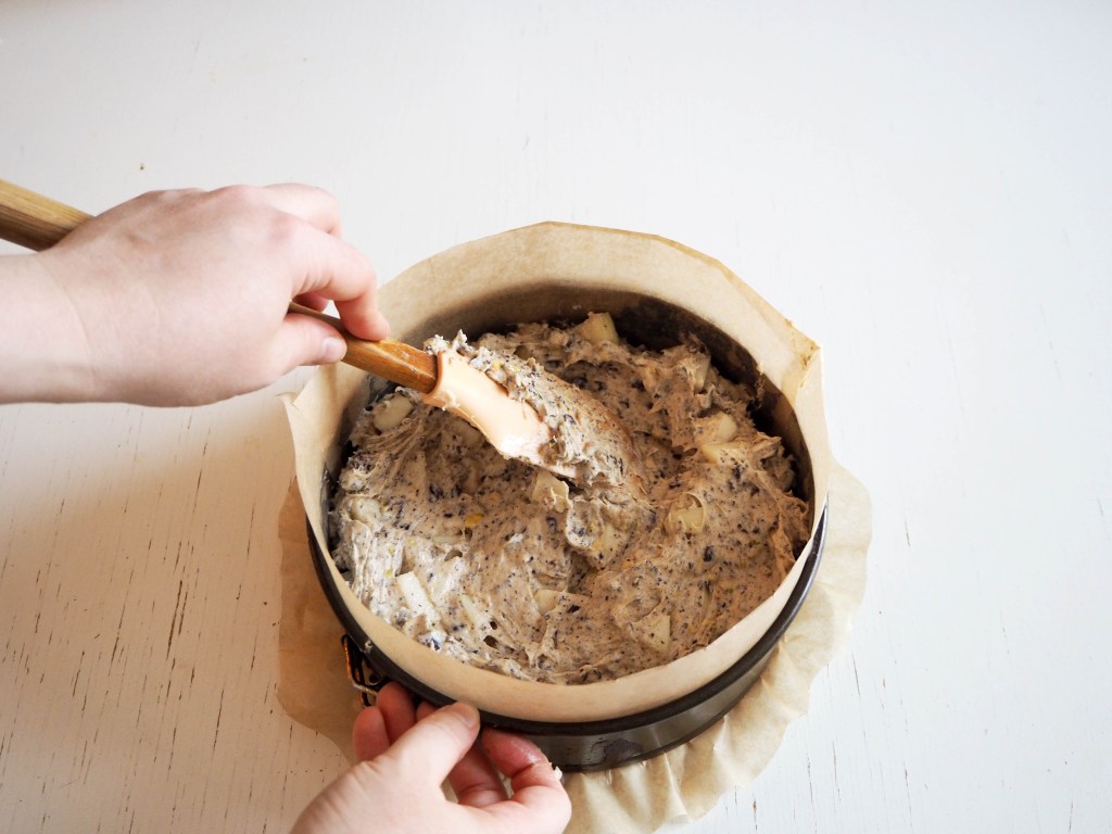 7. Transfer the batter to the cake pan and smoothen the top with a spatula or a spoon. Put in the medium part of your oven and bake for 45-50 minutes, until a toothpick inserted in the middle comes out clean. When the cake is ready, take out of the oven and let it cool for about 10 minutes in the pan; then transfer the cake onto a wire rack and let it cool down completely (for example, you might want to bake the cake in the morning and do the next step in the late afternoon, several hours later).