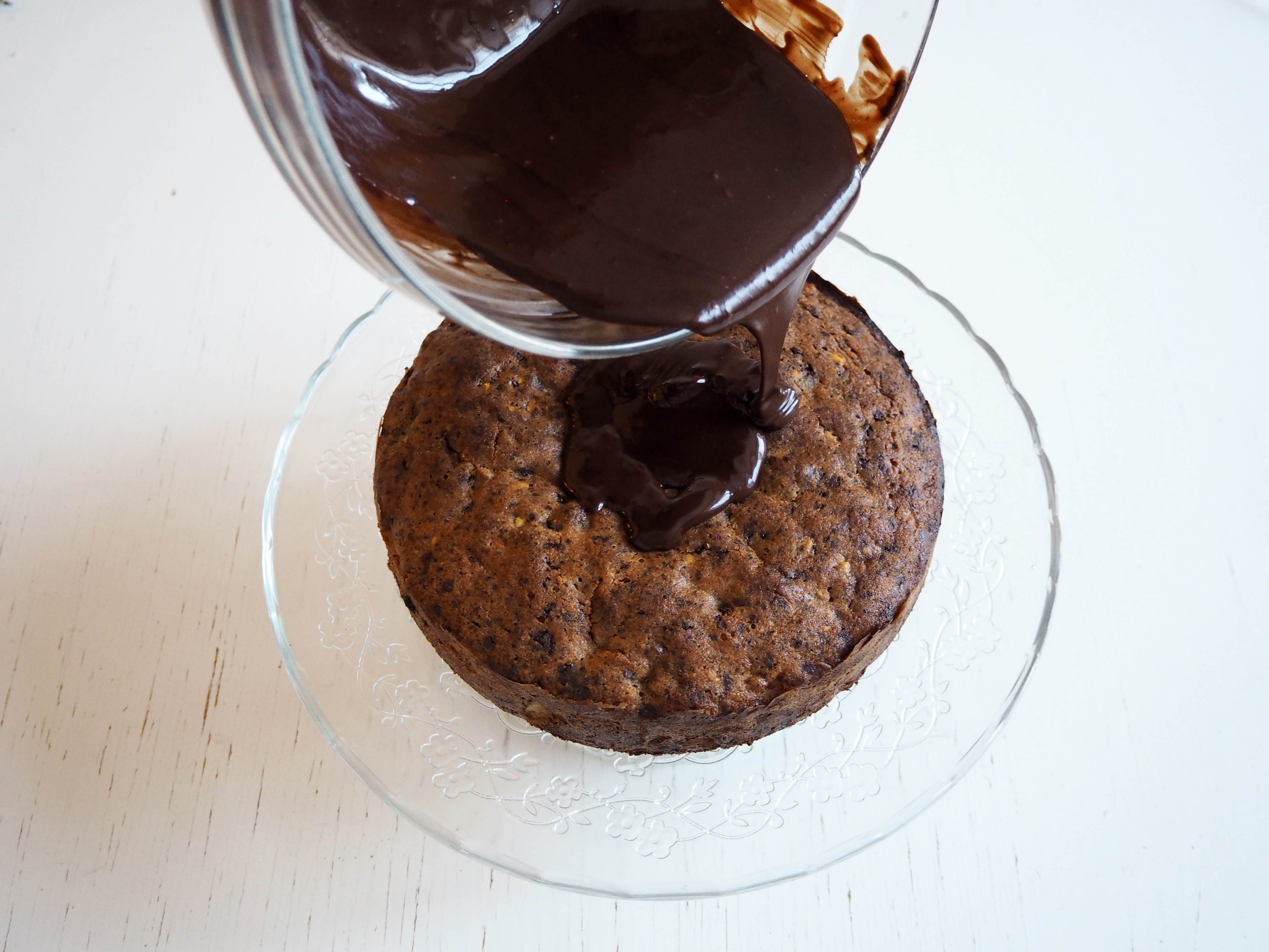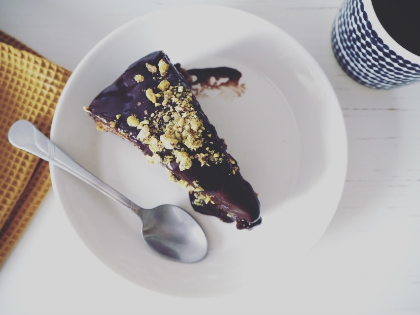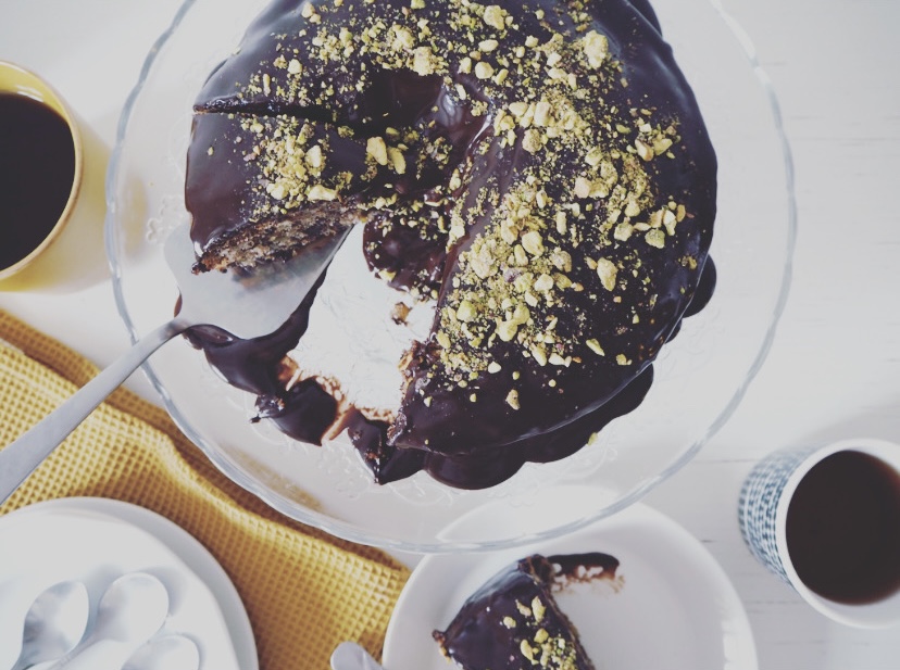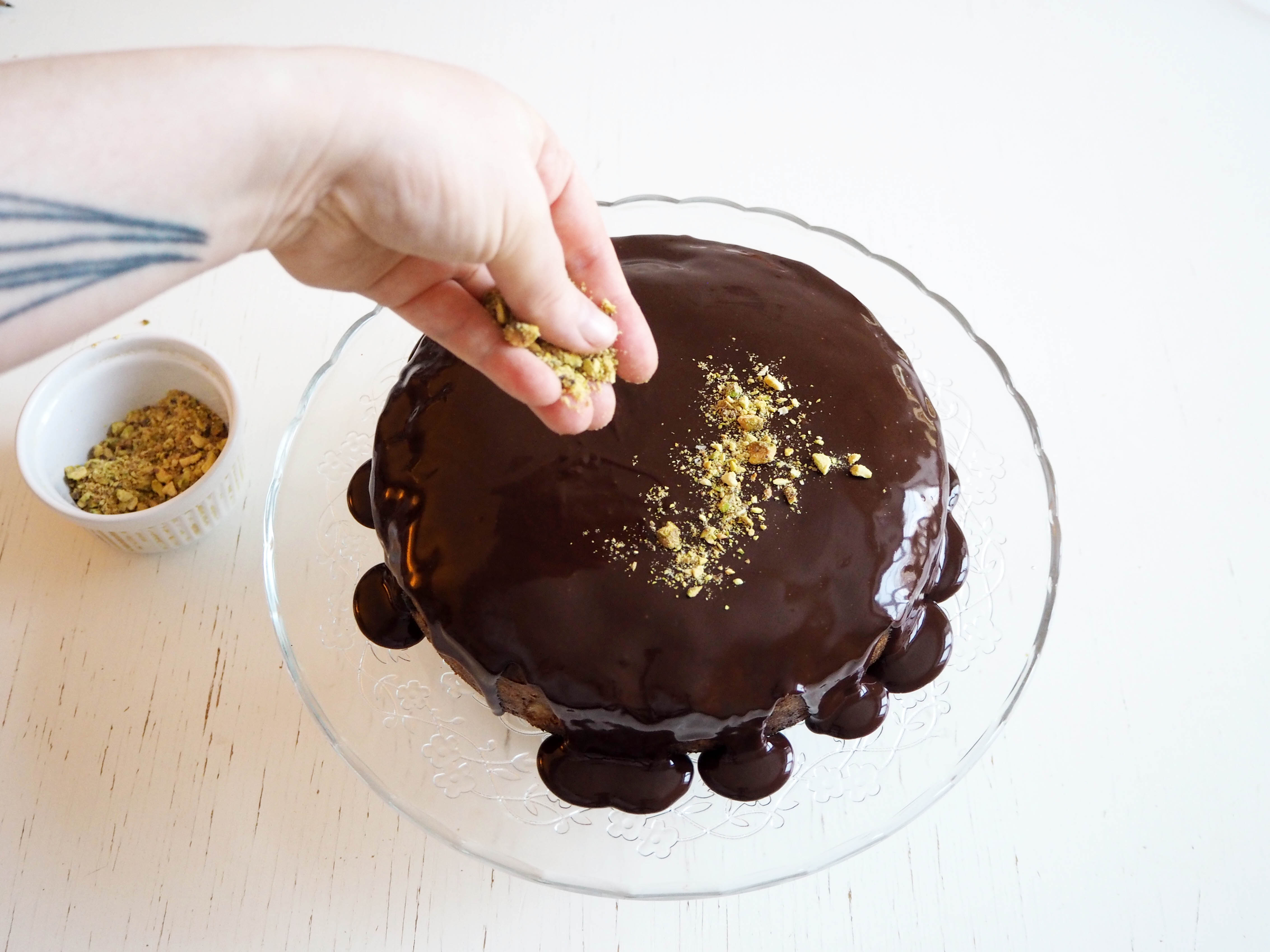 10. Pour the ganache on the cake slowly, then spread it evenly on the cake using the back of a spoon (or a spatula). Decorate with crushed pistachios if you like and let the ganache cool down completely before slicing. Enjoy with fresh tea or coffee!