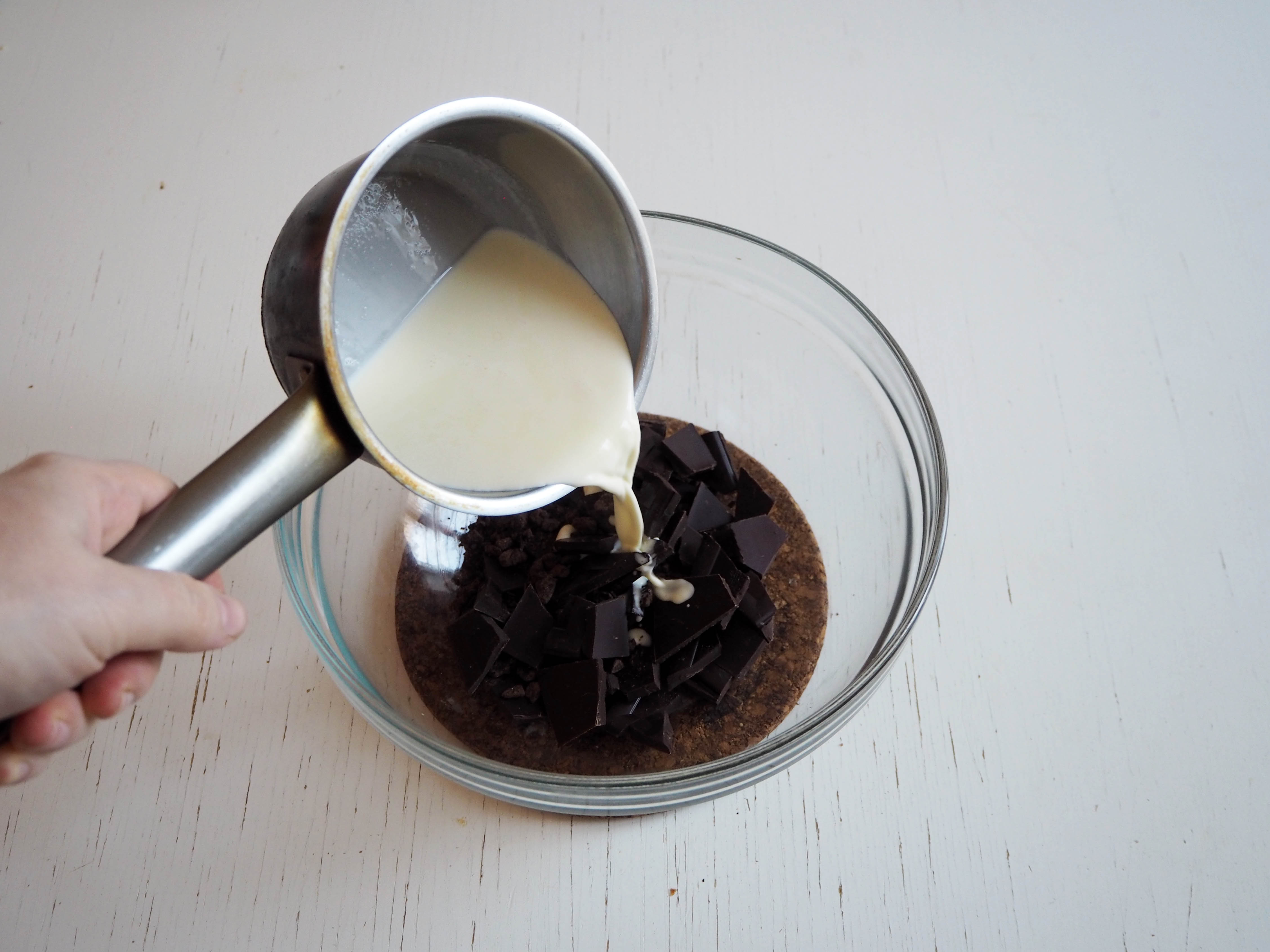 9. Put the heavy cream in a small saucepan and warm it until it starts boiling. Pour the hot cream on the chocolate and using a whisk or a spatula, melt the chocolate with hot cream. When all the chocolate melts, let the ganache cool down for about 7-8 minutes and harden a little.