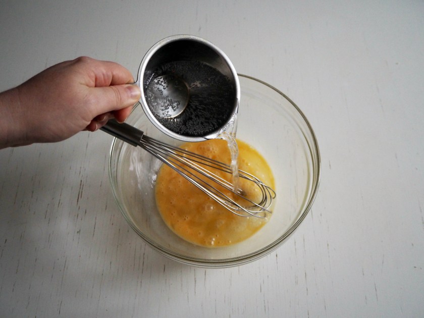 2. In a mixing bowl, put eggs and mineral water and whisk.