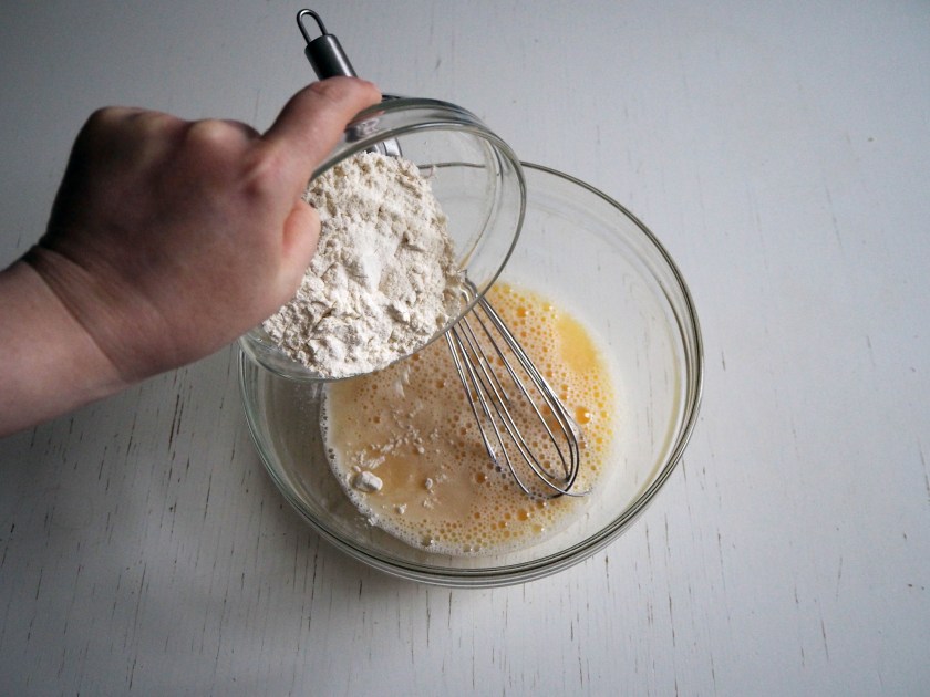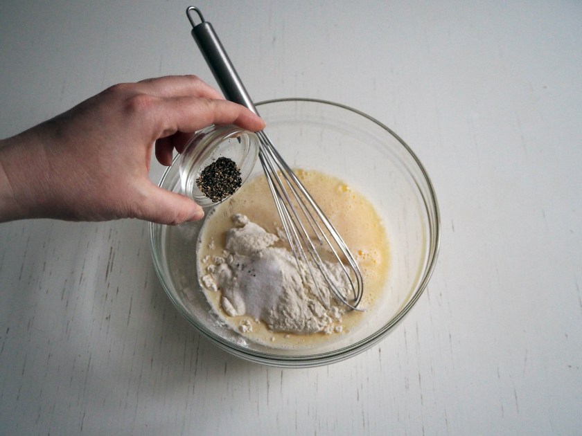 3. Add flour, salt, pepper and red pepper flakes and whisk well. All ingredients should be well mixed and become a coating batter.
