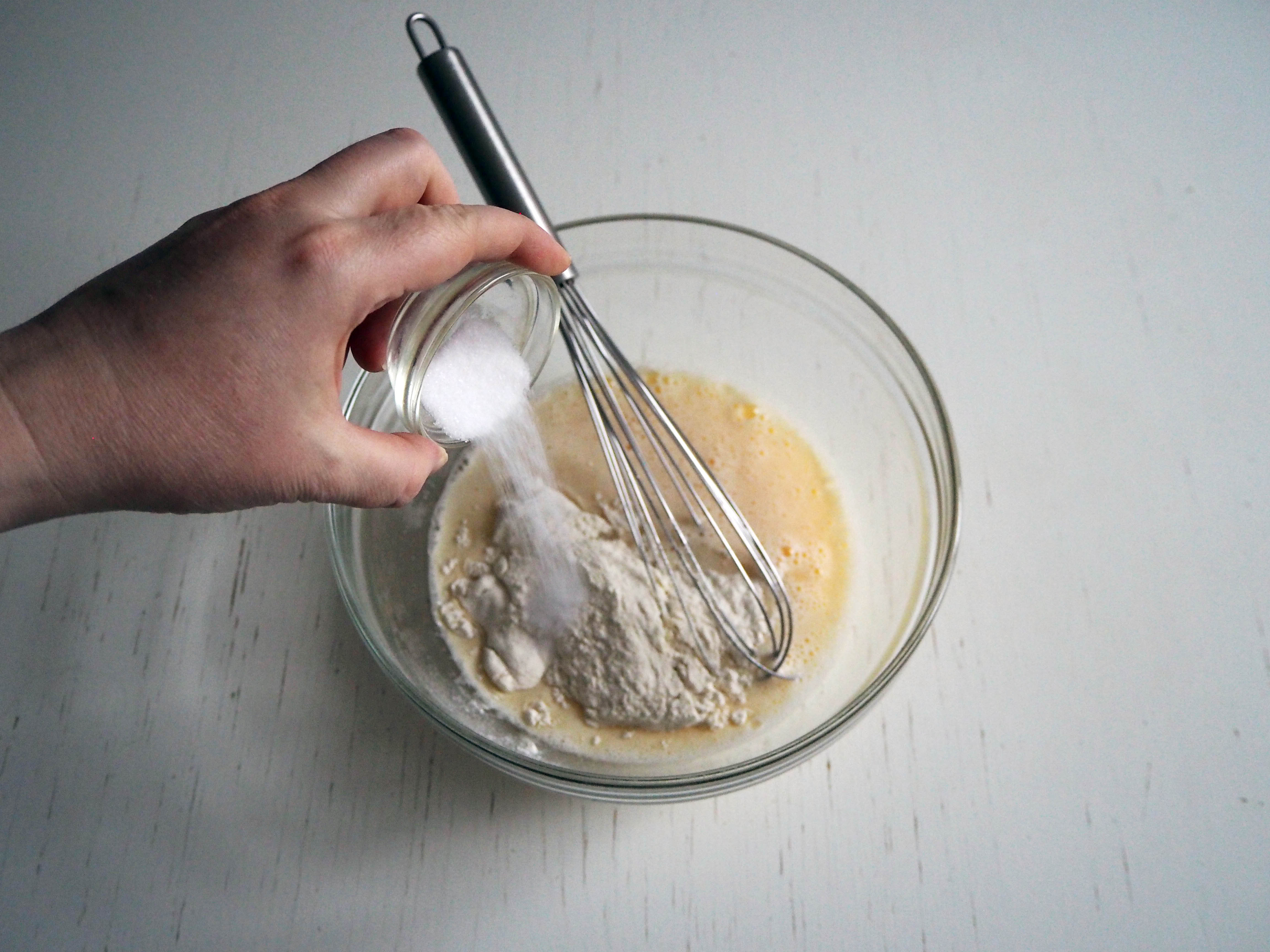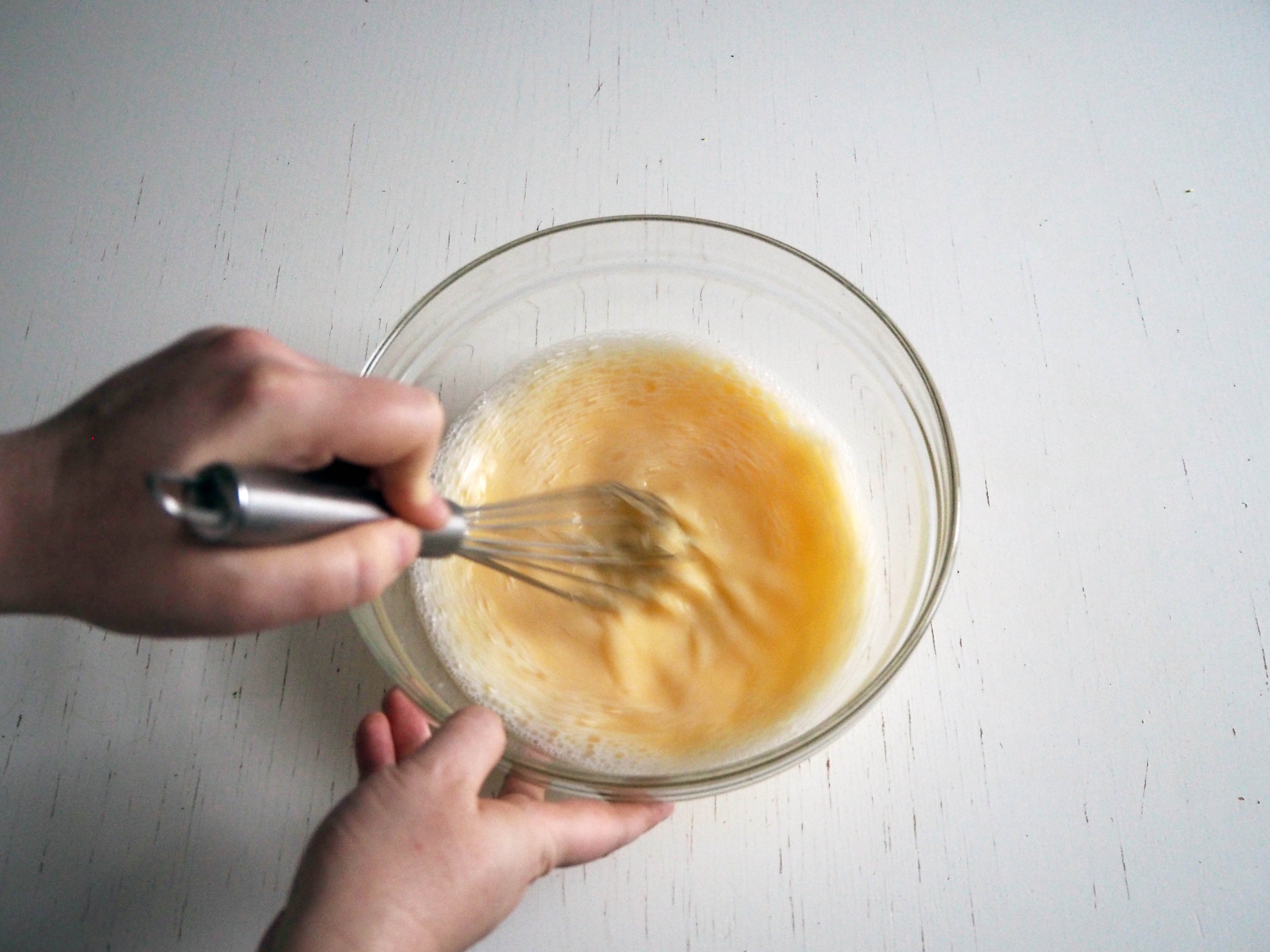 2. In a mixing bowl, put eggs and mineral water and whisk.