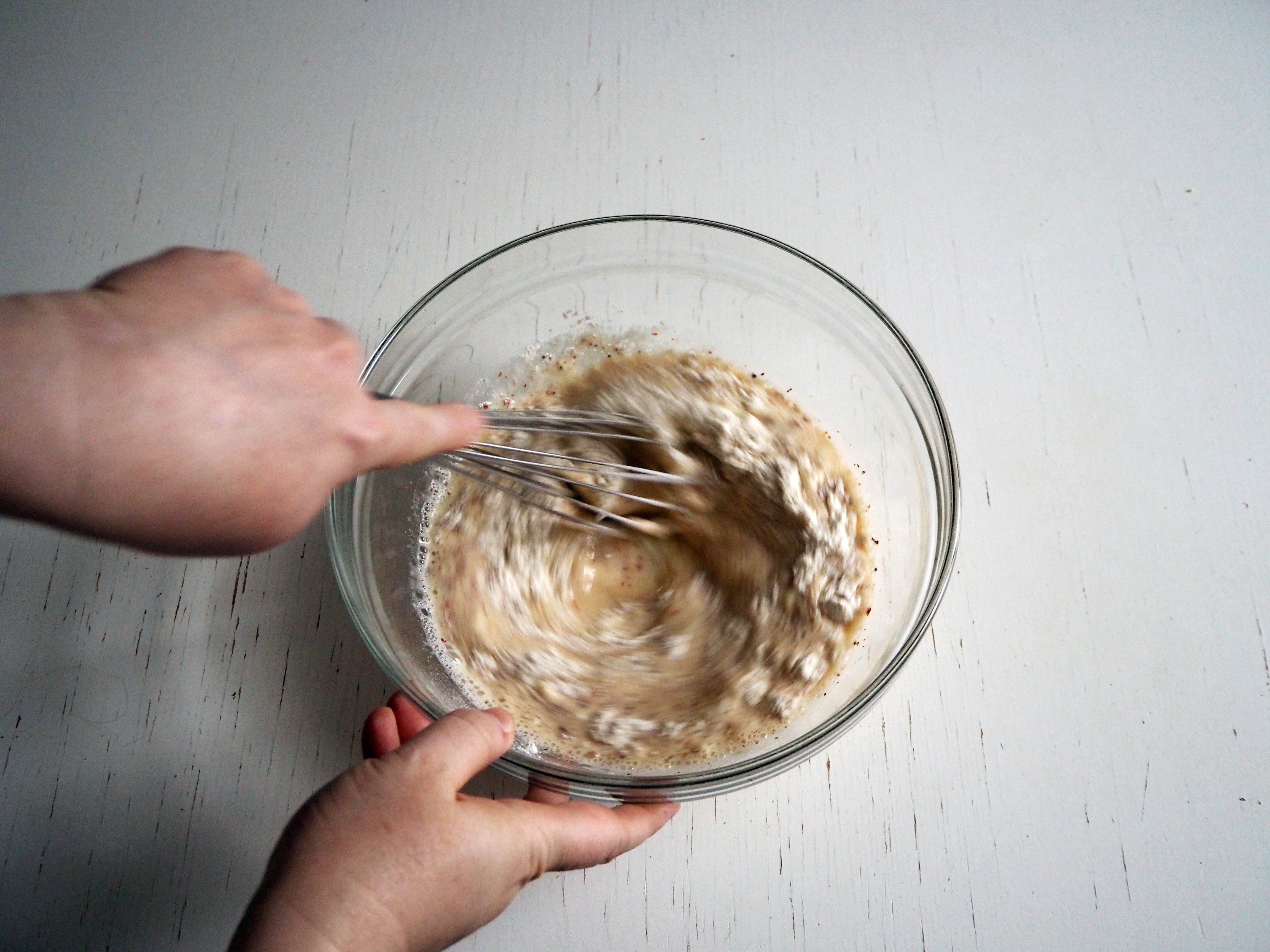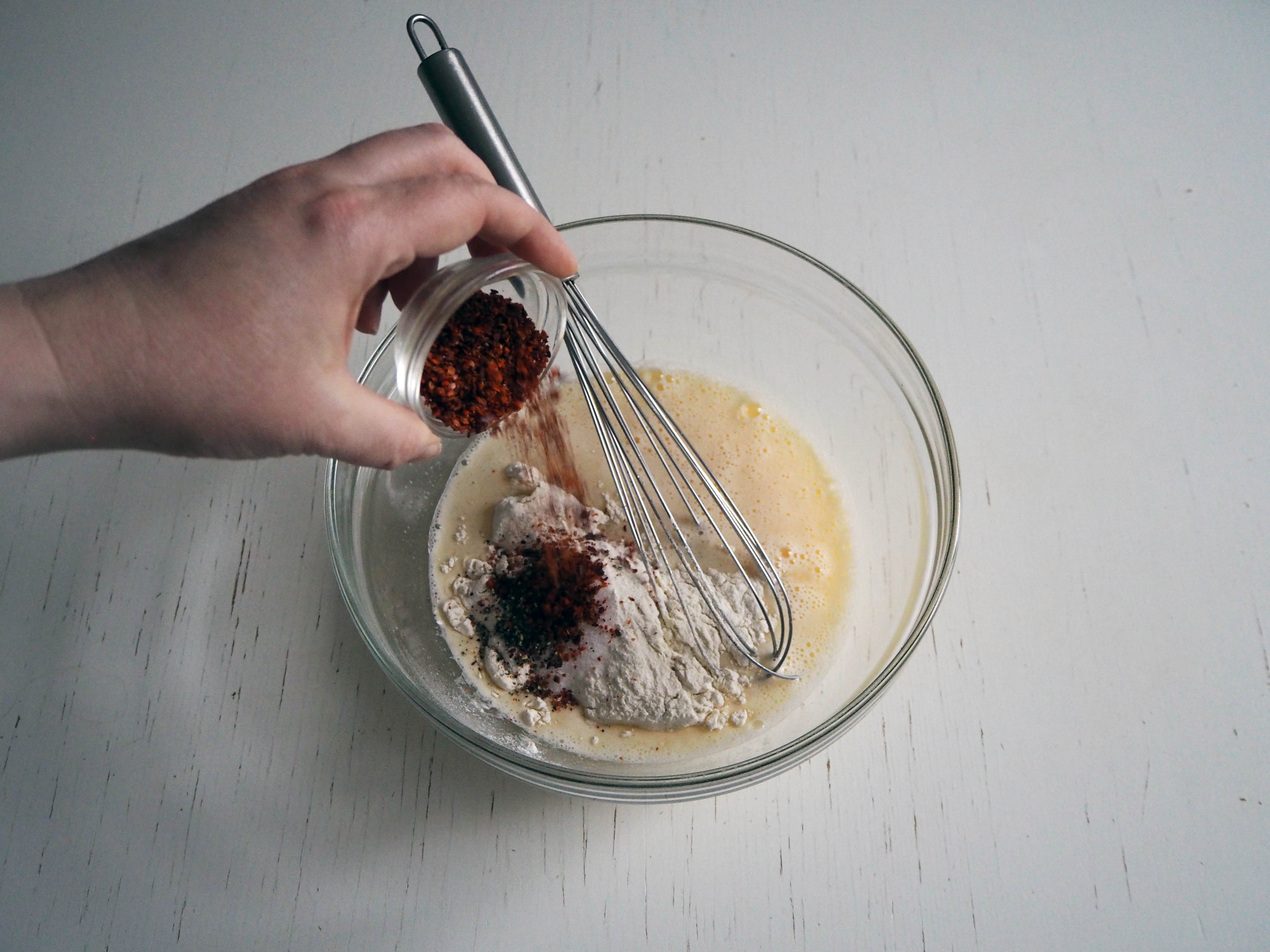 3. Add flour, salt, pepper and red pepper flakes and whisk well. All ingredients should be well mixed and become a coating batter.