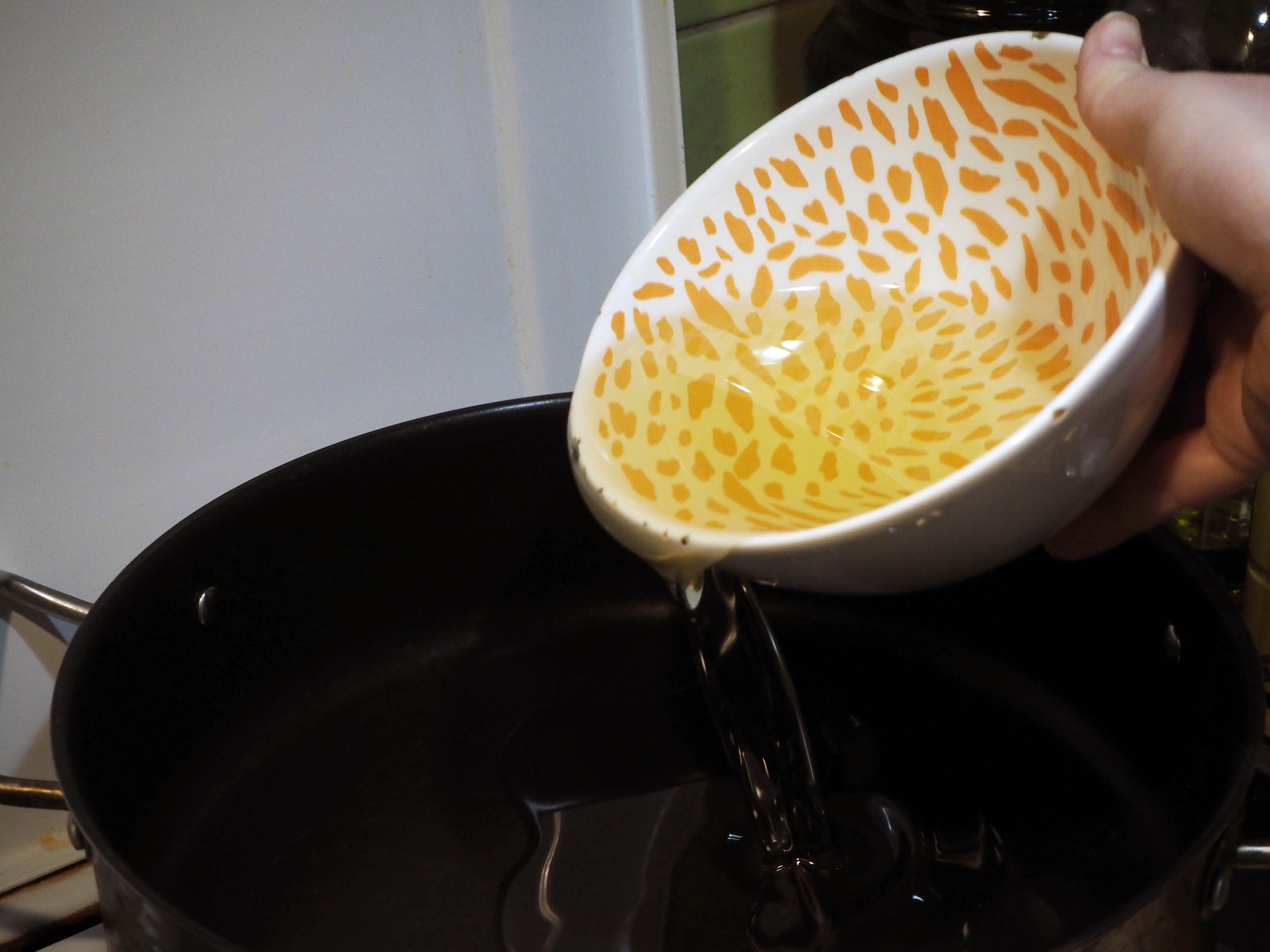 4. In a frying pan, put 7.5 dl (or 3 cups) frying oil on medium heat and let it get warm for at least 3-4 minutes.
