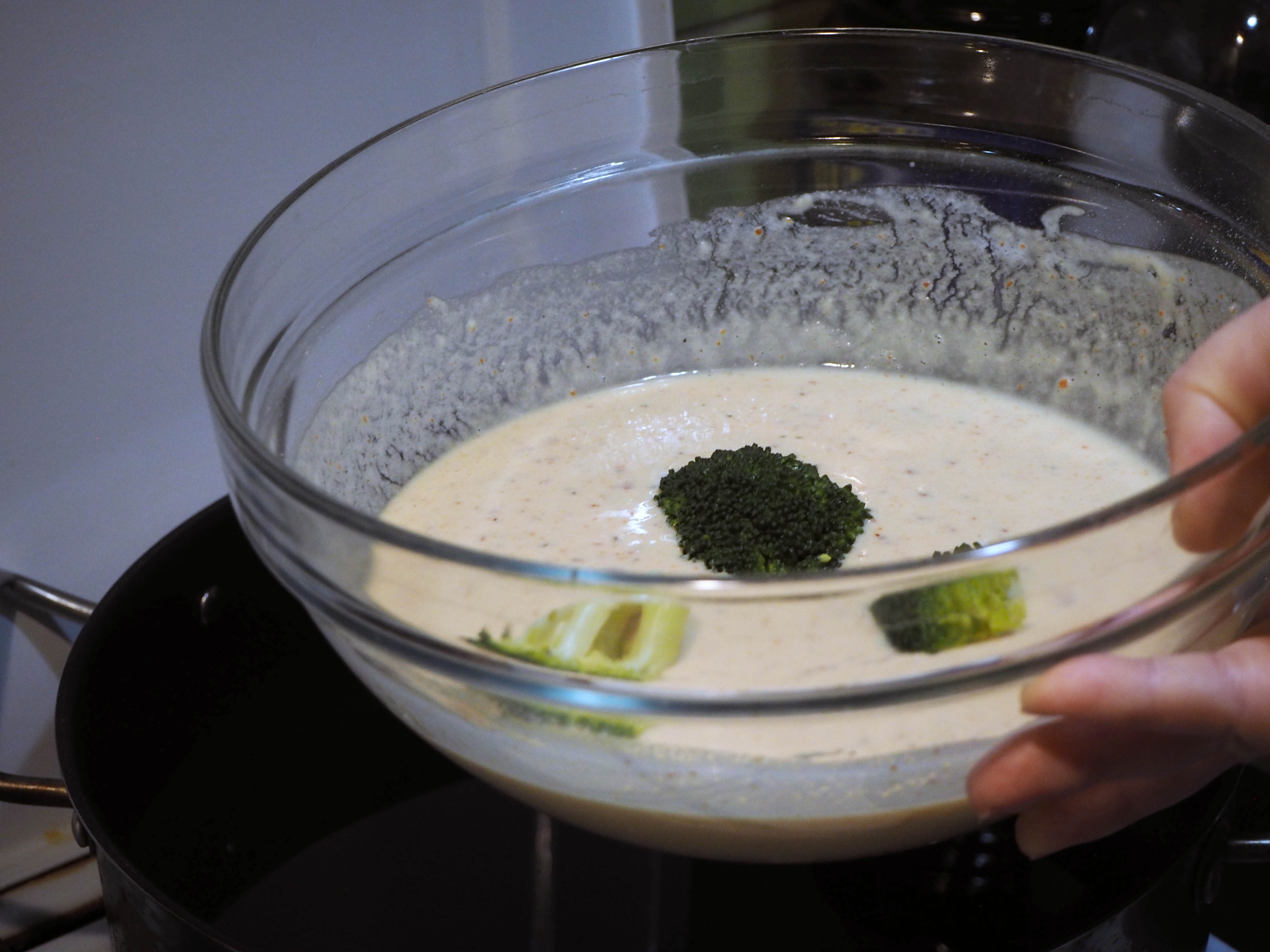 - In a large pot, put 2 litres of water and the broccoli florets. On medium-high heat, cook the broccoli florets only until they get slightly tender; you can check using a fork. They get very soft quite fast after a certain point, so I recommend keeping your eyes on them. When they are done, take out of the heat and drain.