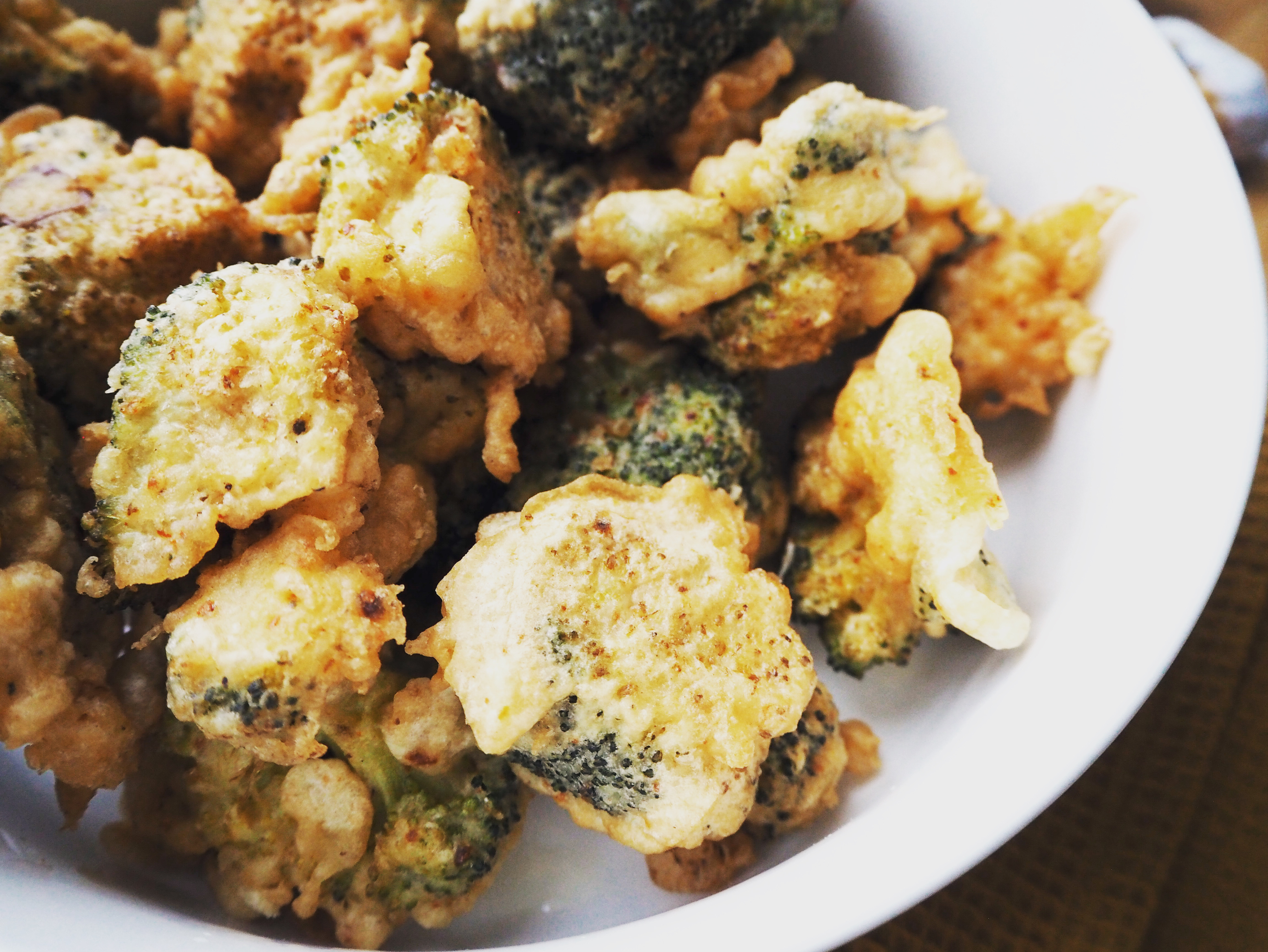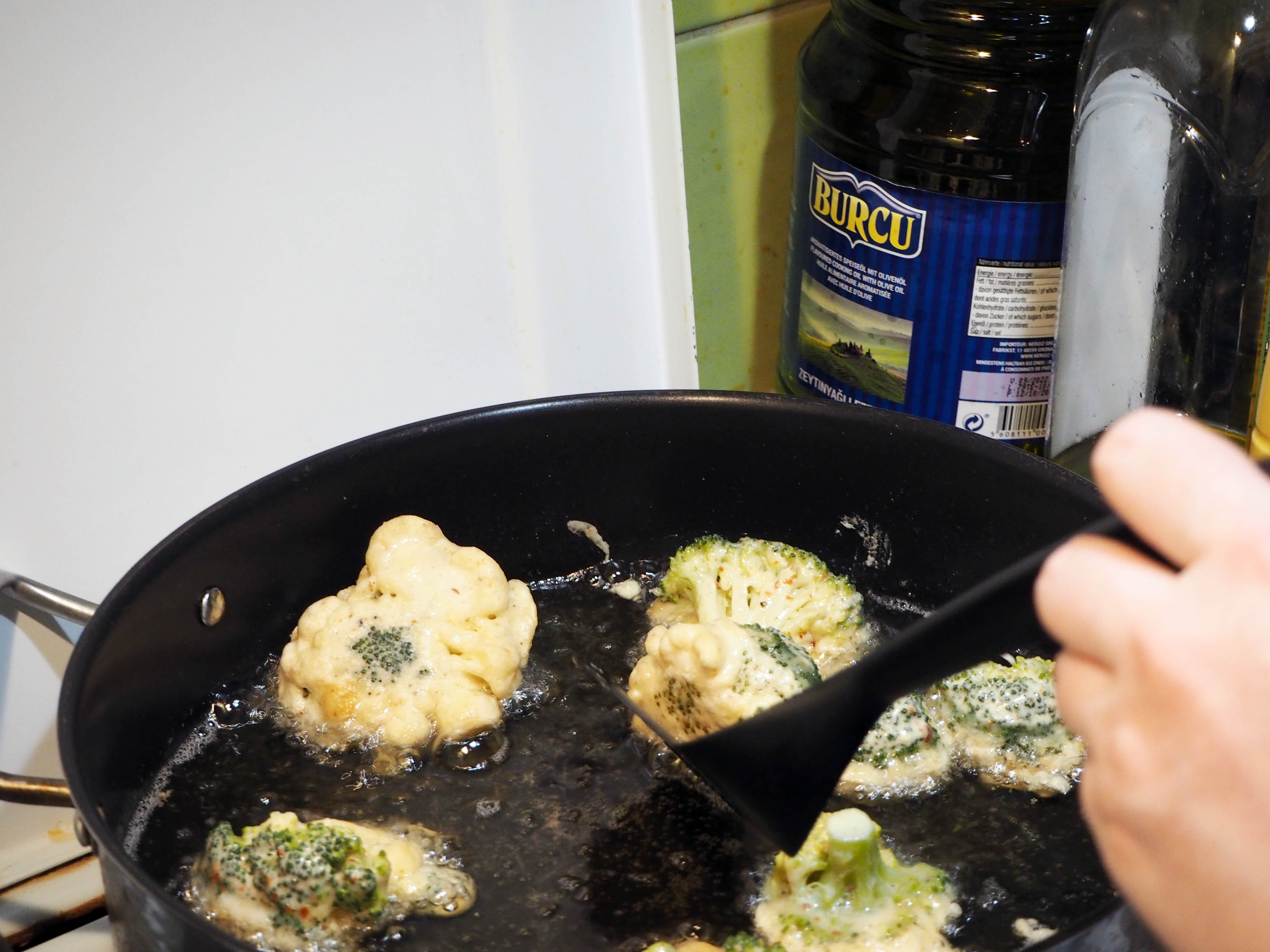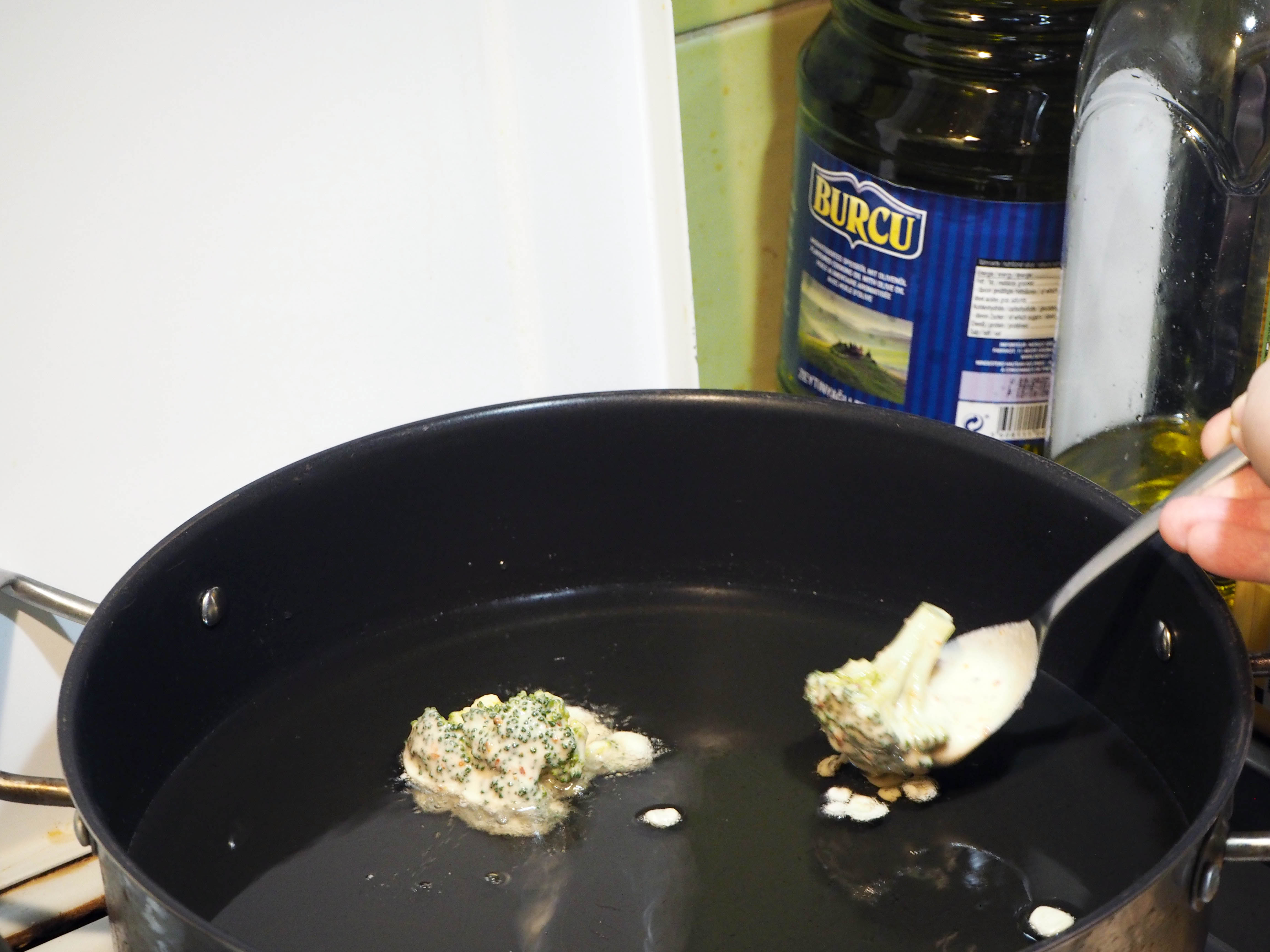 5. Coat the cooked broccoli florets with the batter one by one and drop into the hot oil. Do not put too many florets at once so that the pan doesn’t get too crowded.