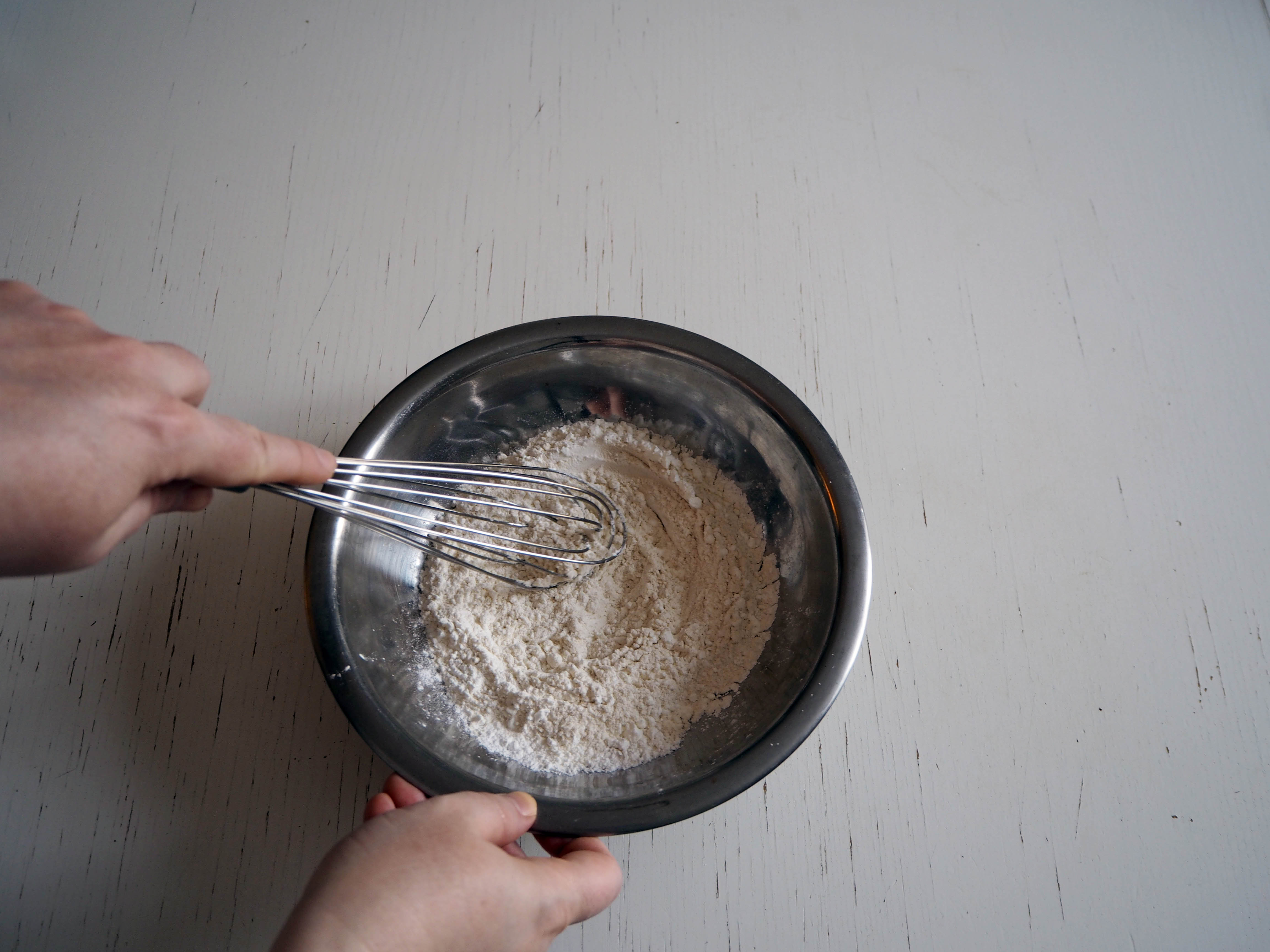 2. For eggplant katsu, combine the dry ingredients (flour, starch, baking powder, salt) and whisk a little.