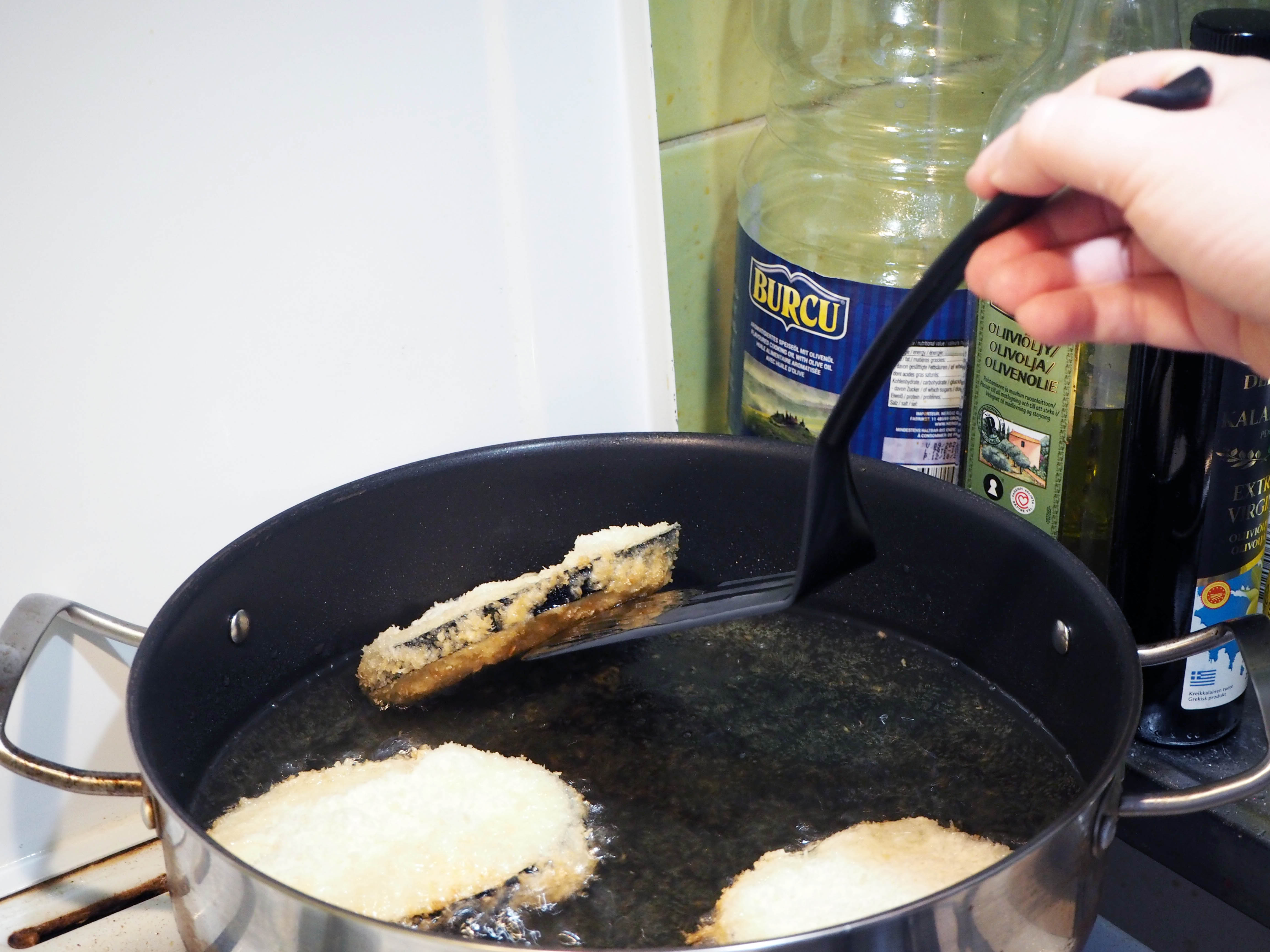 6. Fry the eggplant slices in the hot oil, about 3-4 minutes for each side. Do not overcrowd your pan (I fried mine in 2 batches, 3+3). When you have nicely browned sides, take them out of the pan using a slotted spoon and let them cool down.