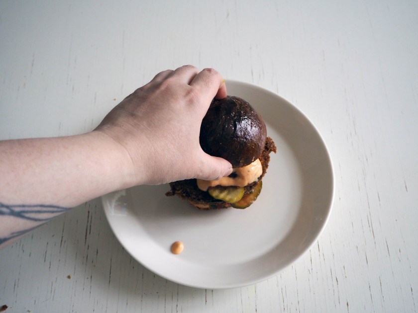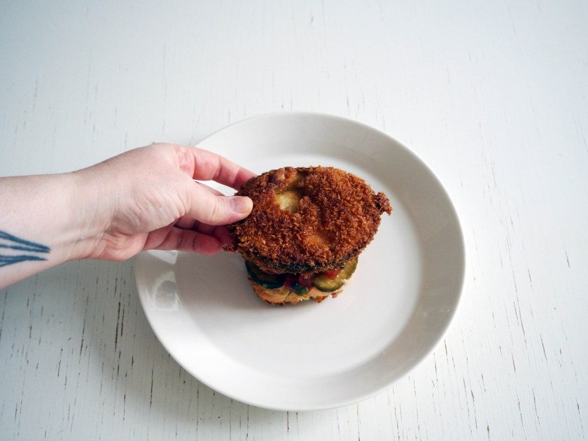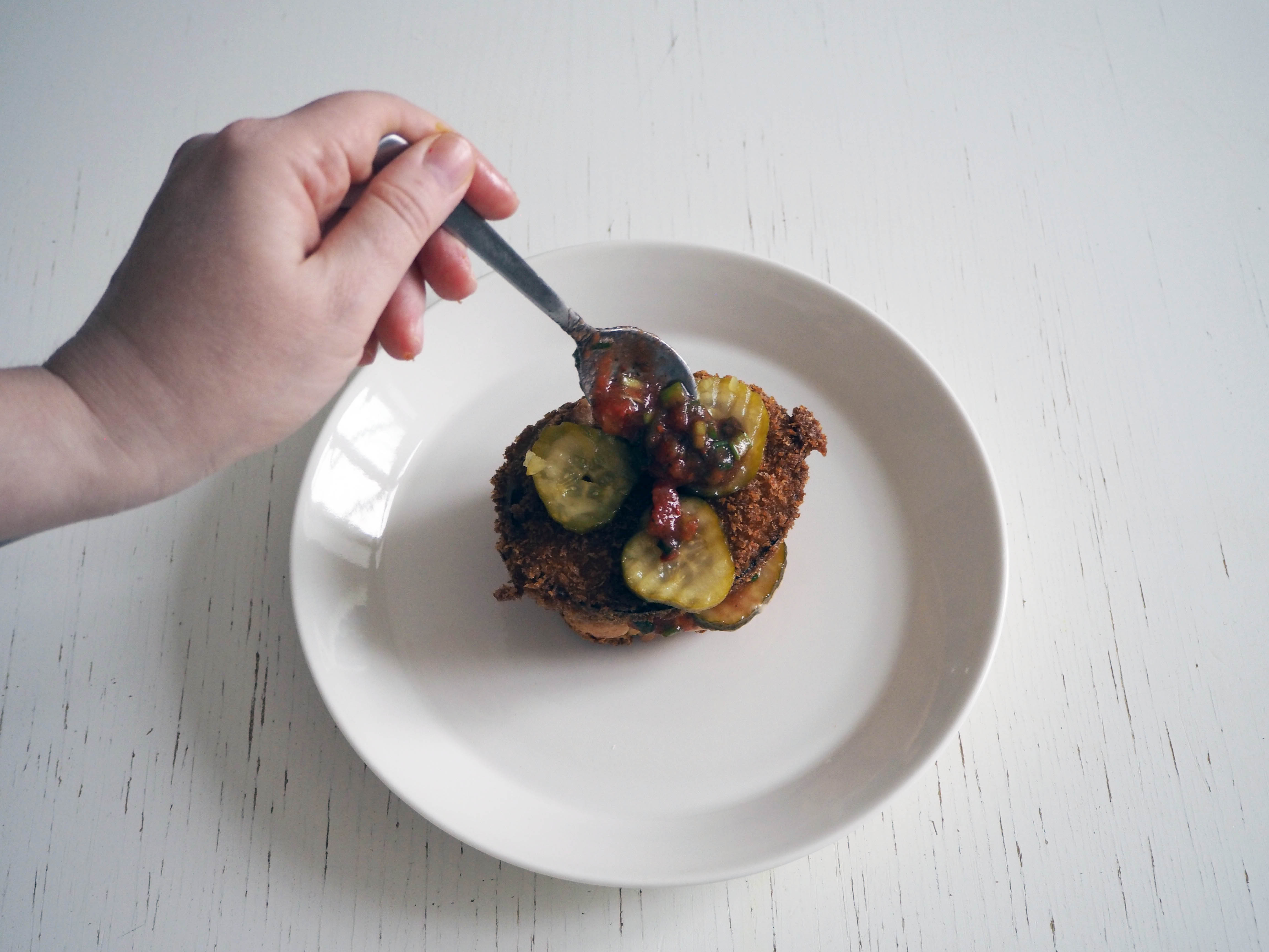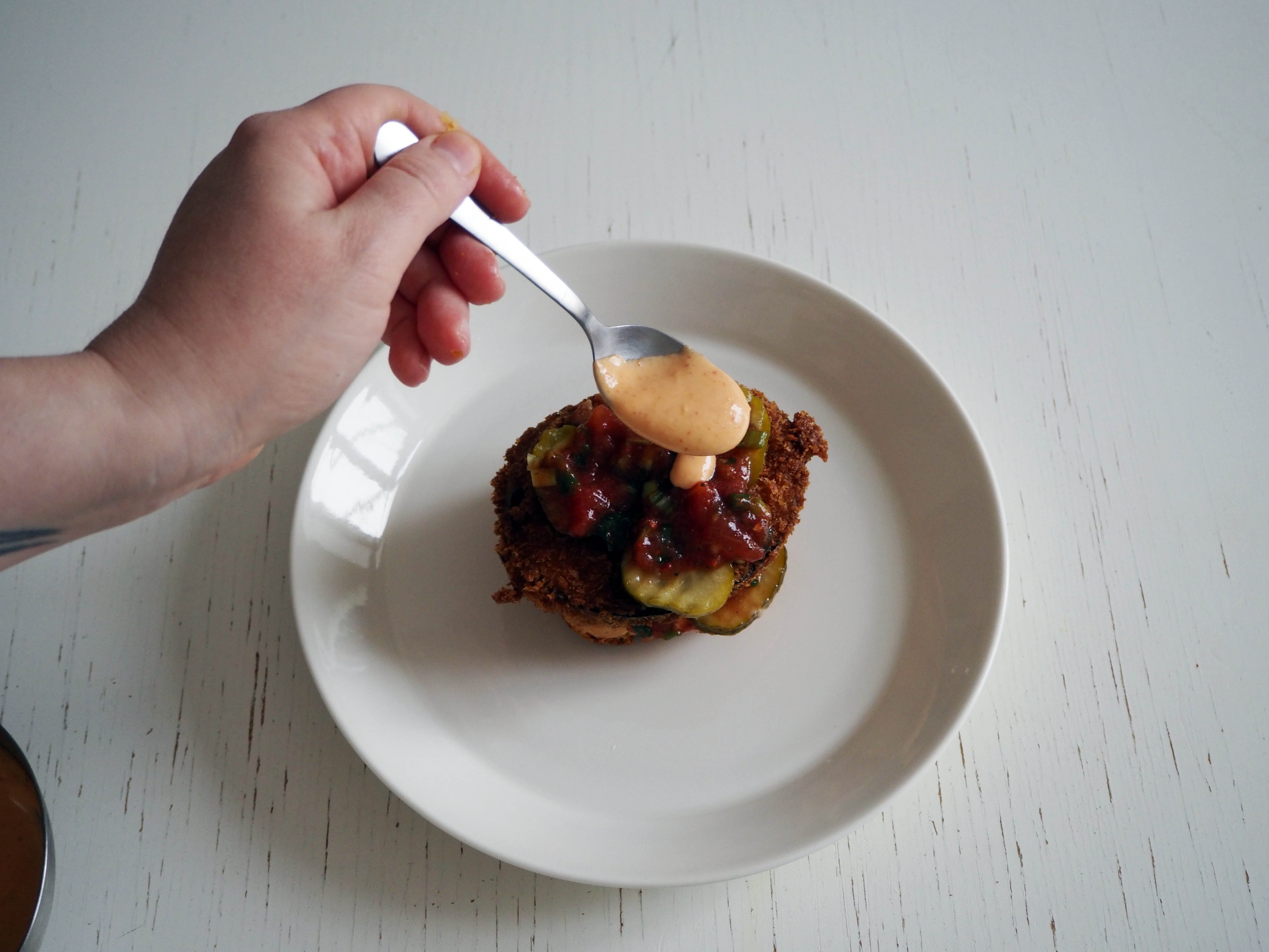 7. Assembly time! Cut the buns in two. Assemble the burger in the following order: mayo sauce, pickled cucumber, hot sauce, eggplant katsu, pickled cucumber, hot sauce and mayo sauce. You can add other stuff you like putting in a burger, like greens. Serve with a light salad. Enjoy!
