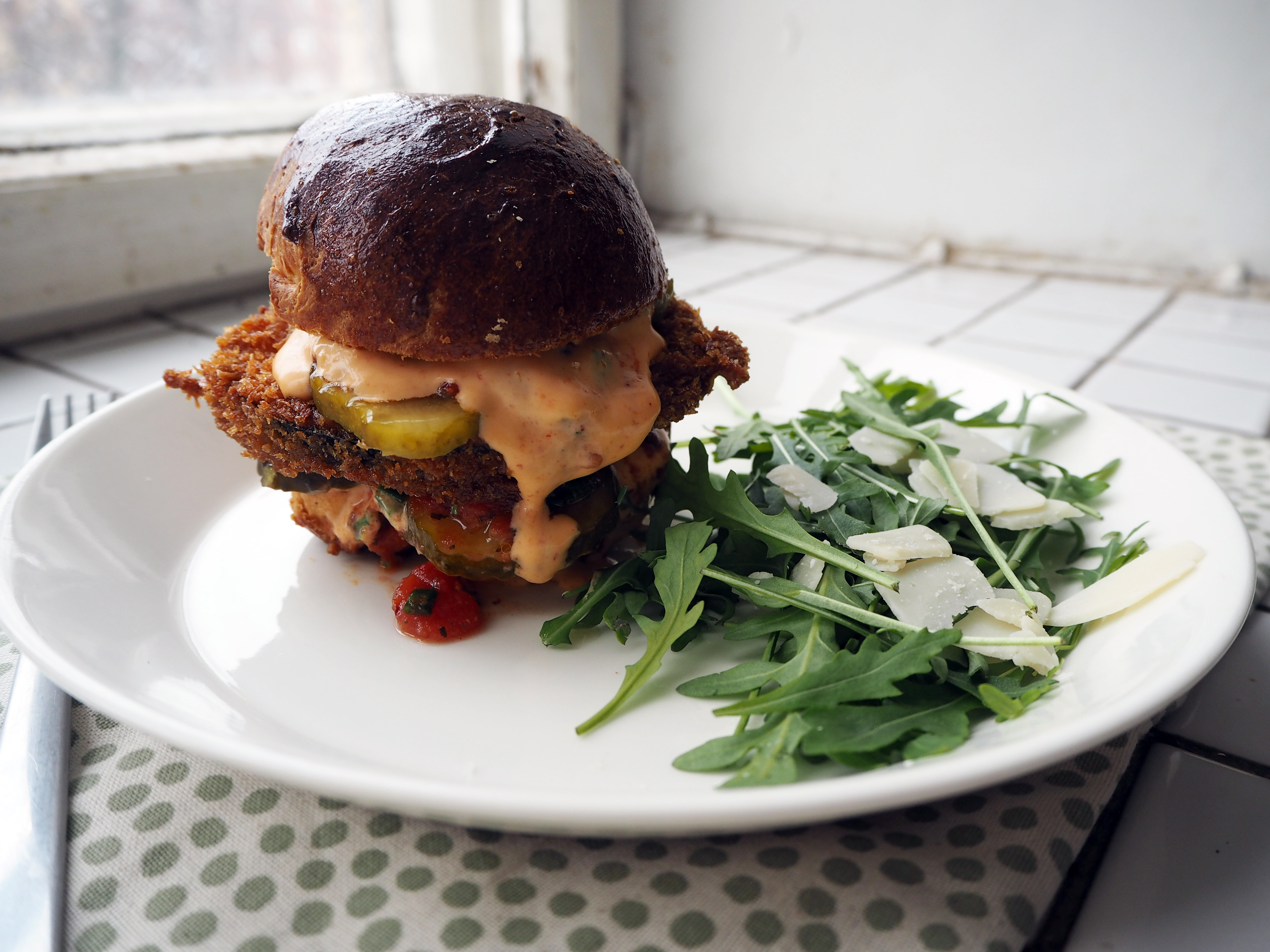 Eggplant Katsu And Brioche Burger With Spicy Hot Sauce