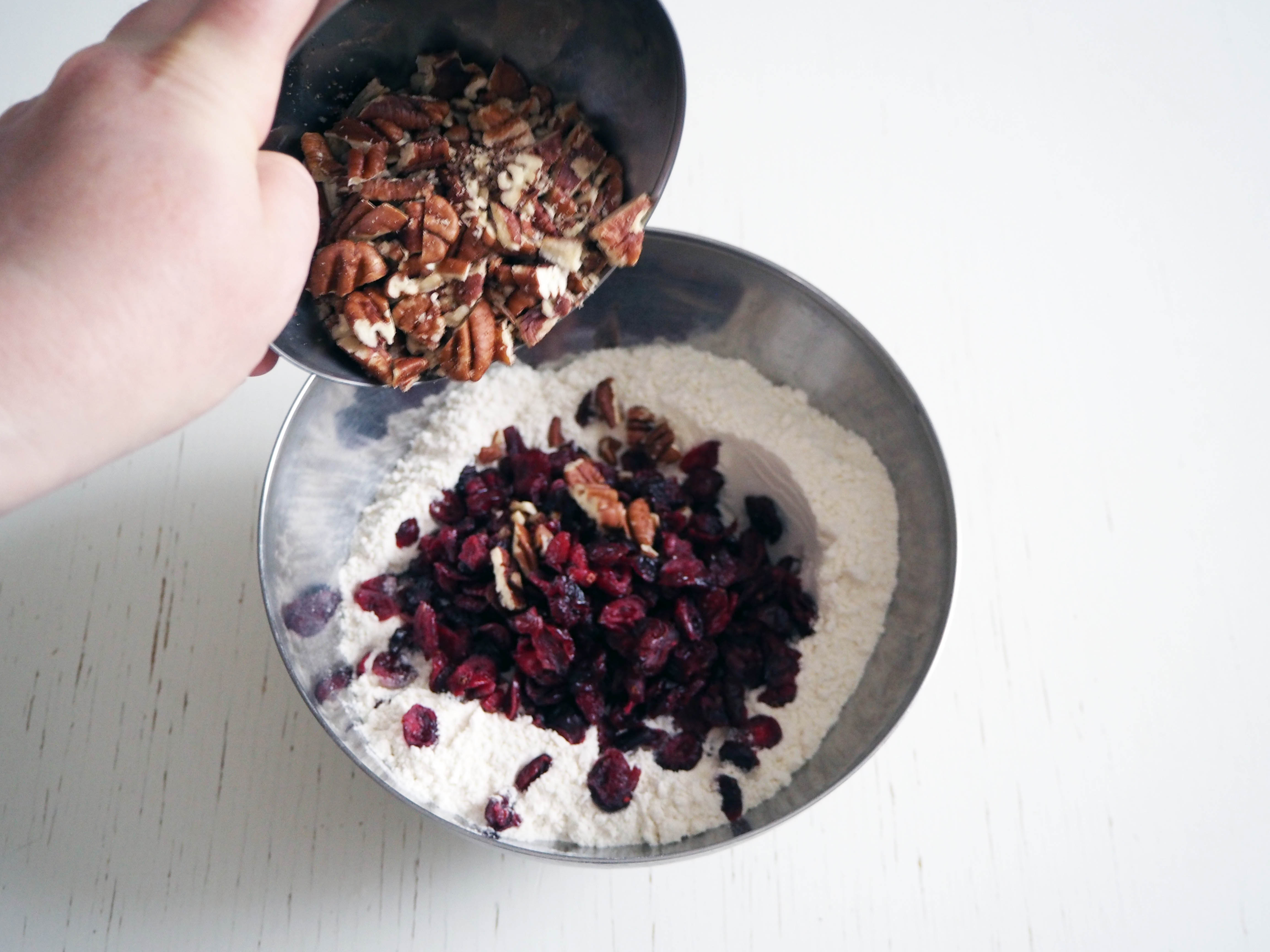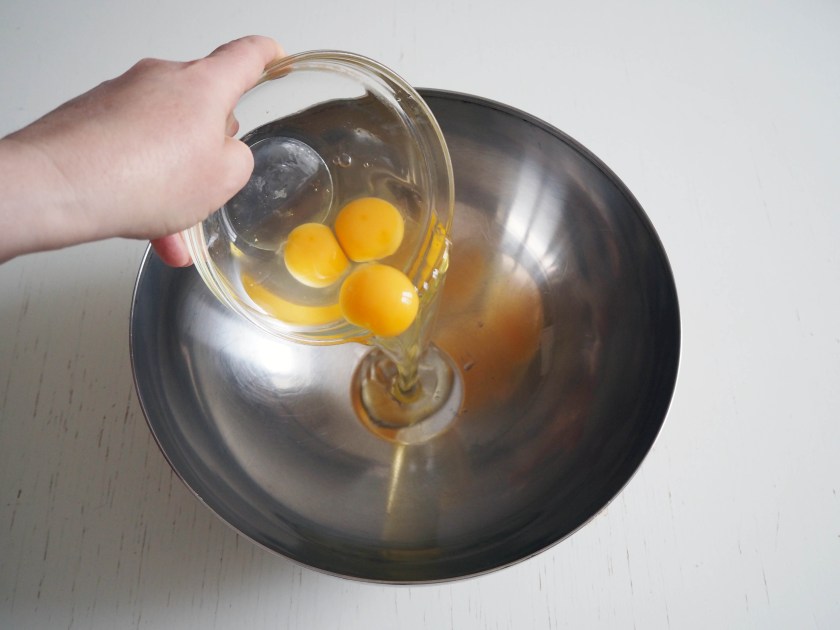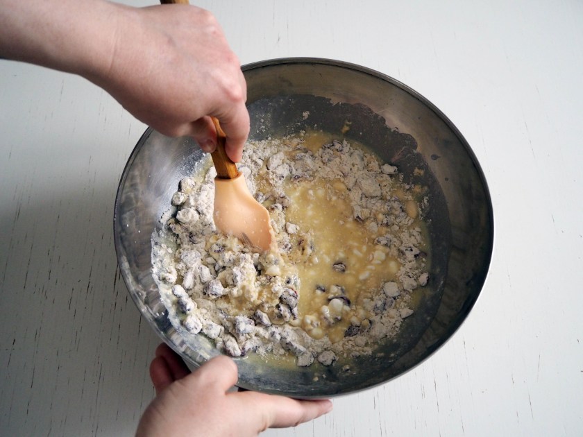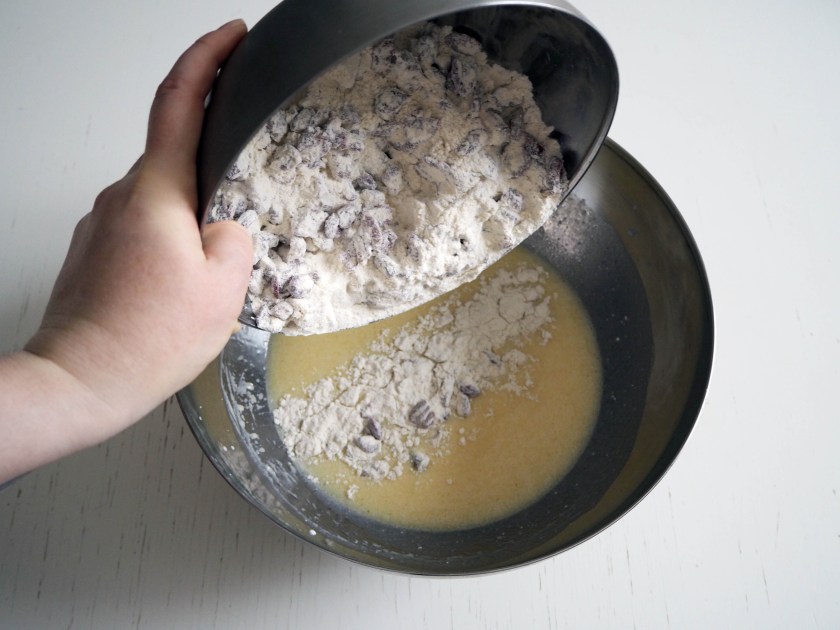 7. Add the dry ingredients mixture to the egg mixture and fold until everything is wet.