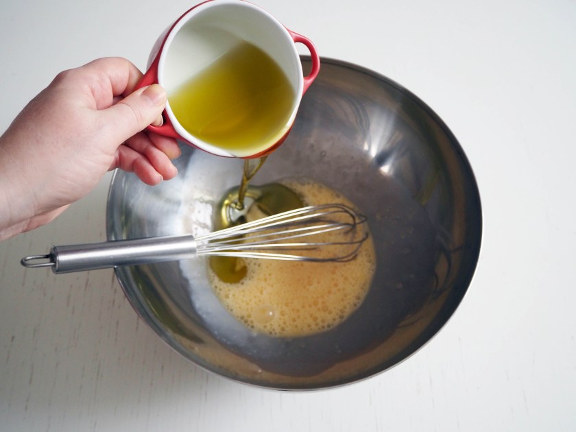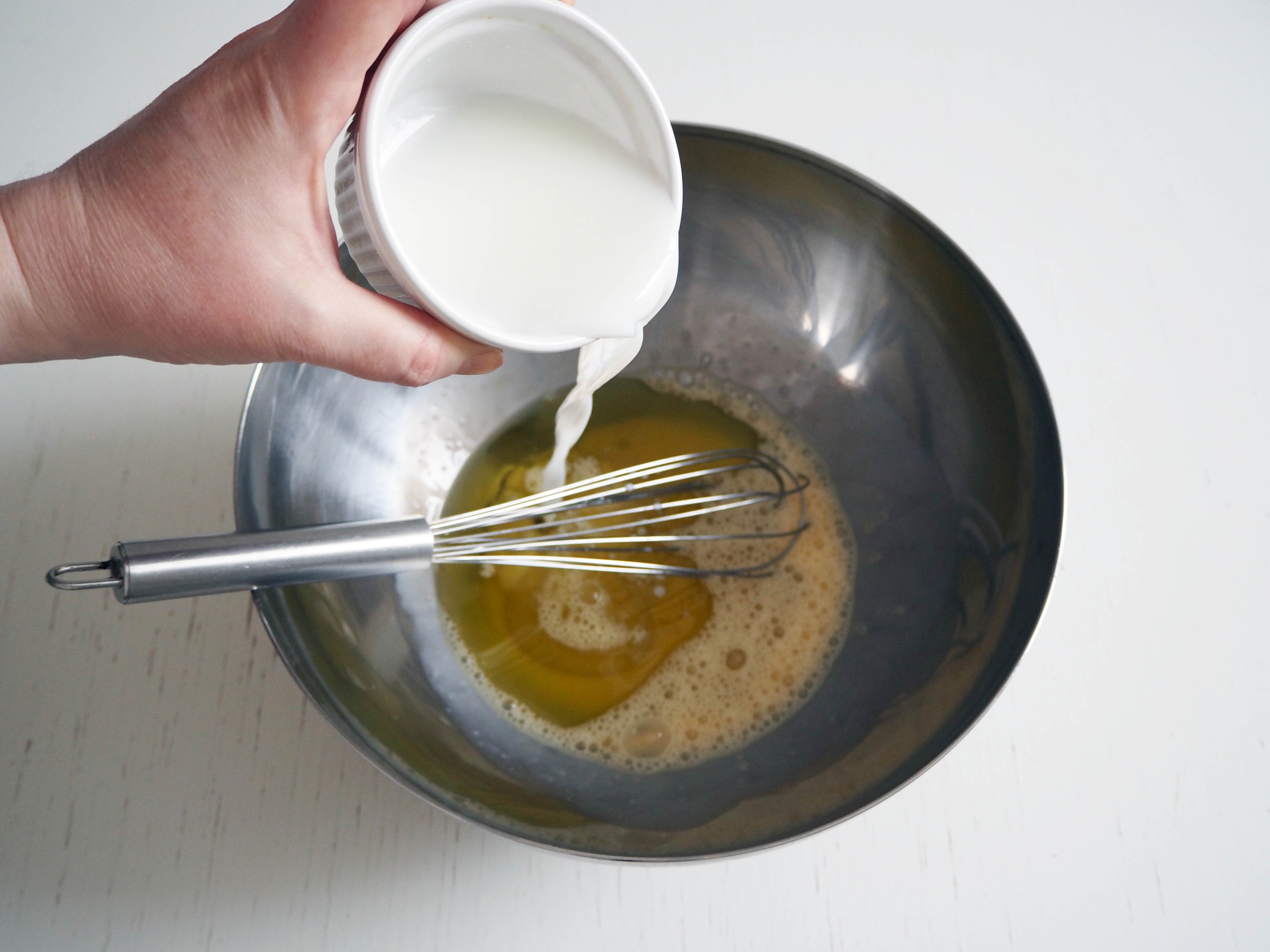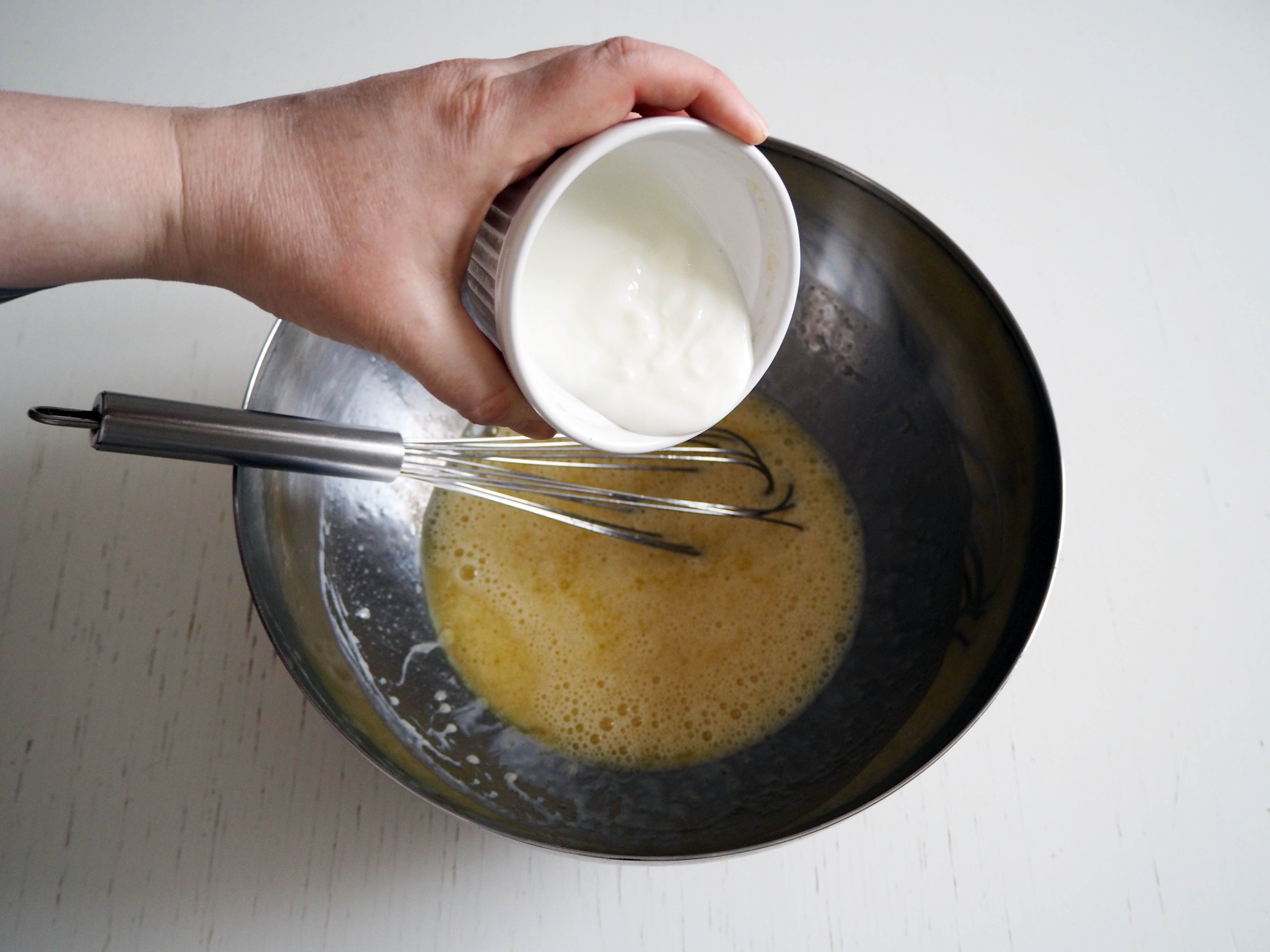5. Add olive oil, milk and yoghurt and whisk until smooth.