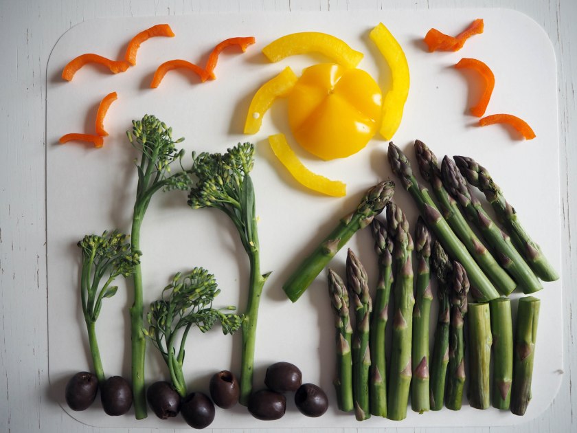 I put a happy little asparagus cabin on the right. Maybe a few broccolini trees on the left. Then I thought, how about a happy yellow sun right in the middle? And of course, let’s not forget a little path of olives to our cabin and a few sweet red pepper birds in the sky.