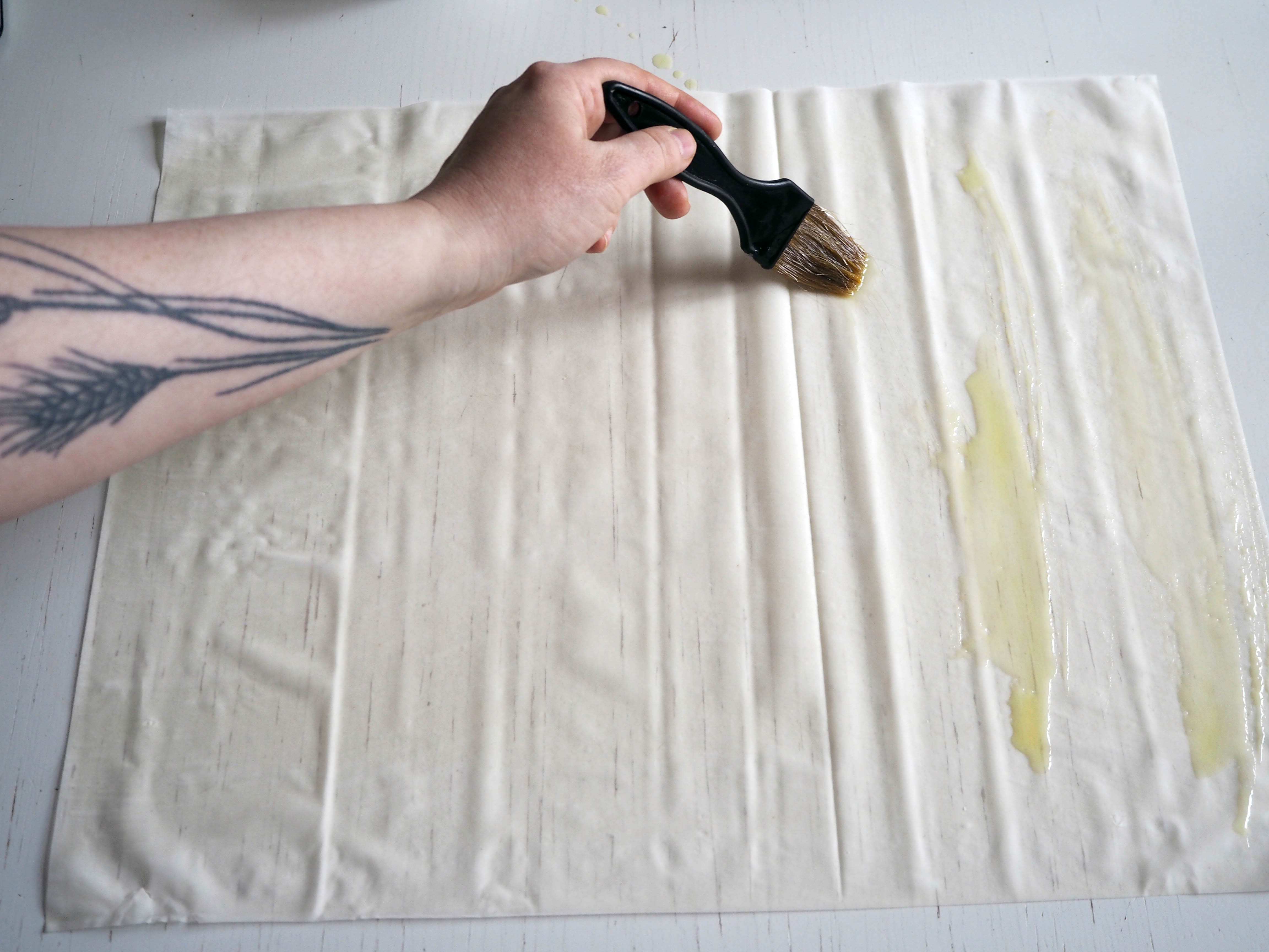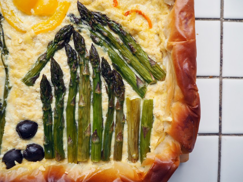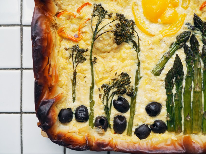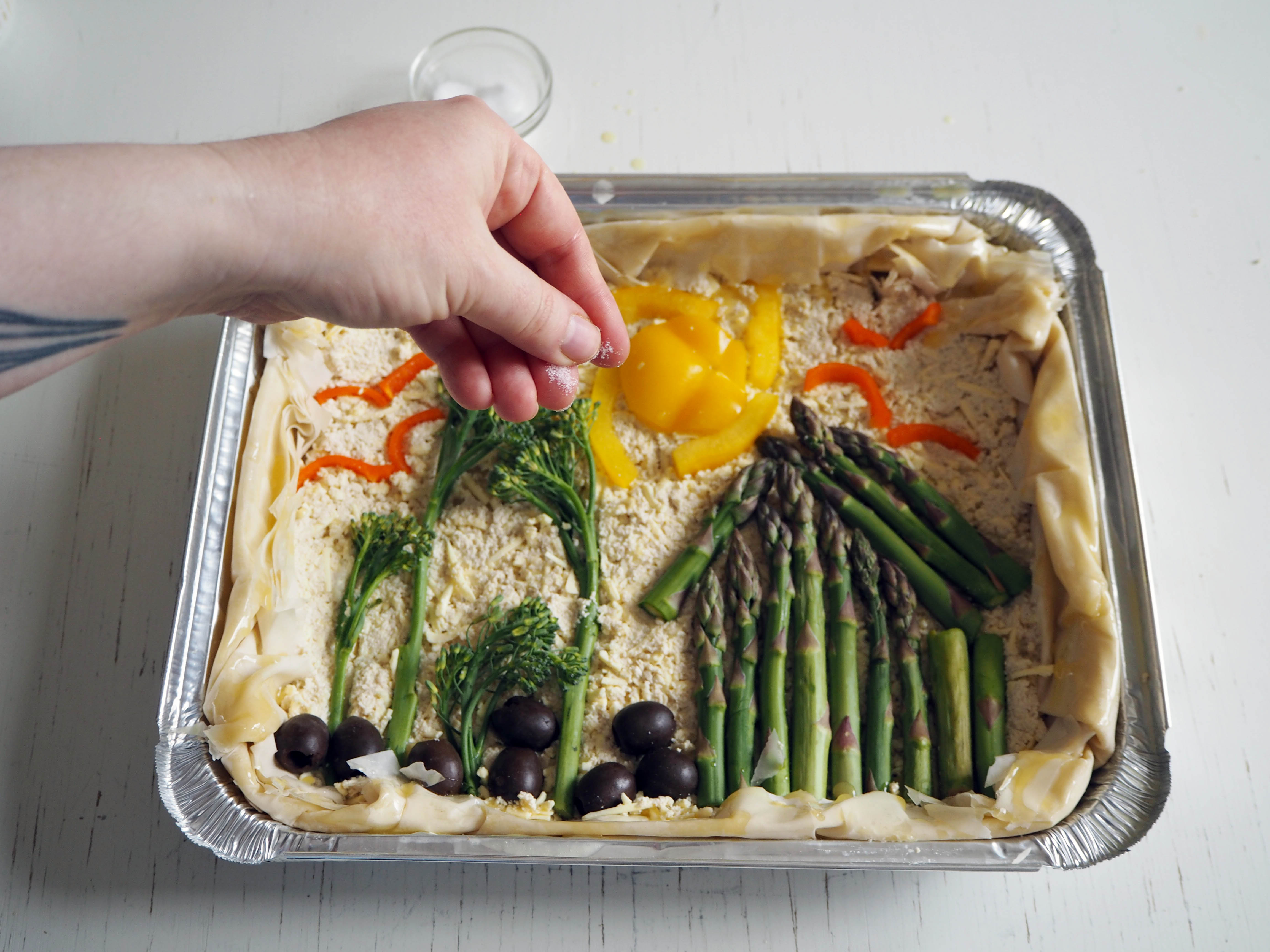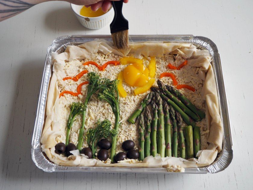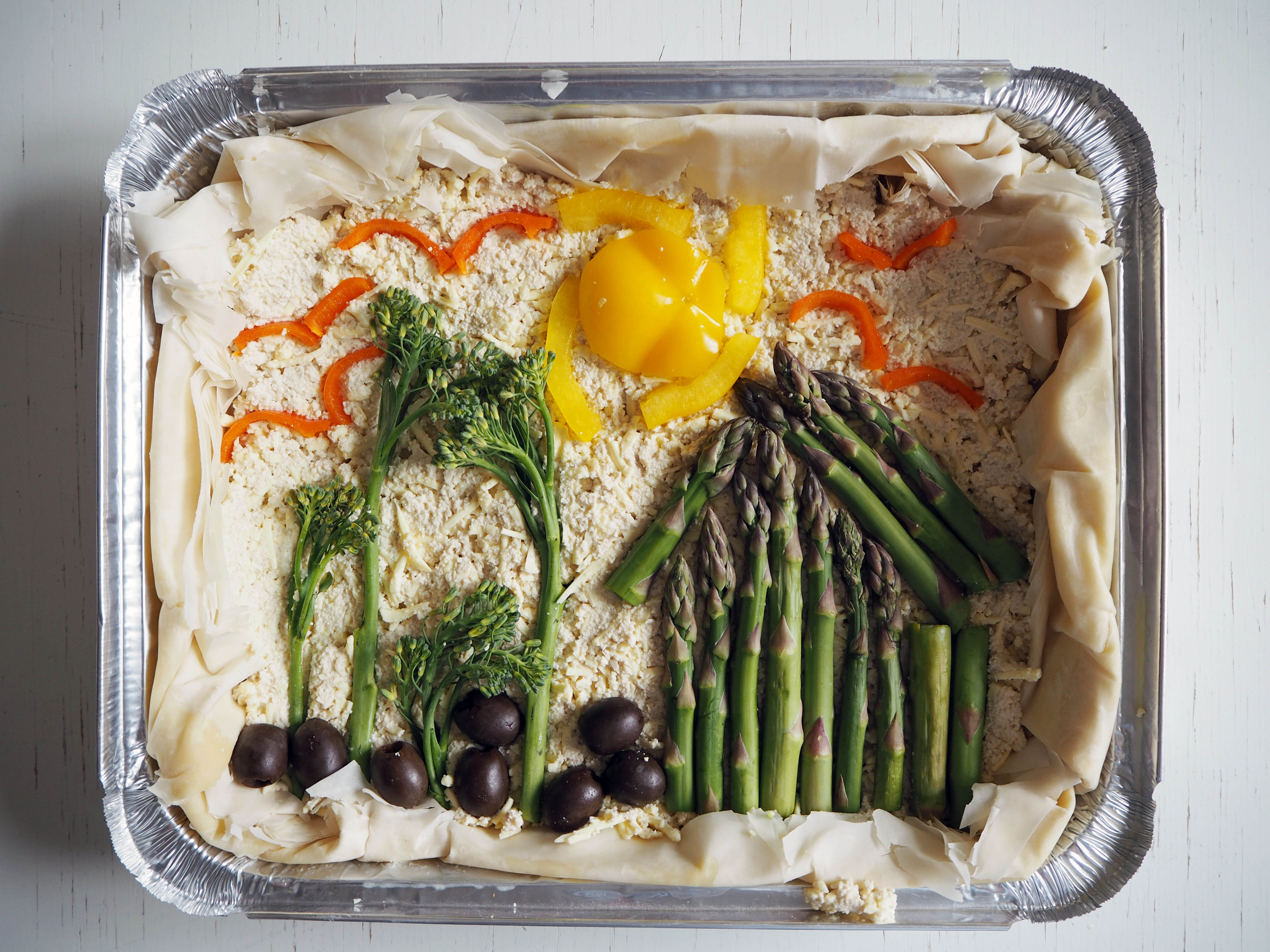 For my canvas, I used a garlicky tofu-vegan cheese filling. Phyllo sheets were the base and the frame, of course. Then I started painting with the vegetables.