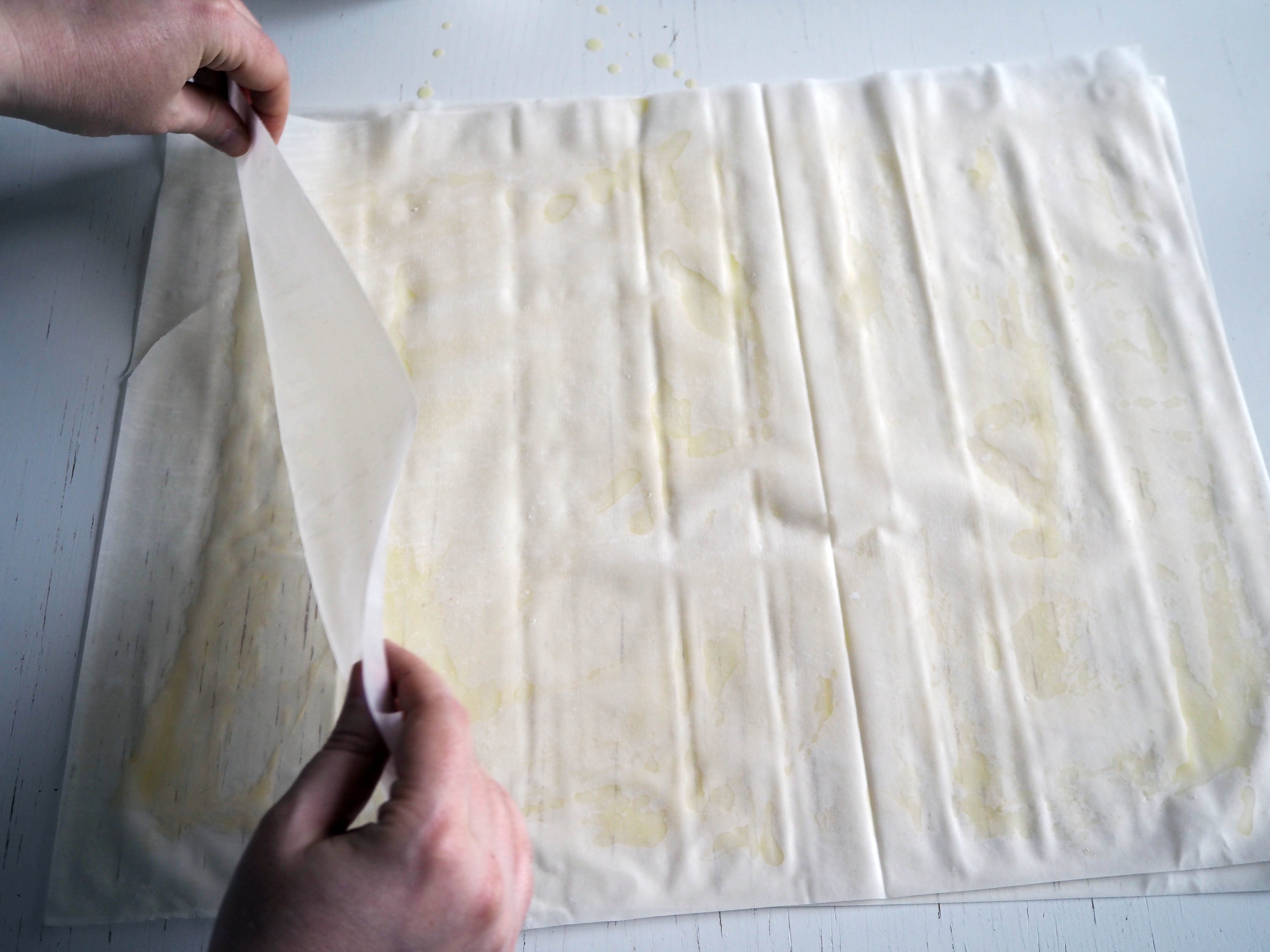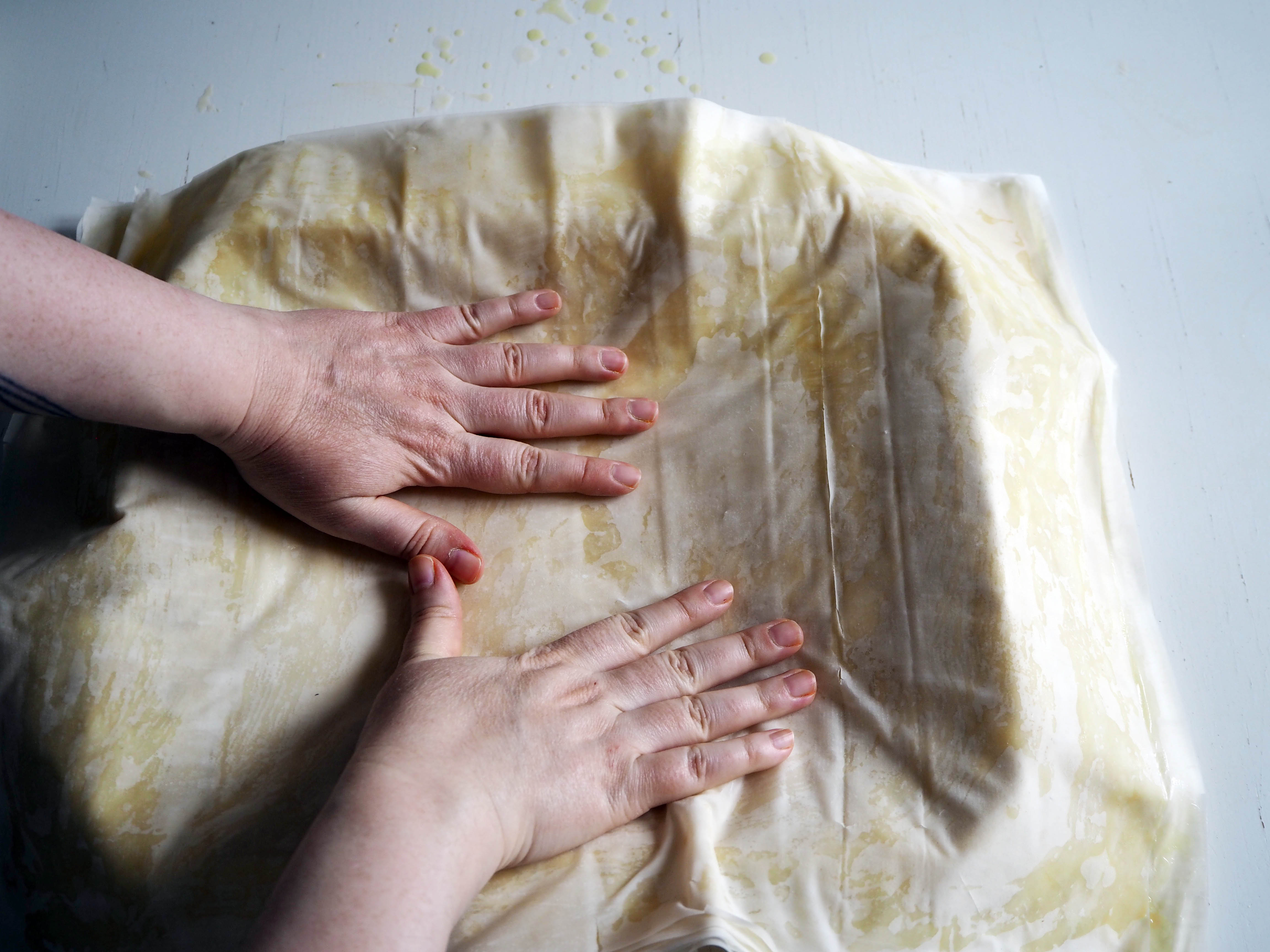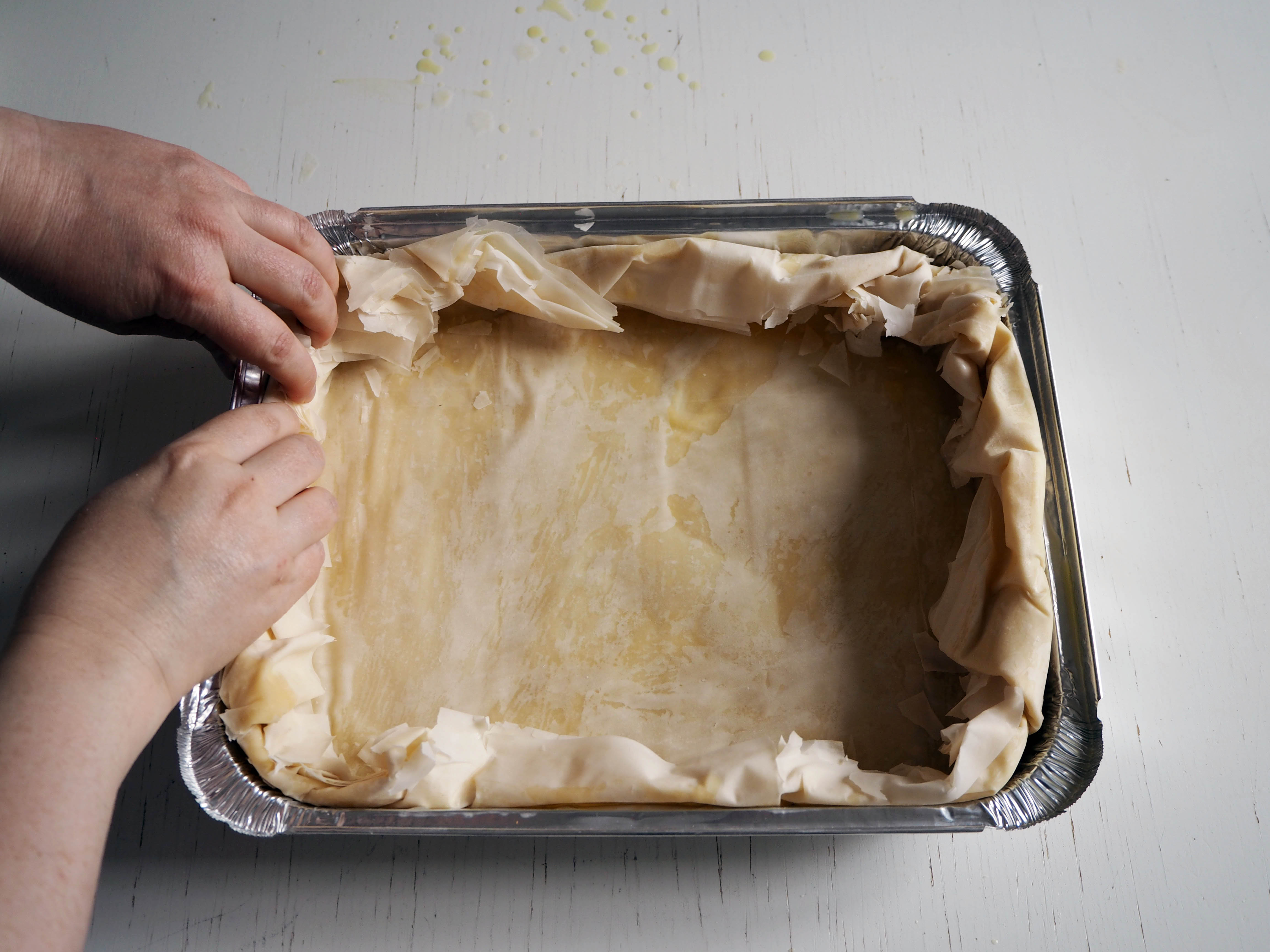 3. Put the phyllo sheets “glued” with melted butter on the oven dish and gently press to take the shape of the dish. Pinch the excess sheets on the edges to create a “frame”.