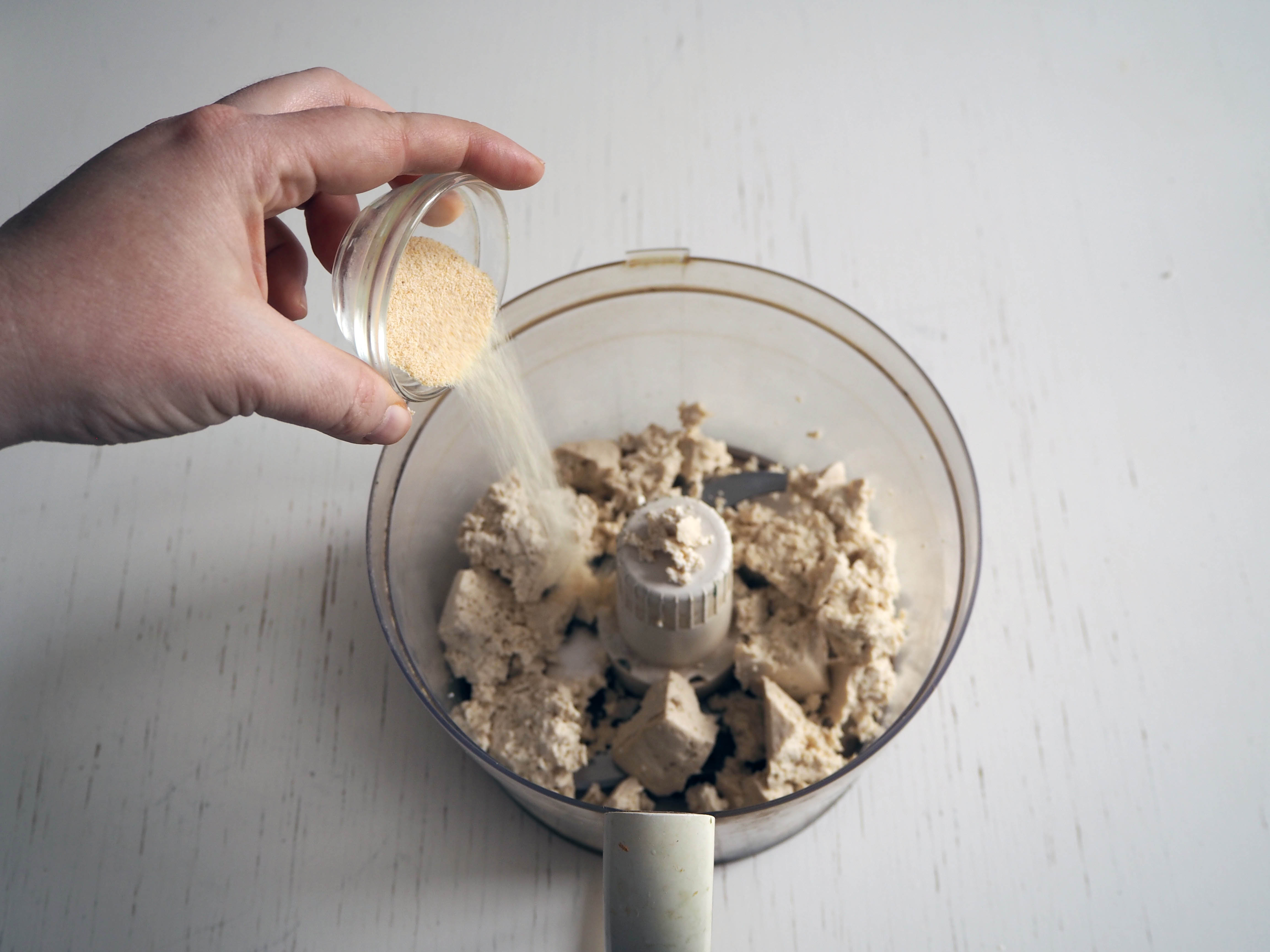 4. Put tofu, salt and garlic powder in a food processor and process until tofu is entirely broken.