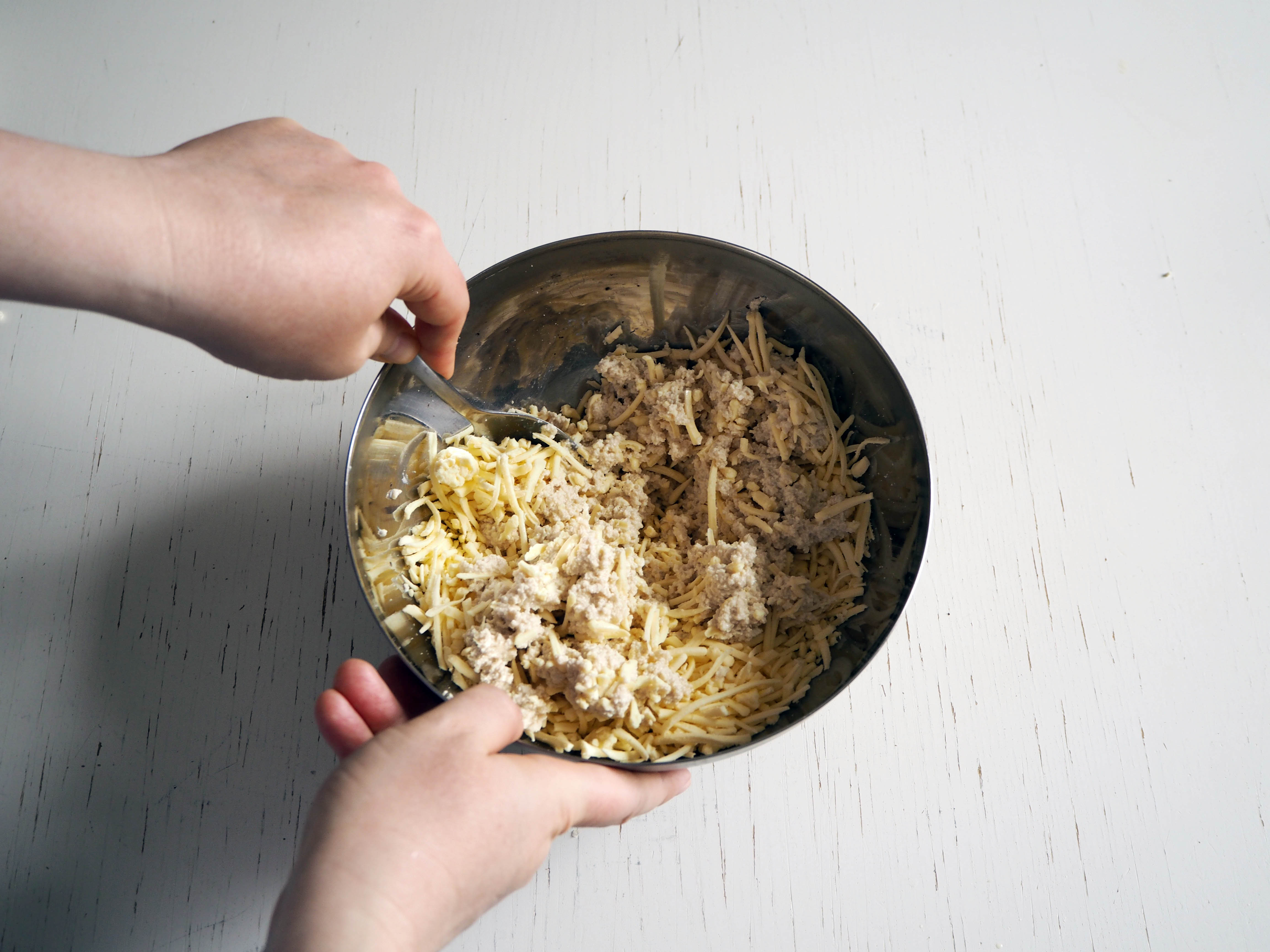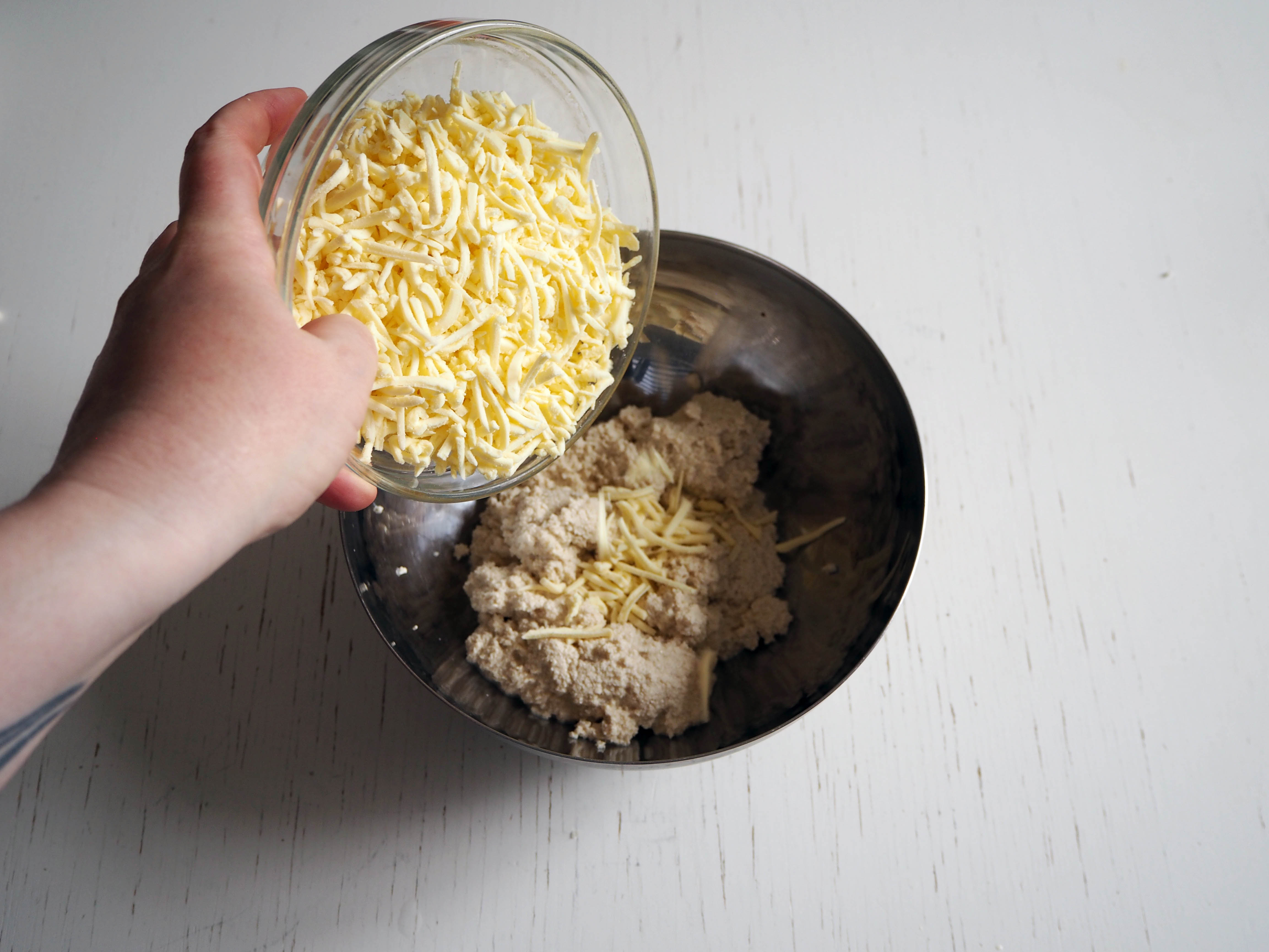 6. Transfer the tofu paste into a bowl and add grated vegan cheese. Mix well.