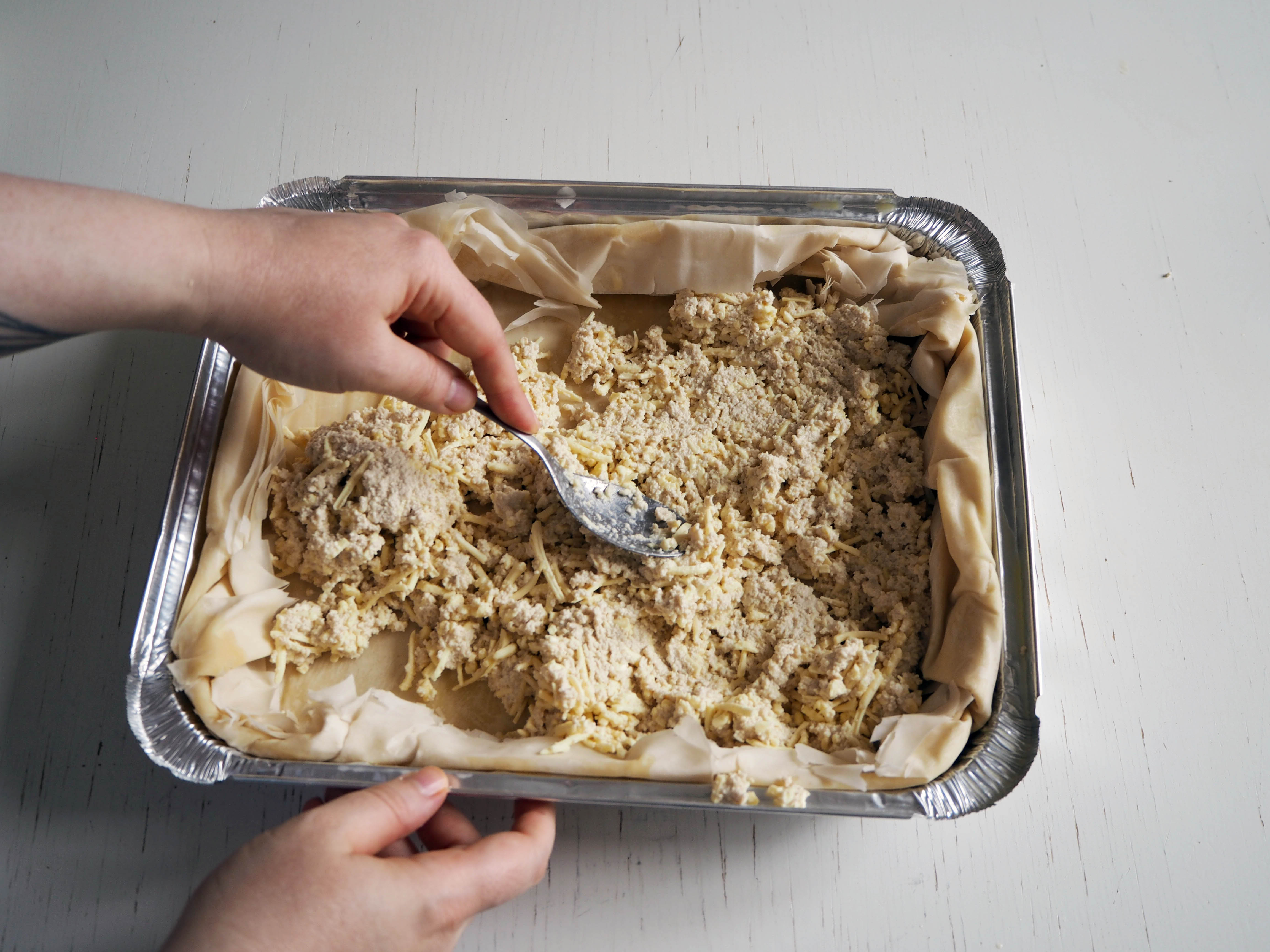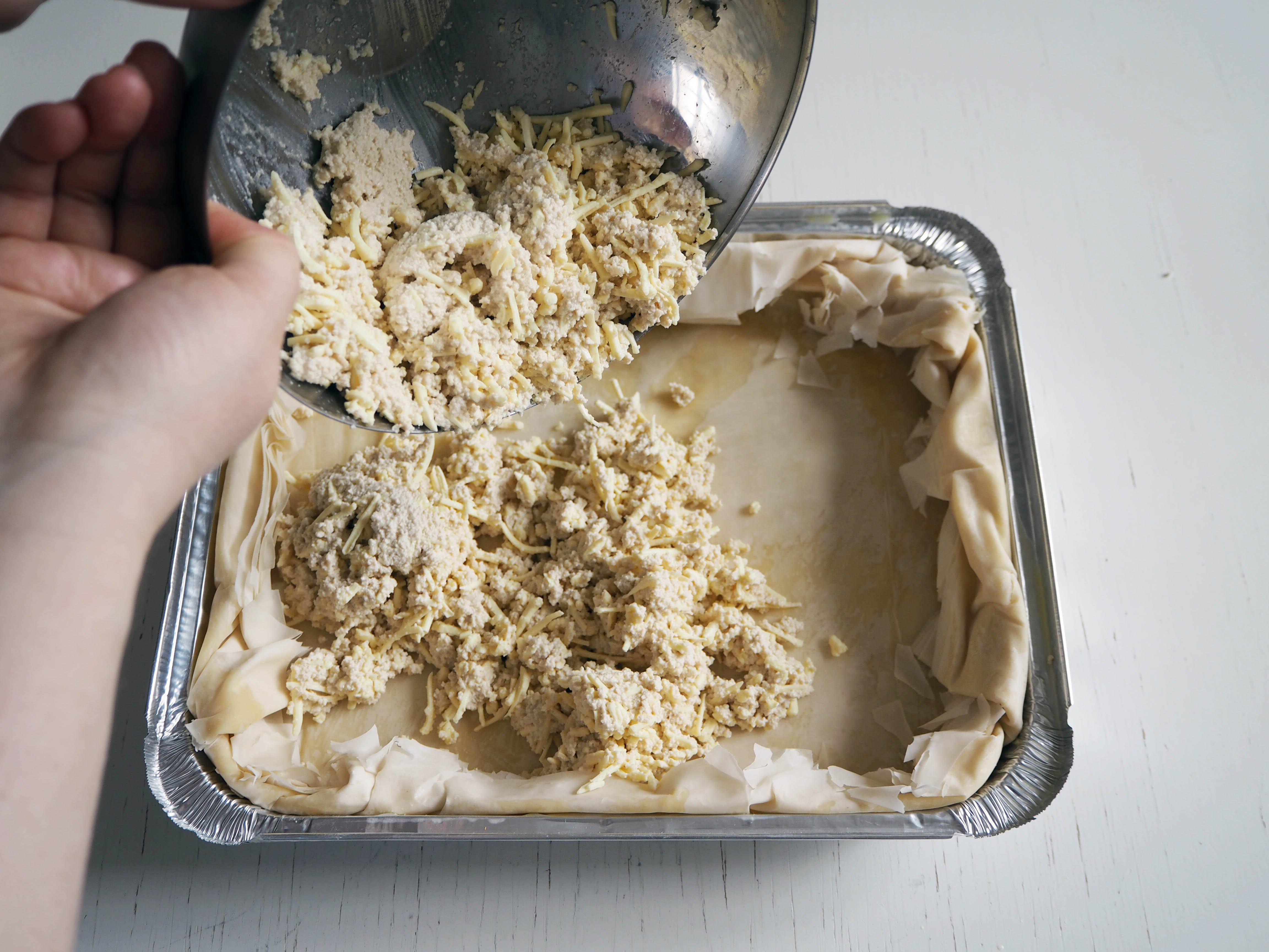 7. Spread the tofu mixture into the phyllo pie base evenly and smoothen the surface with a spatula or just the back of a spoon.