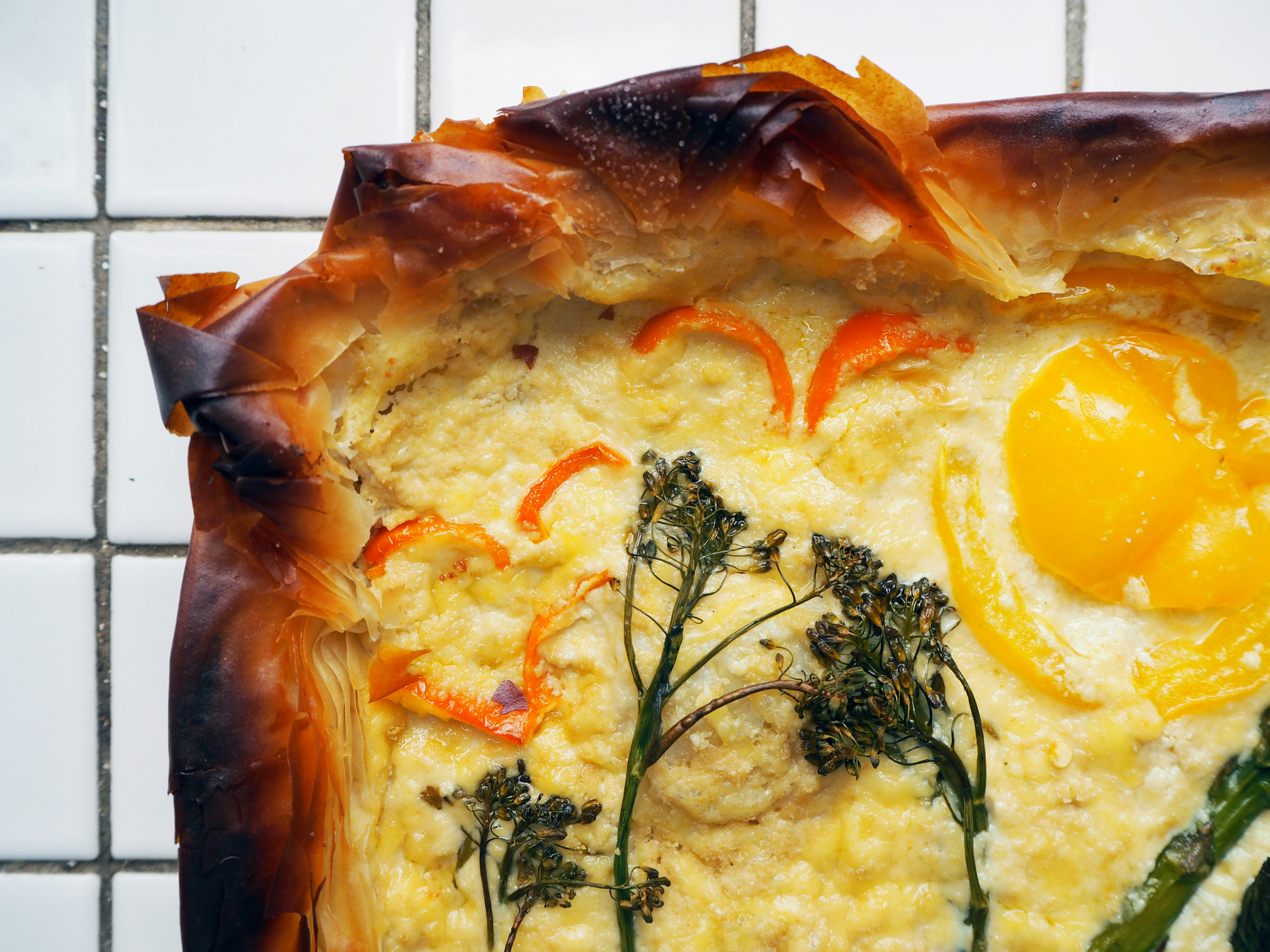 9. Brush the phyllo edges with the remaining melted butter. Spread a little salt on top and drizzle with olive or vegetable oil. Put in the medium part of the oven and bake for 22-25 minutes, until the phyllo edges are nicely browned and the vegetables are tender. After taking the pie out of the oven, let it cool for at least half an hour before transferring it to a wire rack. If your pie is delicate, you can also leave it in the pie dish. NOTE: The vegetables might get buried in the filling while baking. In this case, just move them on top of the filling using a knife right out of the oven. Enjoy!