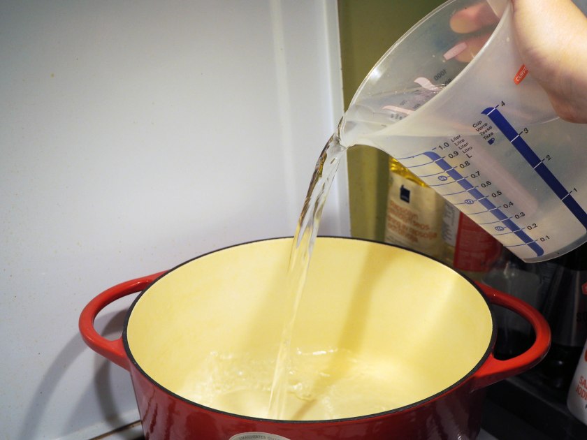 - In a large pot, put water and vegetable stock cube (if using) on medium-high heat and bring it to a boil.