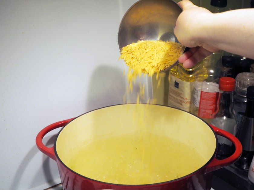 2. Add orzo and cook it for 10 minutes. Stir frequently to prevent orzo from sticking to the bottom of the pot and each other.