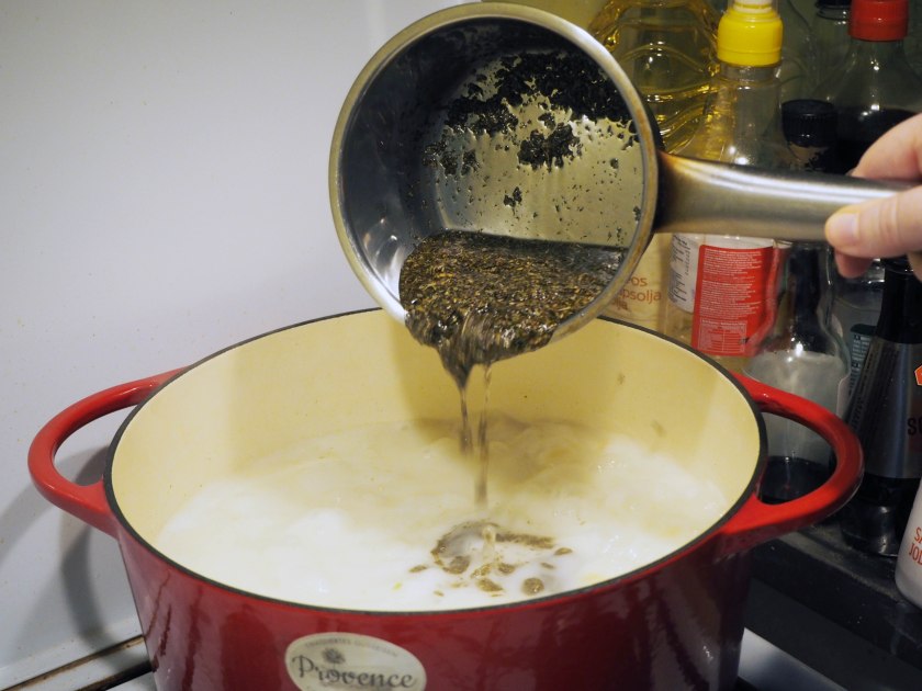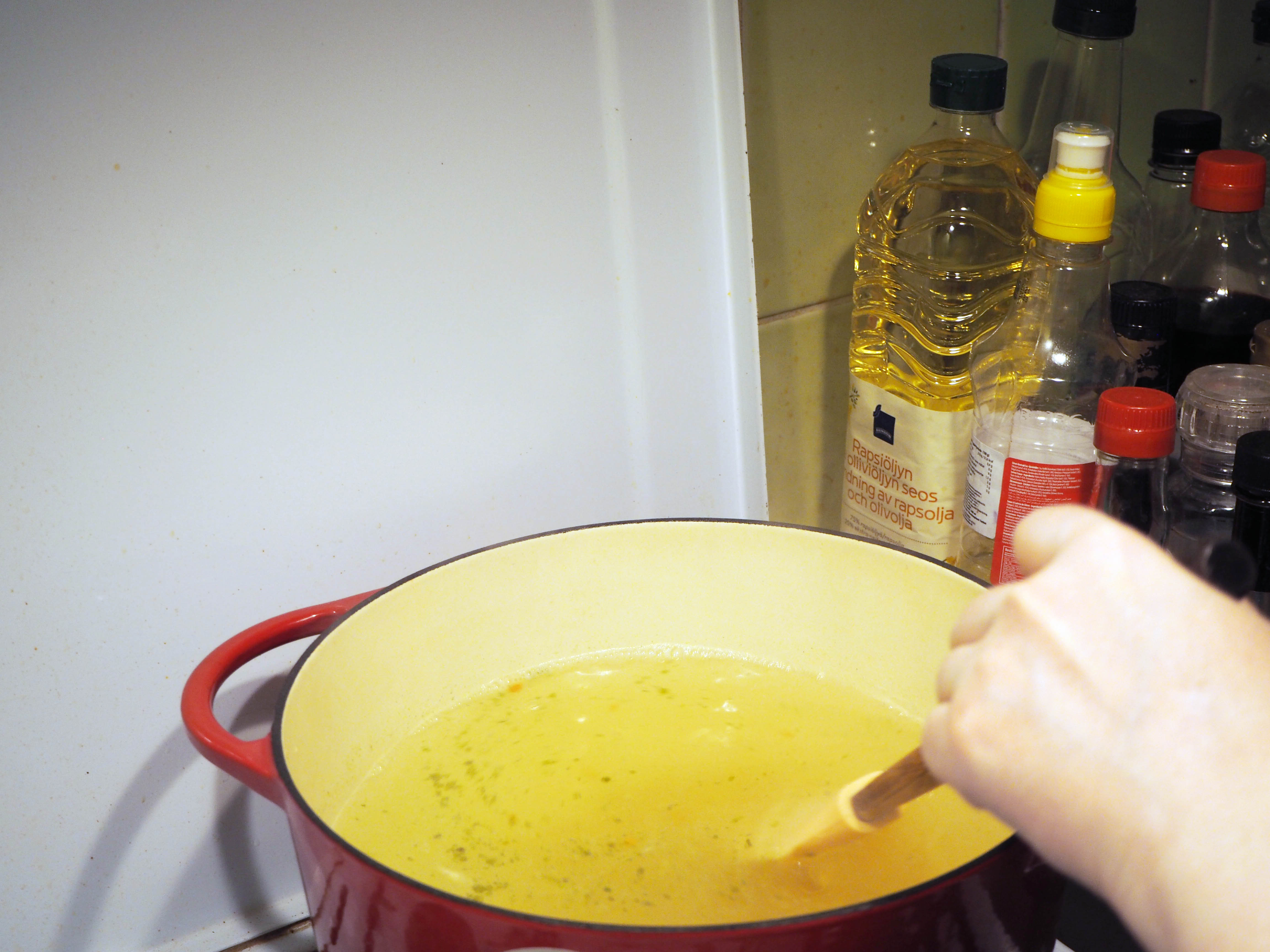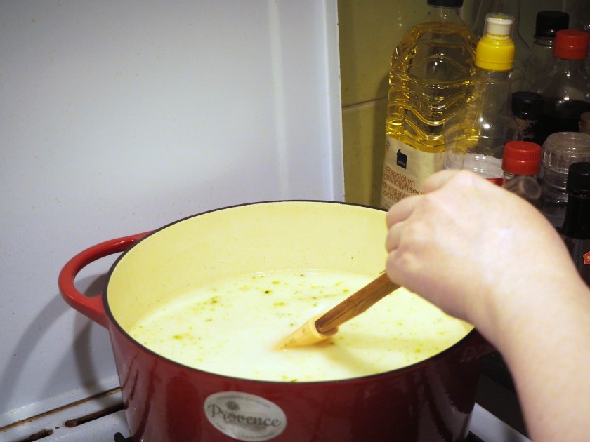 5. Pour the yoghurt mixture back into the pot and stir. Lower the heat to medium and let the soup continue cooking.