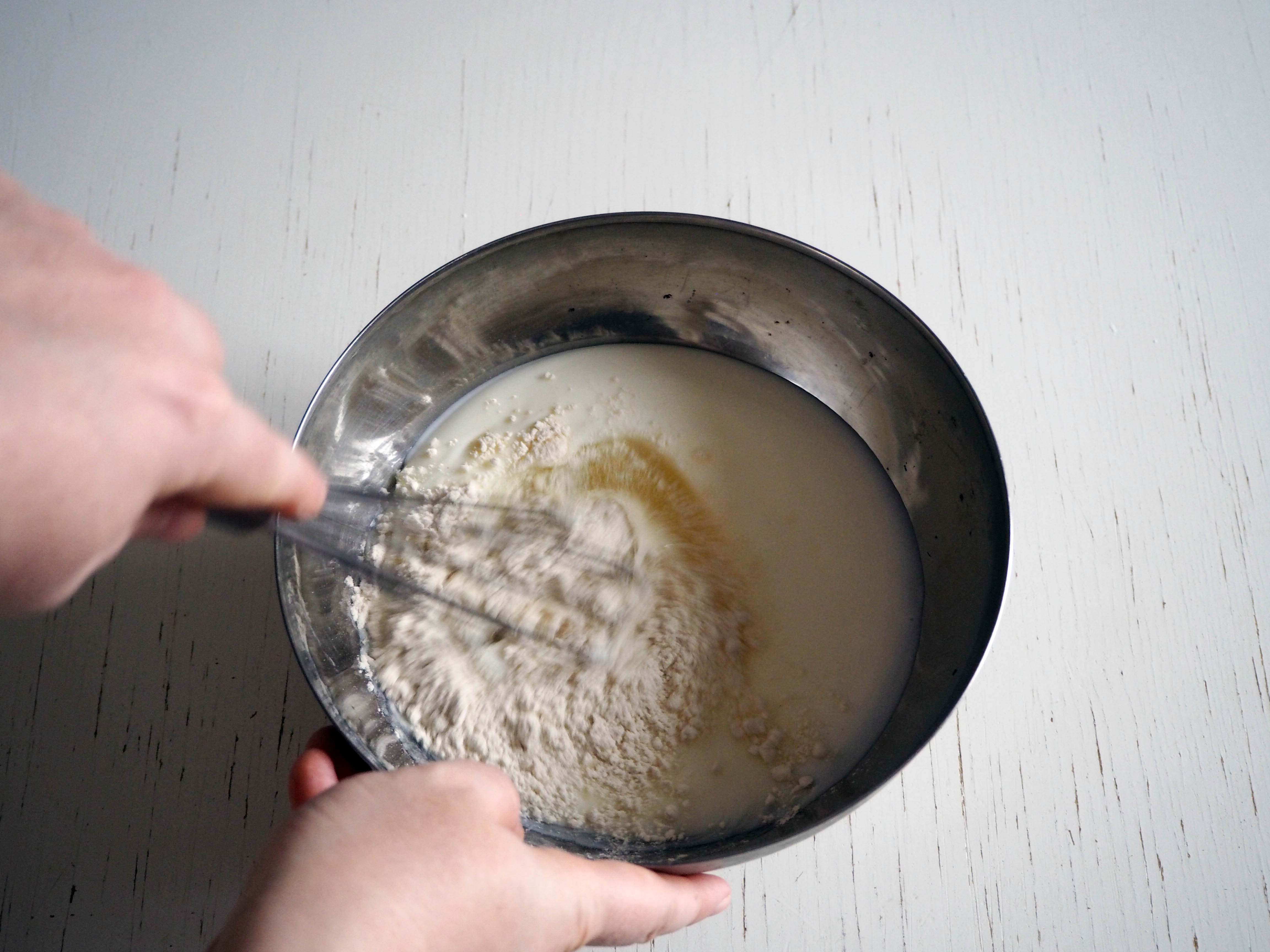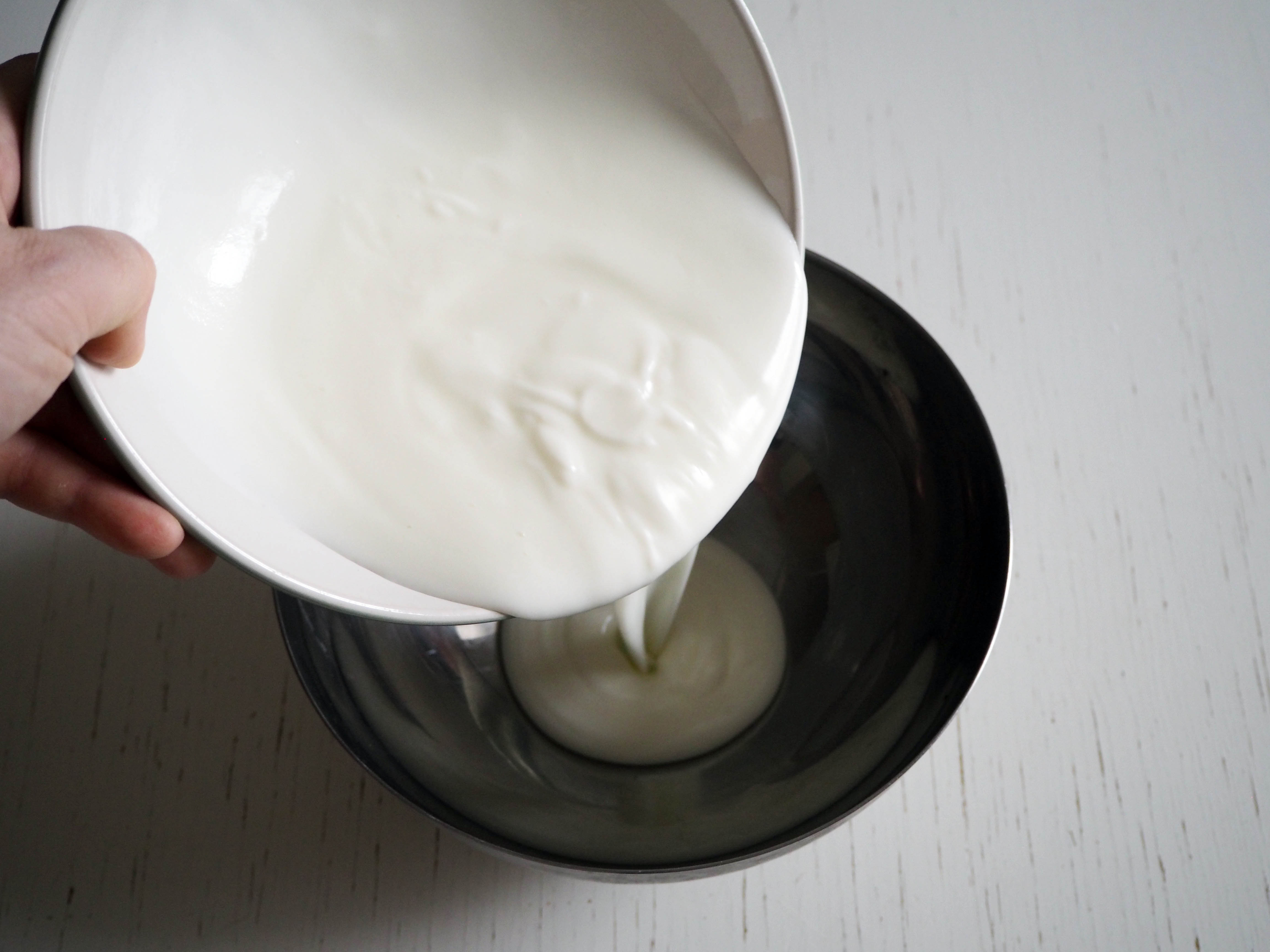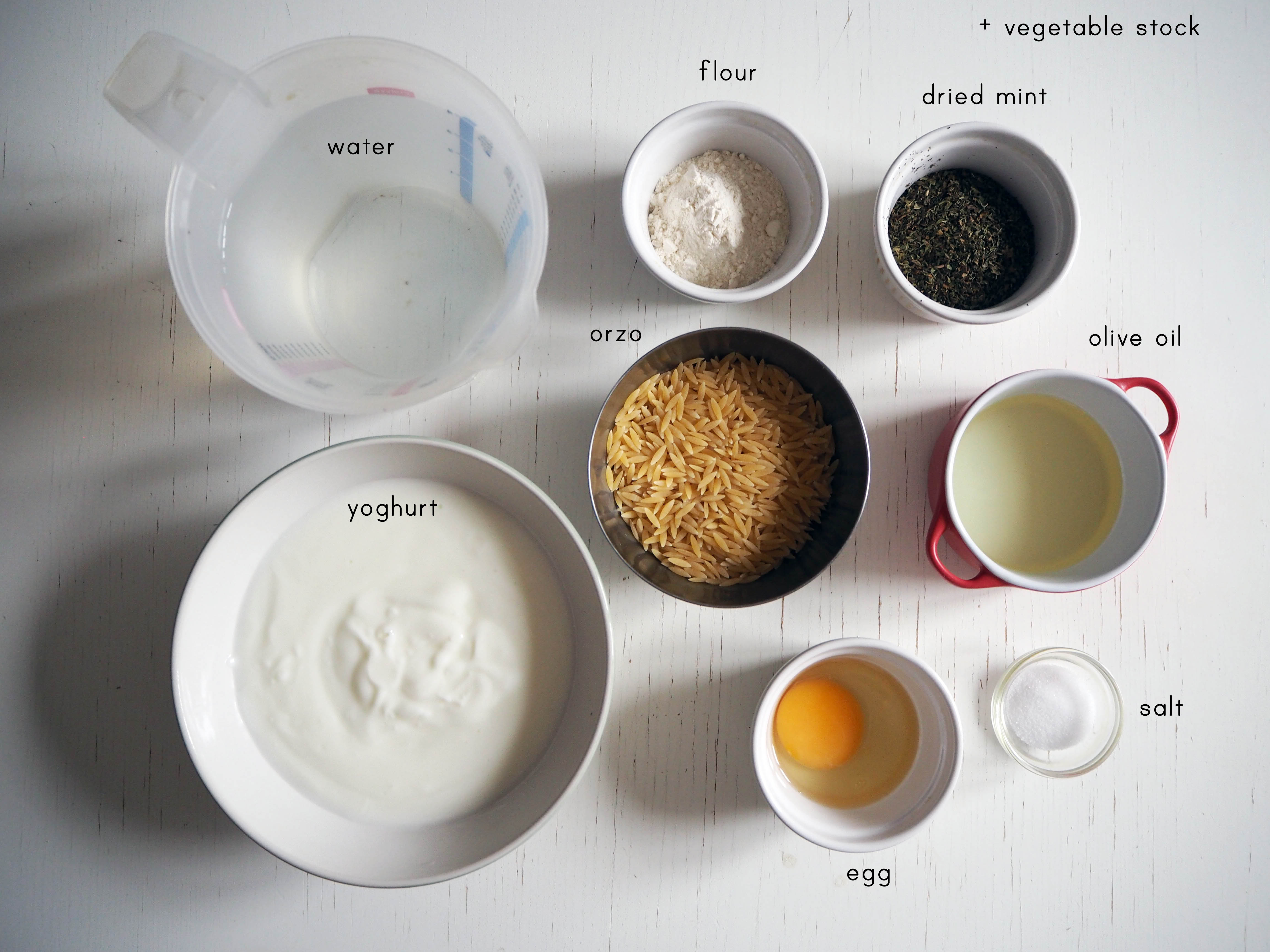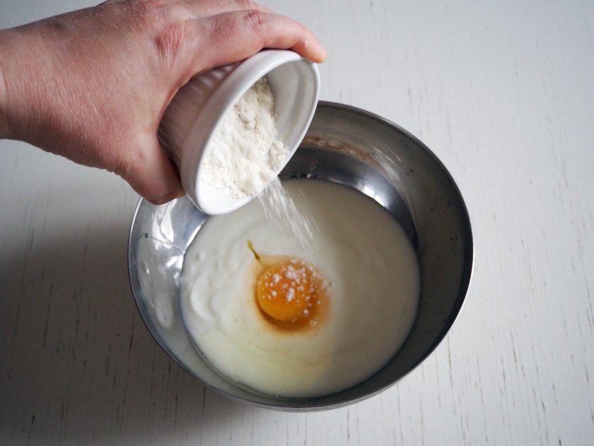3. While orzo is cooking, put yoghurt, egg and flour in a medium bowl and whisk well.