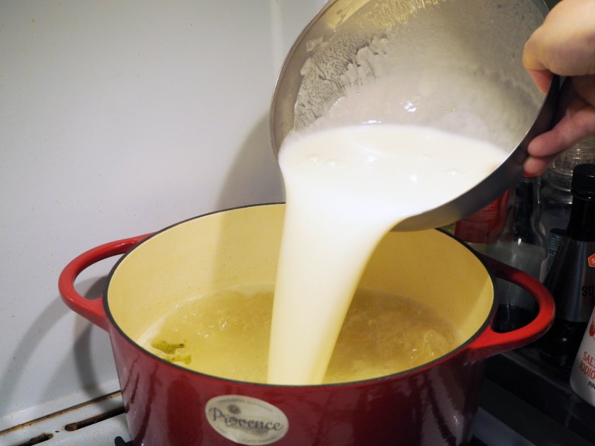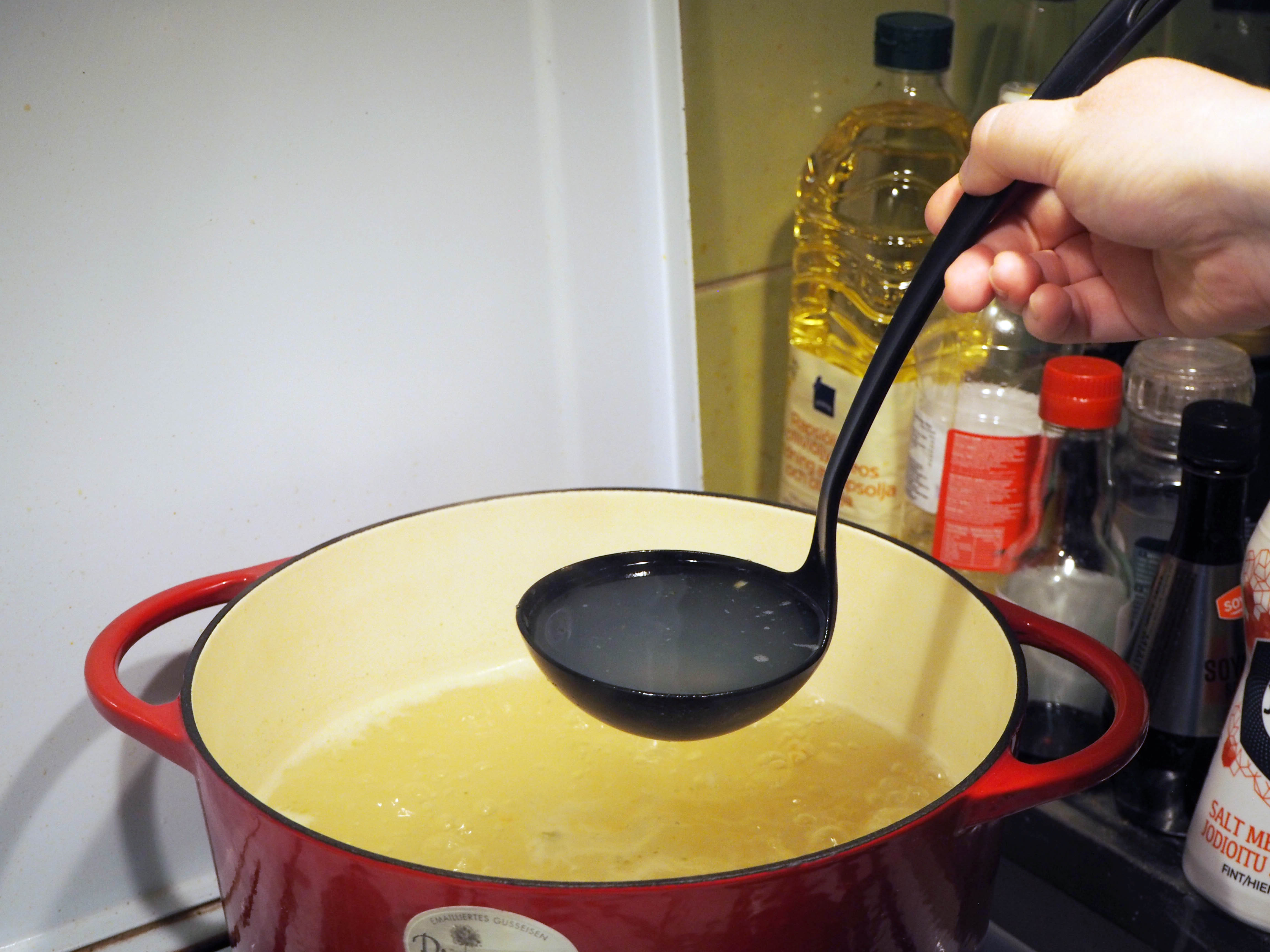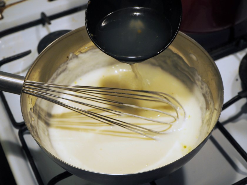 4. After cooking orzo for 10 minutes, take 2 ladles of orzo water and add it to the yoghurt mixture. Immediately whisk well. This step is essential; it helps keep the yoghurt mix well with the rest of the soup, so don’t skip it.