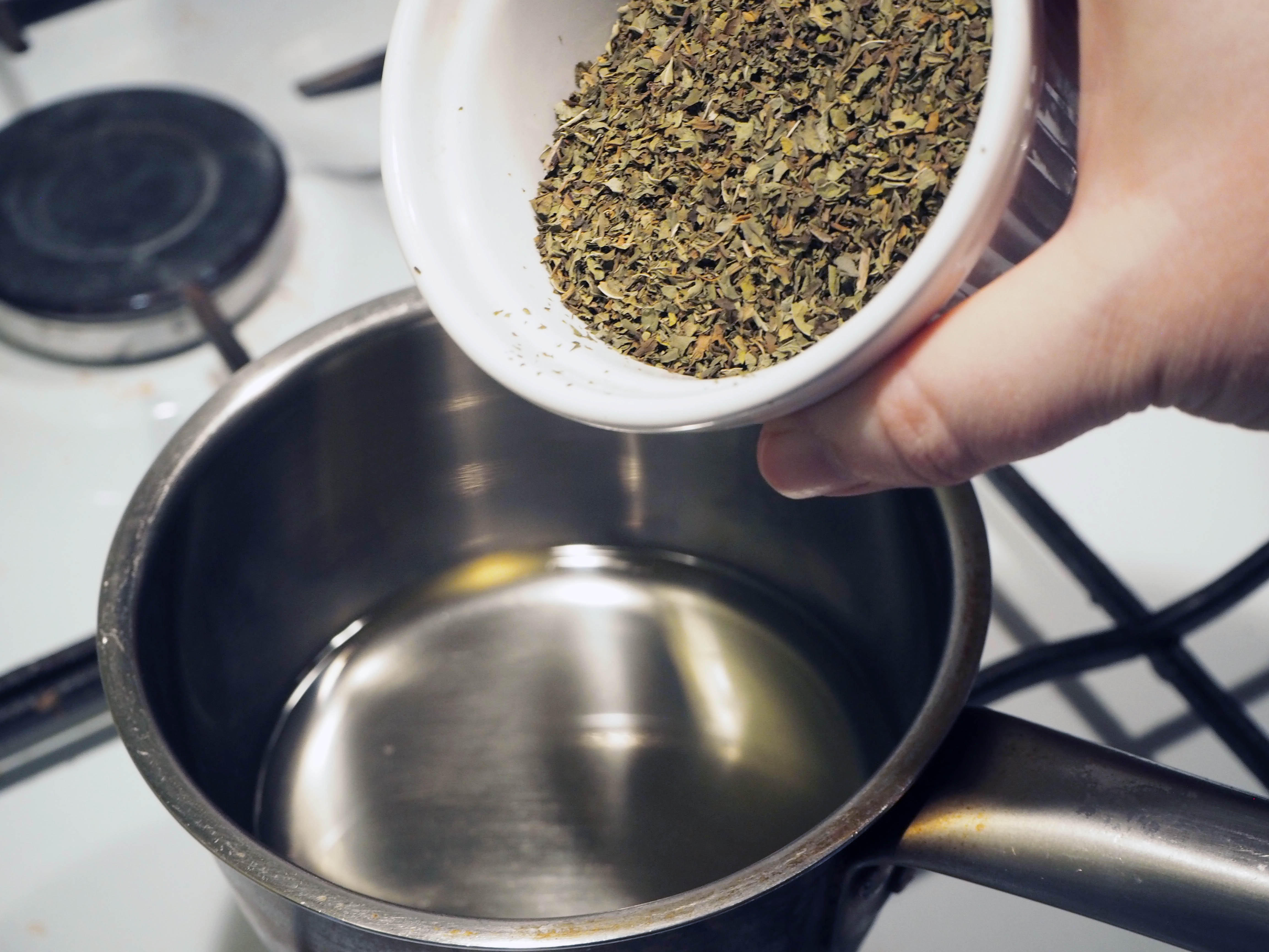 6. While the soup is cooking, put olive oil in a small saucepan and put it on medium heat. Let the oil warm up for 30 seconds, and then add the mint. Stir just until all the mint is covered with oil.
