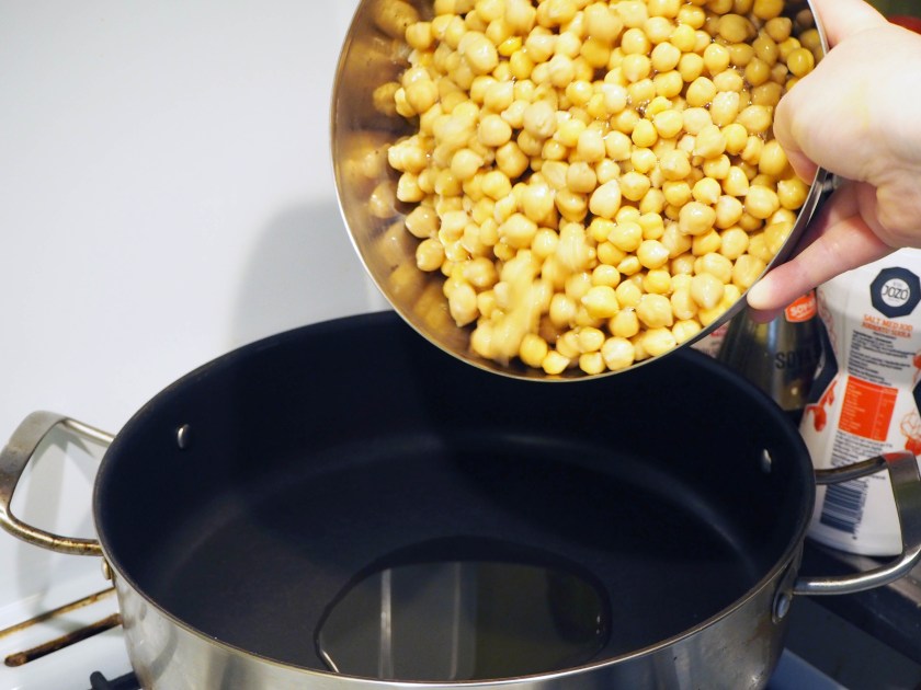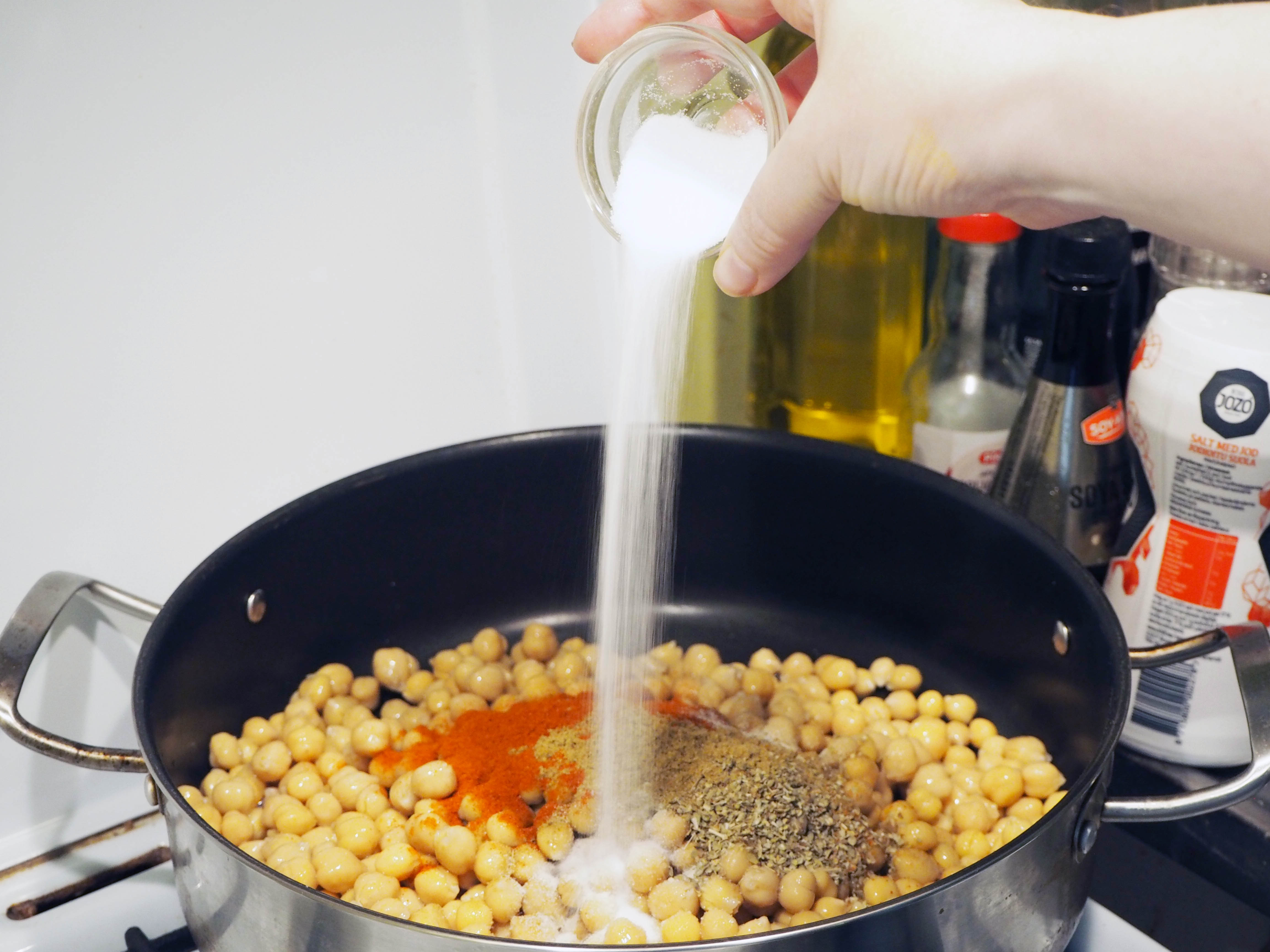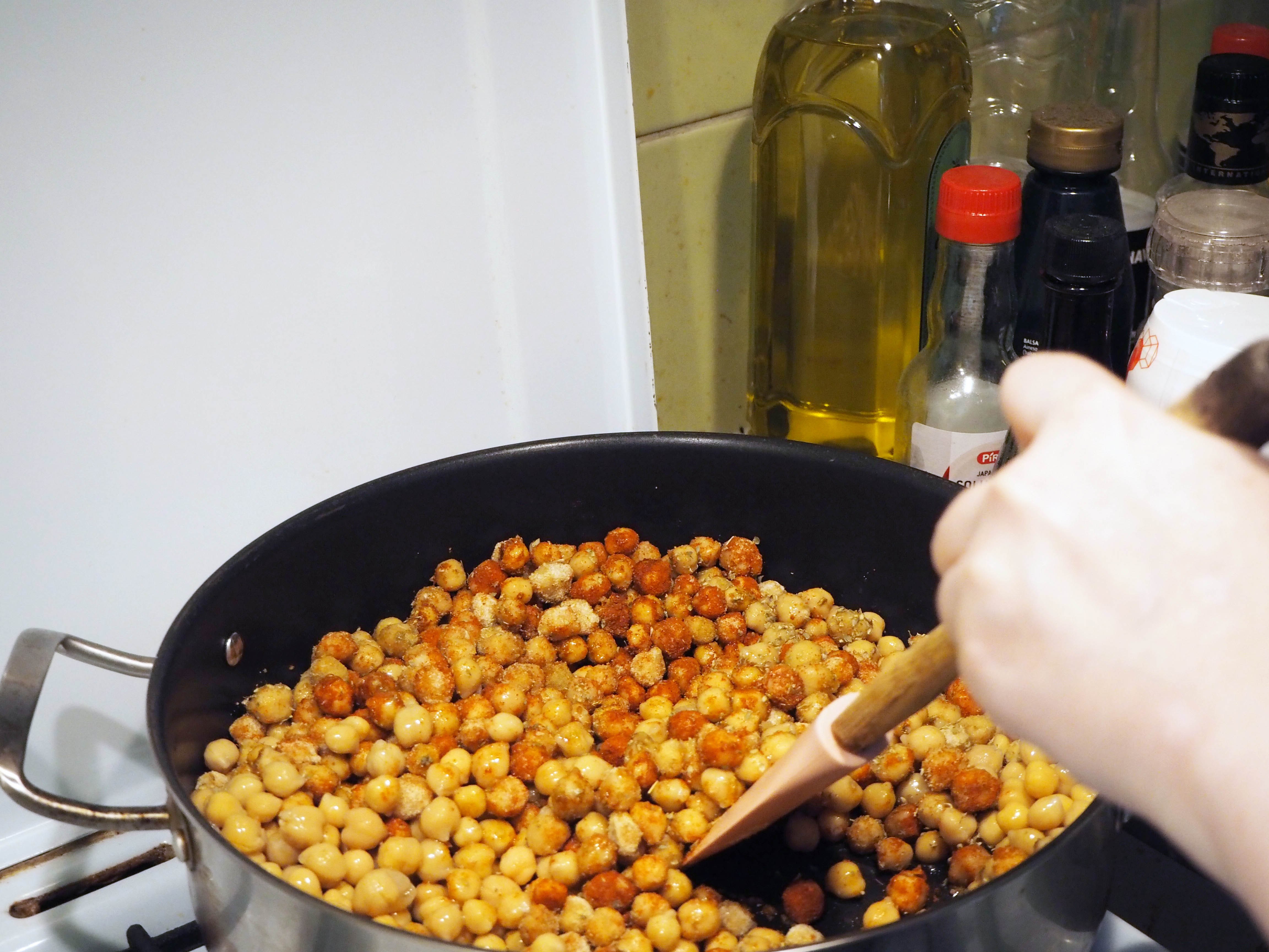 - In a large pan, put the first 7 ingredients above on medium-high heat. Stir-fry the chickpeas for a few minutes until all the pieces are covered with spices and oil. Take away from the heat when ready. You don’t need to keep the chickpeas on the heat for too long as they are already cooked.