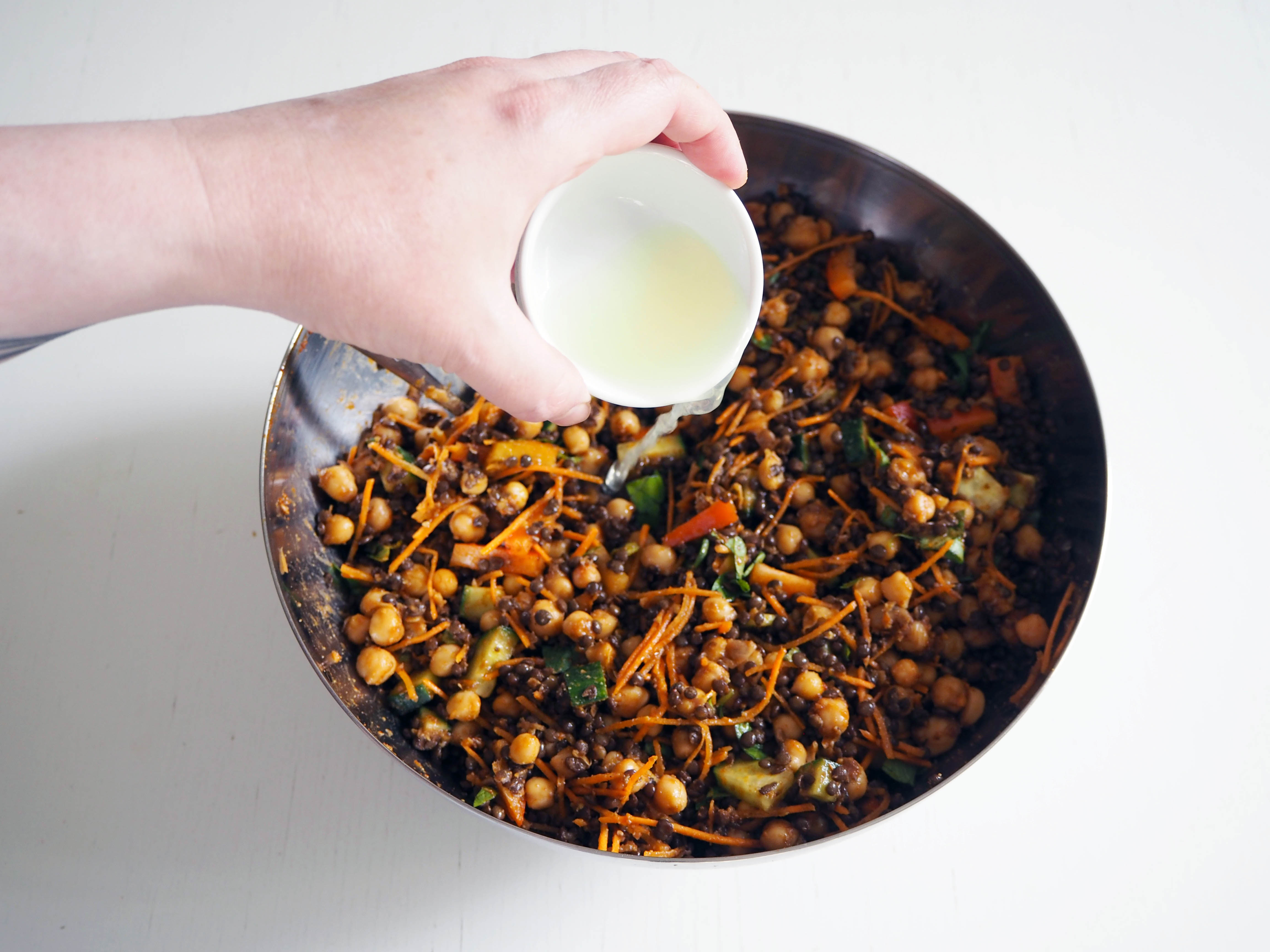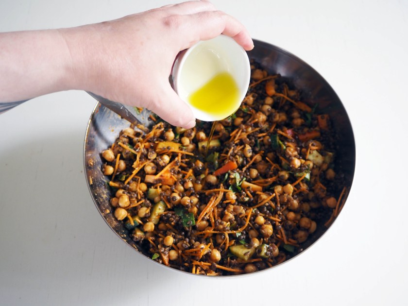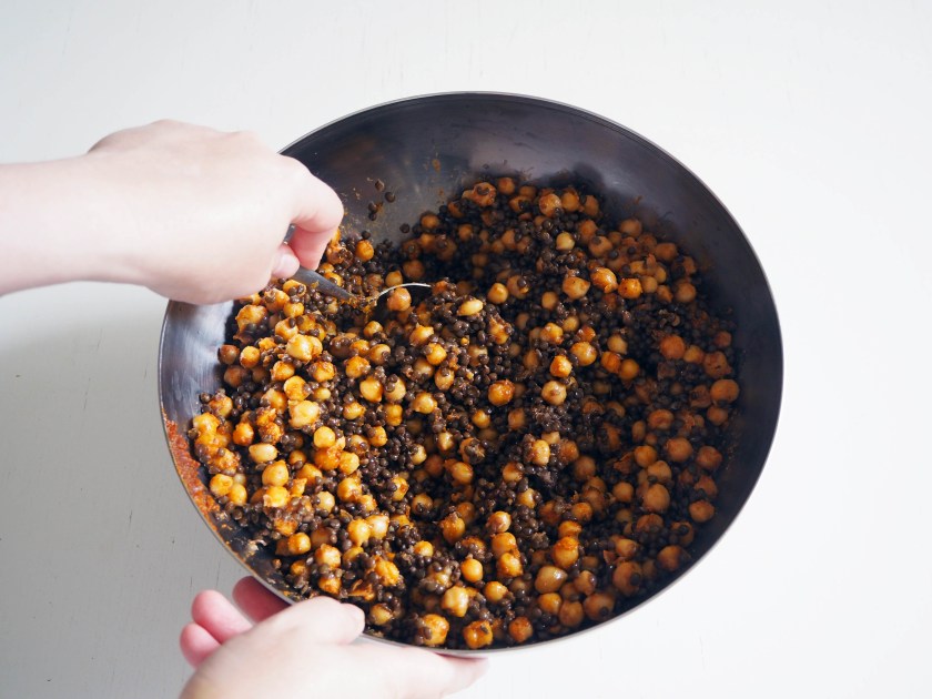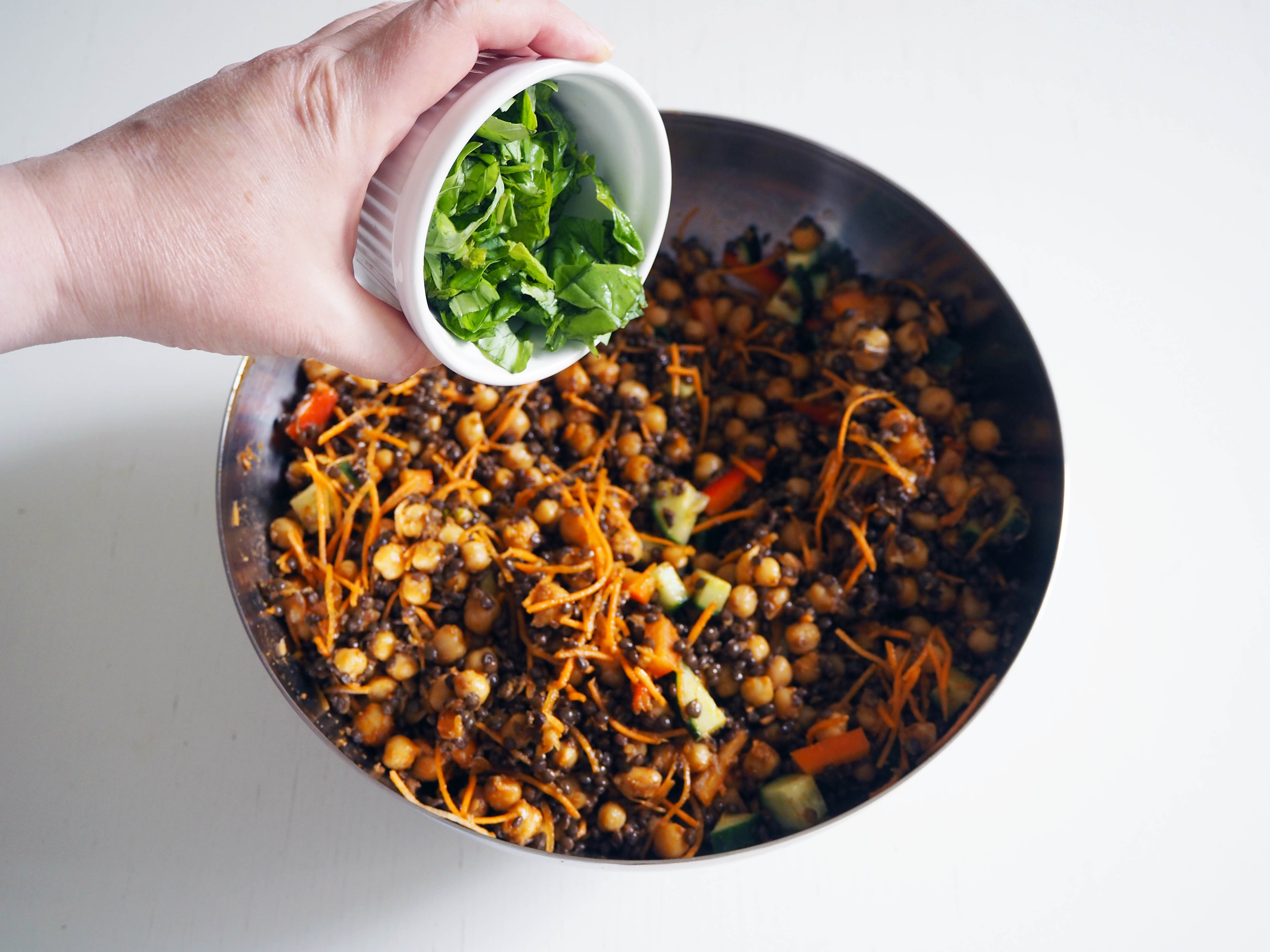 2. Put cooked lentils and spiced chickpeas in a large salad bowl and mix well.