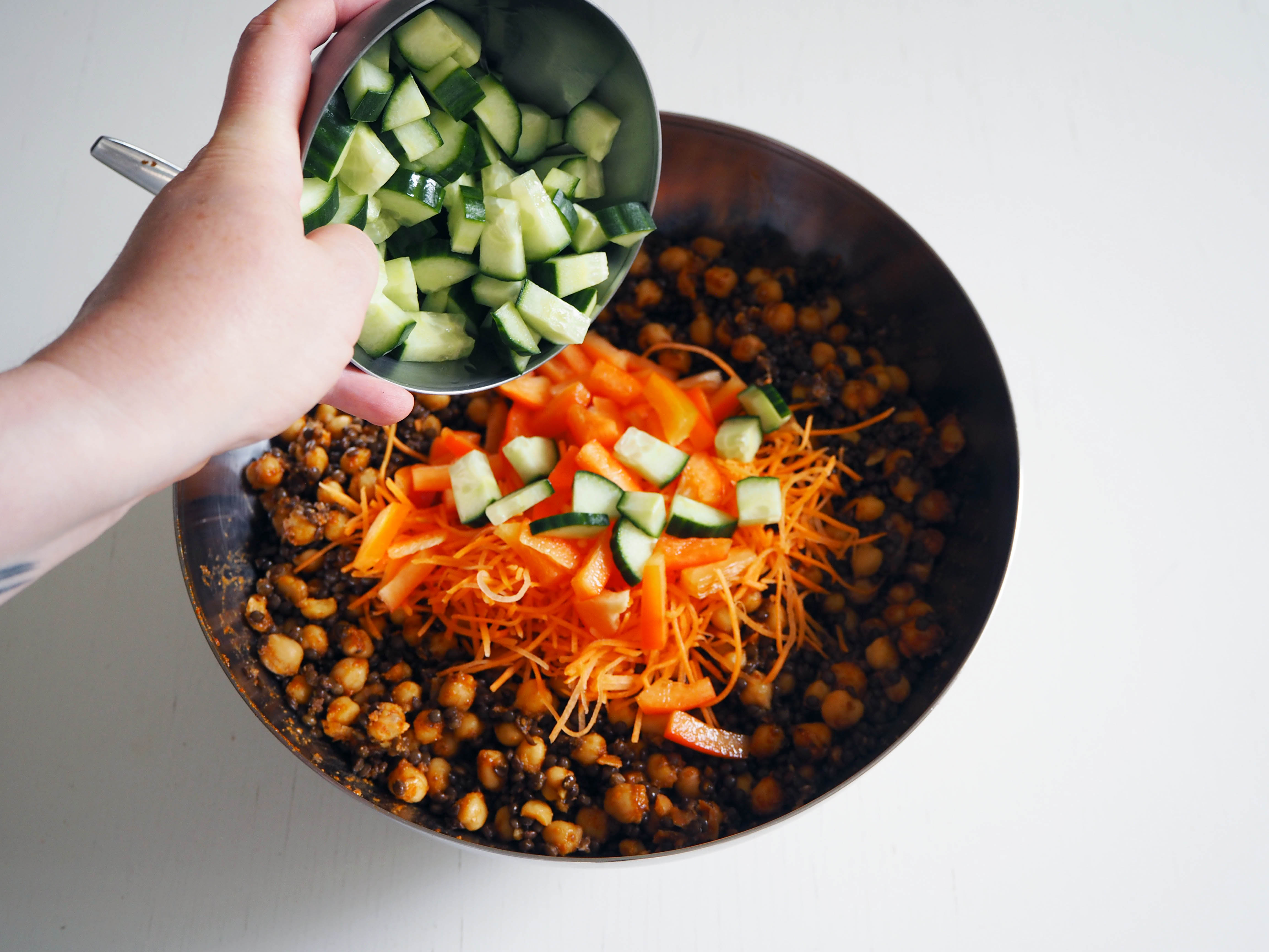3. Add carrots, bell pepper, cucumber and fresh herbs and mix well.